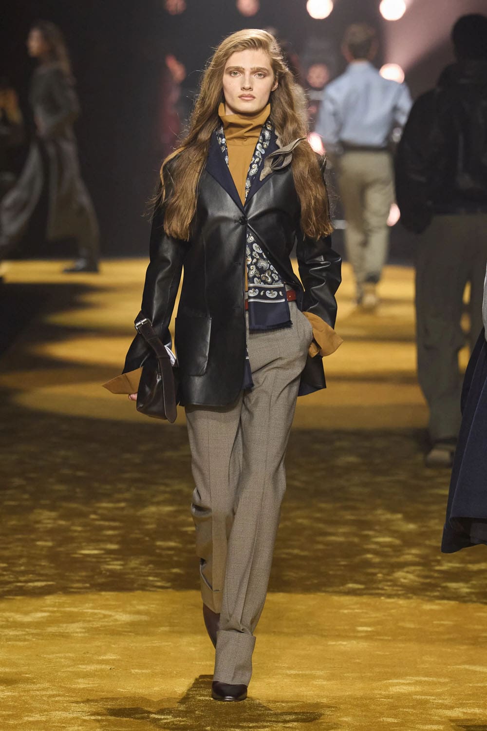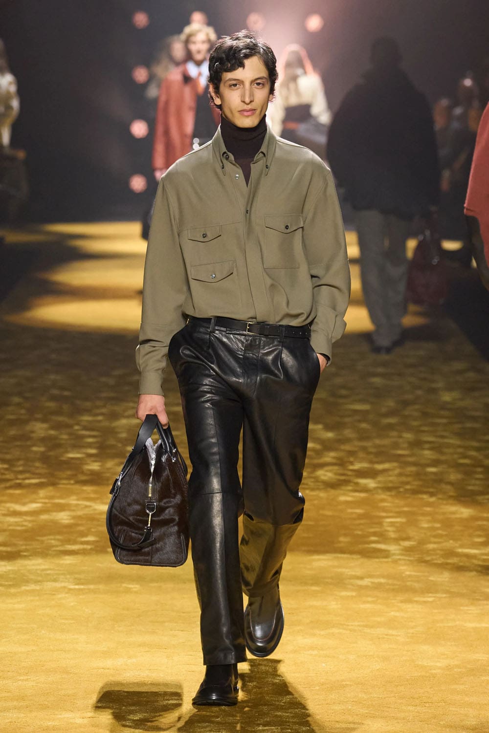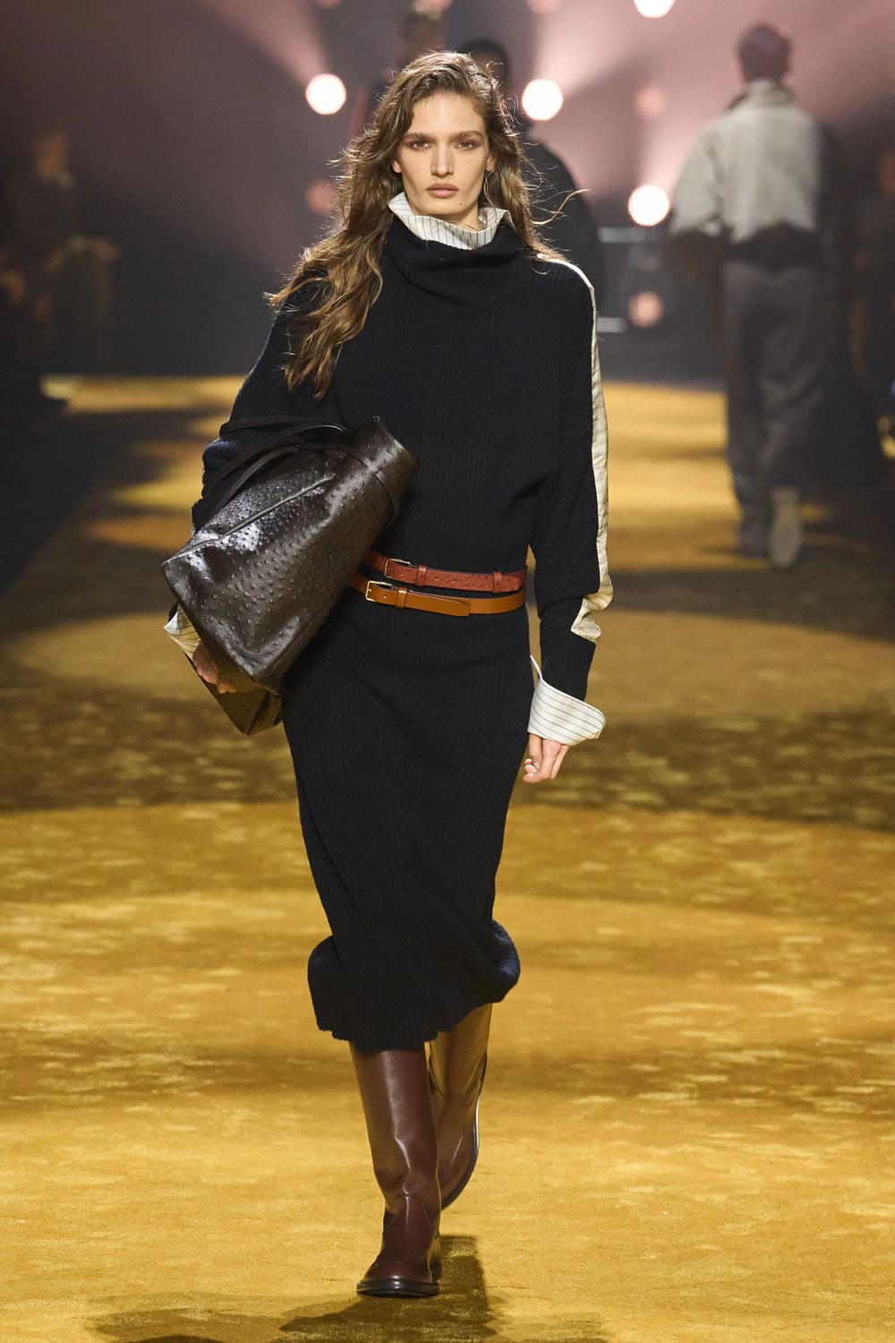 The runway opened with a quietly forceful gesture: a shirt-dress hybrid in muted wool, tailored with almost forensic precision. Carried effortlessly under the arm was a burnt-red coat, the kind of outerwear that signals intent rather than compliance. The dark riding boots grounded the silhouette, anchoring the collection’s equestrian undercurrent — less countryside nostalgia, more urban discipline.