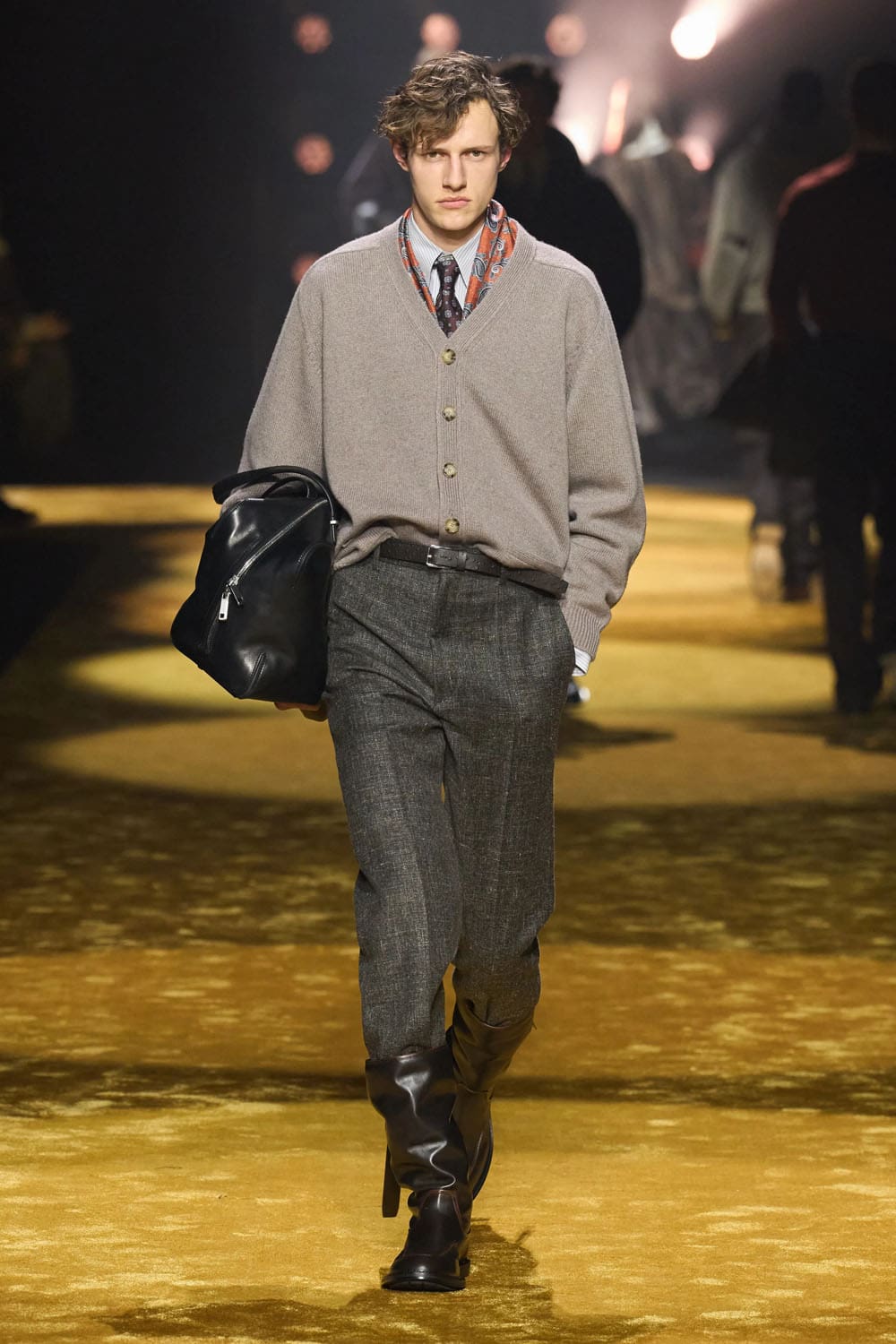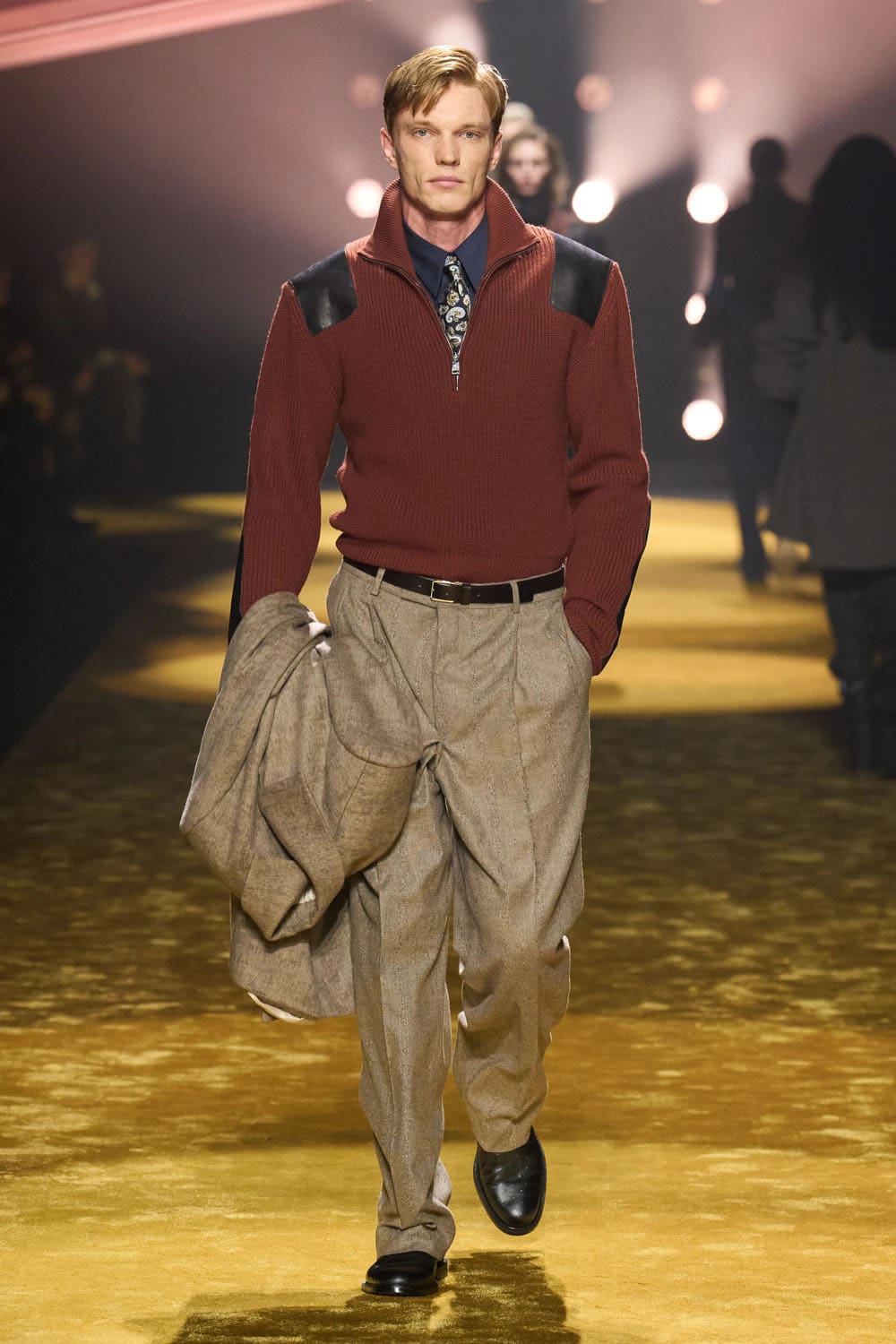 One of the collection’s most quietly persuasive moments arrives with a heavy ribbed sweater tucked into pale grey trousers. The sweater’s funnel neck softens the tailoring while the belted waist reasserts structure. Draped casually over the arm is a tweed coat, an echo of the opening look but recast with nonchalance — authority, apparently, can walk at its own pace.
