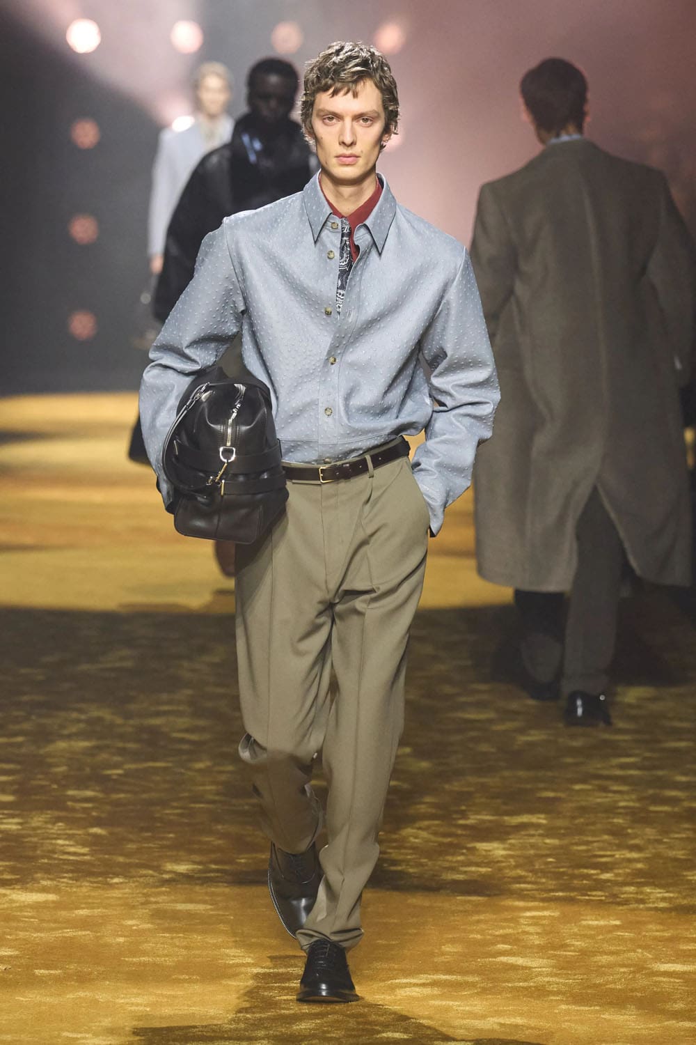 Falcioni leans heavily into double-breasted construction, but he does so with an architectural looseness. A khaki suit follows, clean-lined yet asymmetric in attitude. A silk pocket square — folded, not fluffed — reinforces the collection’s language of intentional imperfection. This is tailoring liberated from uniformity, yet still rigorously built.
