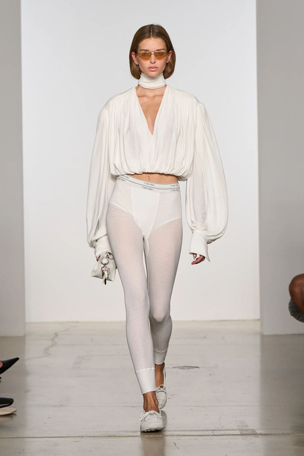 Leoni’s sophomore collection doesn’t whisper Calvin Klein. It screams it. In all caps. Repeatedly. On every visible inch of fabric. On the hips. Across the chest. Around the eyes. One might argue it’s less of a collection and more of a high-budget branding exercise — but then again, isn’t that the whole point?