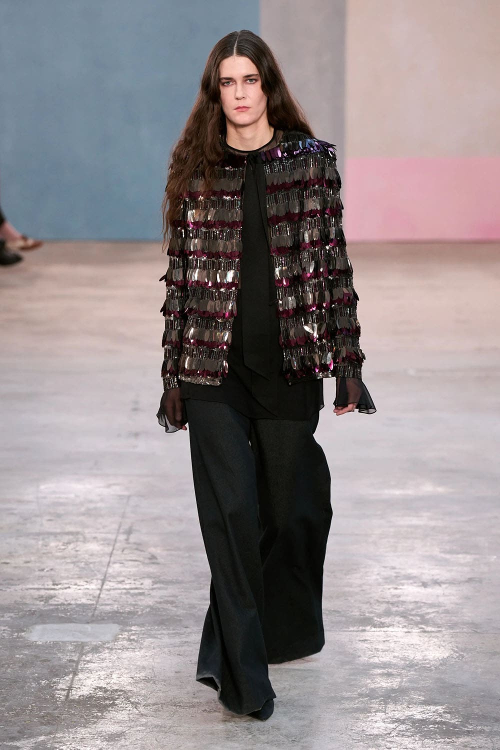 Eveningwear was reimagined for a different kind of night. Sequined knit sets offered the sparkle, minus the stiffness. A fringed tie-neck jacket, worn with black denim by Eliza Douglas, quietly closed the door on cocktail clichés.