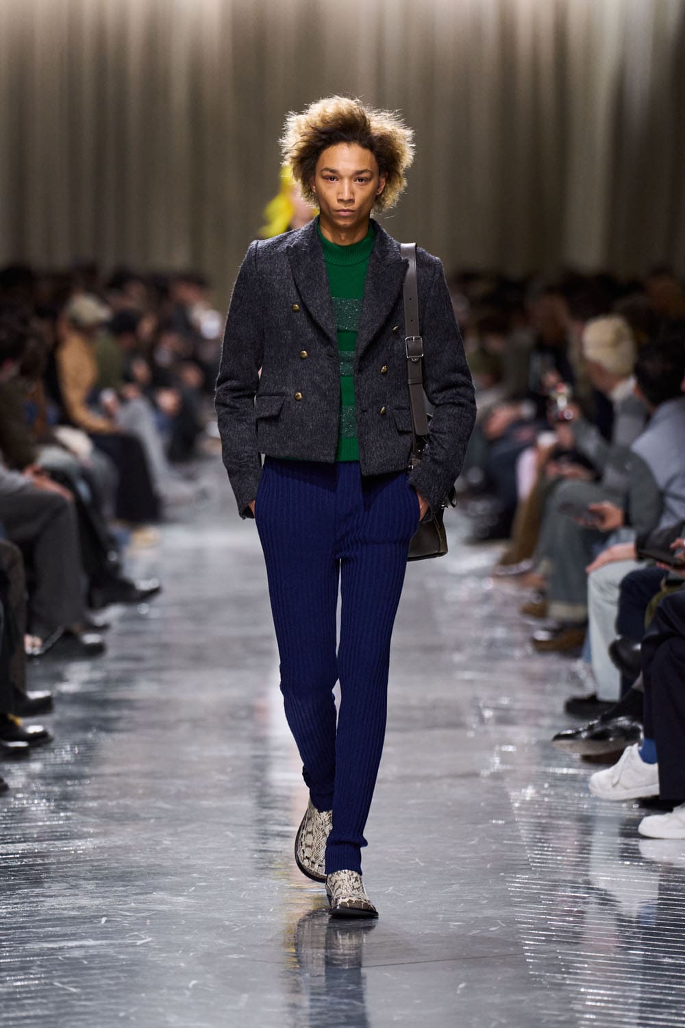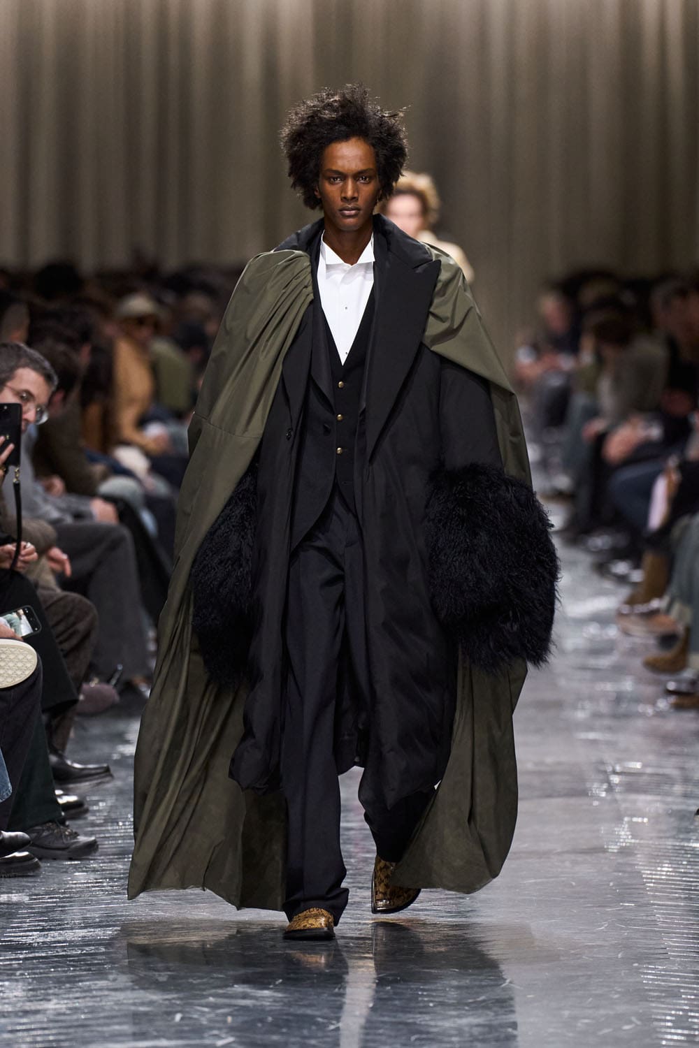 Now, on to the clothes. Imagine raiding your great-uncle’s closet, your mother’s attic trunk, and a party city costume rack — and wearing all of it. At once. We were treated to “mercilessly-shrunken blazers” (because what’s more luxurious than discomfort?), balloon-backed field jackets (for the man who wants to cosplay as a hot air balloon), and long johns replacing trousers (because nothing says haute couture like thermal underwear in public).