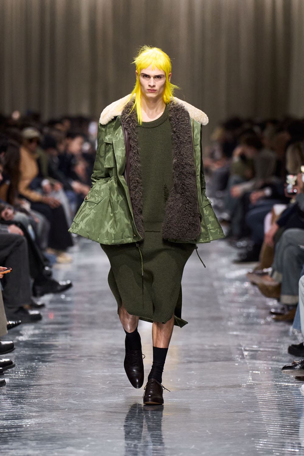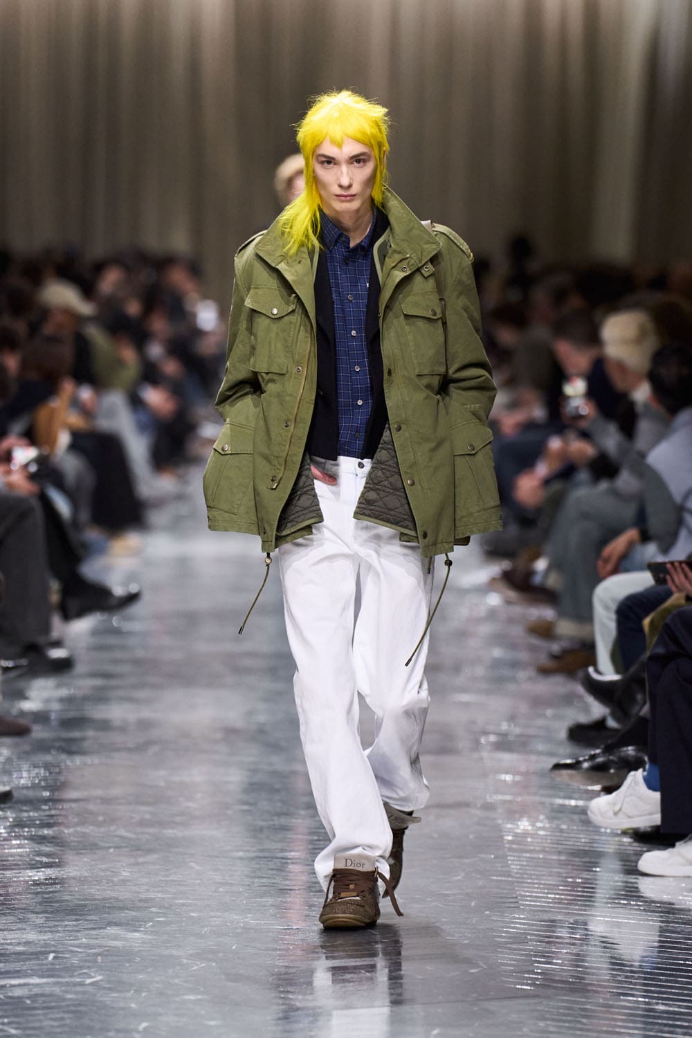Look three: a military parka, oversized and exhausted, attempting to cosplay a Dior silhouette — but ending up as a rejected look from a forgotten Hunger Games district. Paired with what appears to be grandma’s ribbed tights and plumber chic white clogs, the model trudges down the runway like a draft-dodger from a 1980s fashion apocalypse.