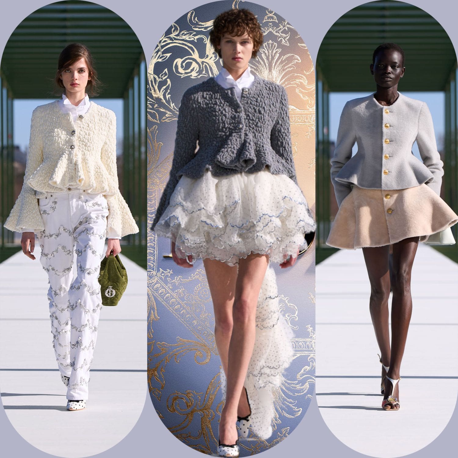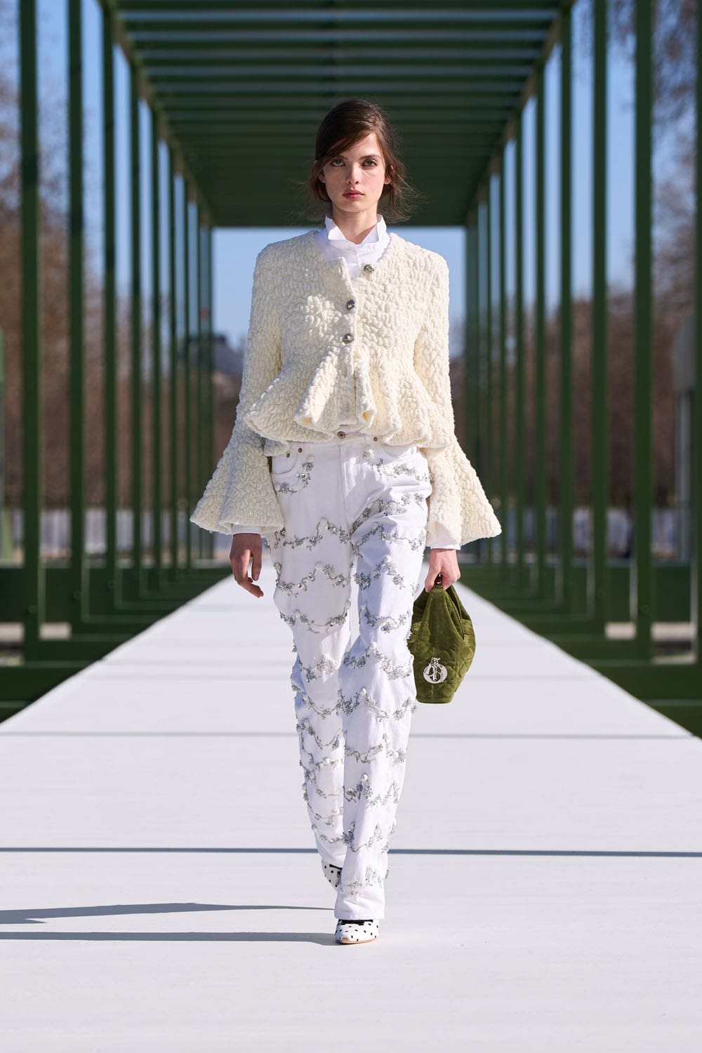 The silhouette with the ivory jacket and white trousers reads like a modern reinterpretation of Dior’s Bar suit — still cinched, still sculpted, but rendered in textures that mimic snow-covered hedges rather than strict tailoring. It is an homage softened by Anderson’s instinct for movement.