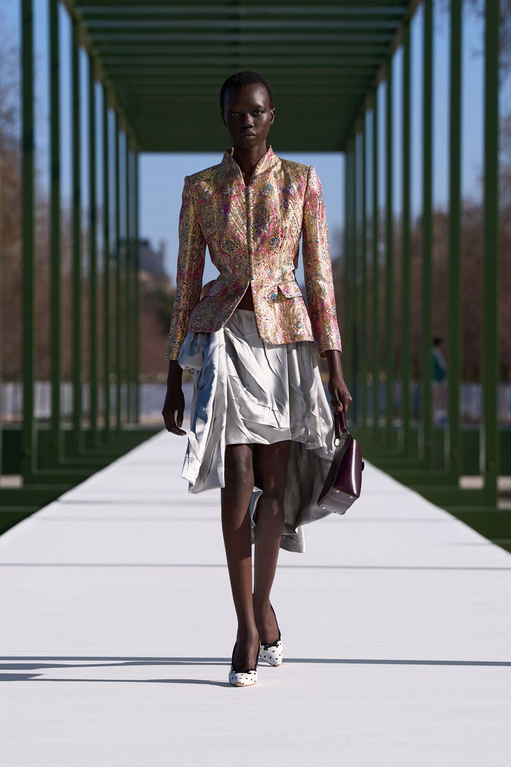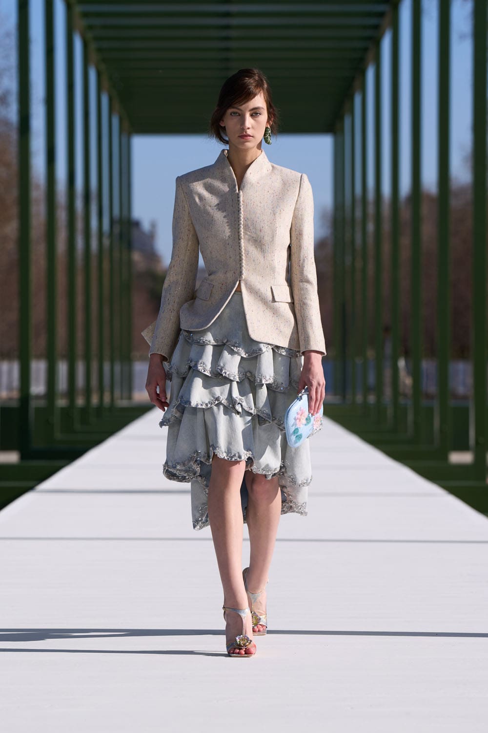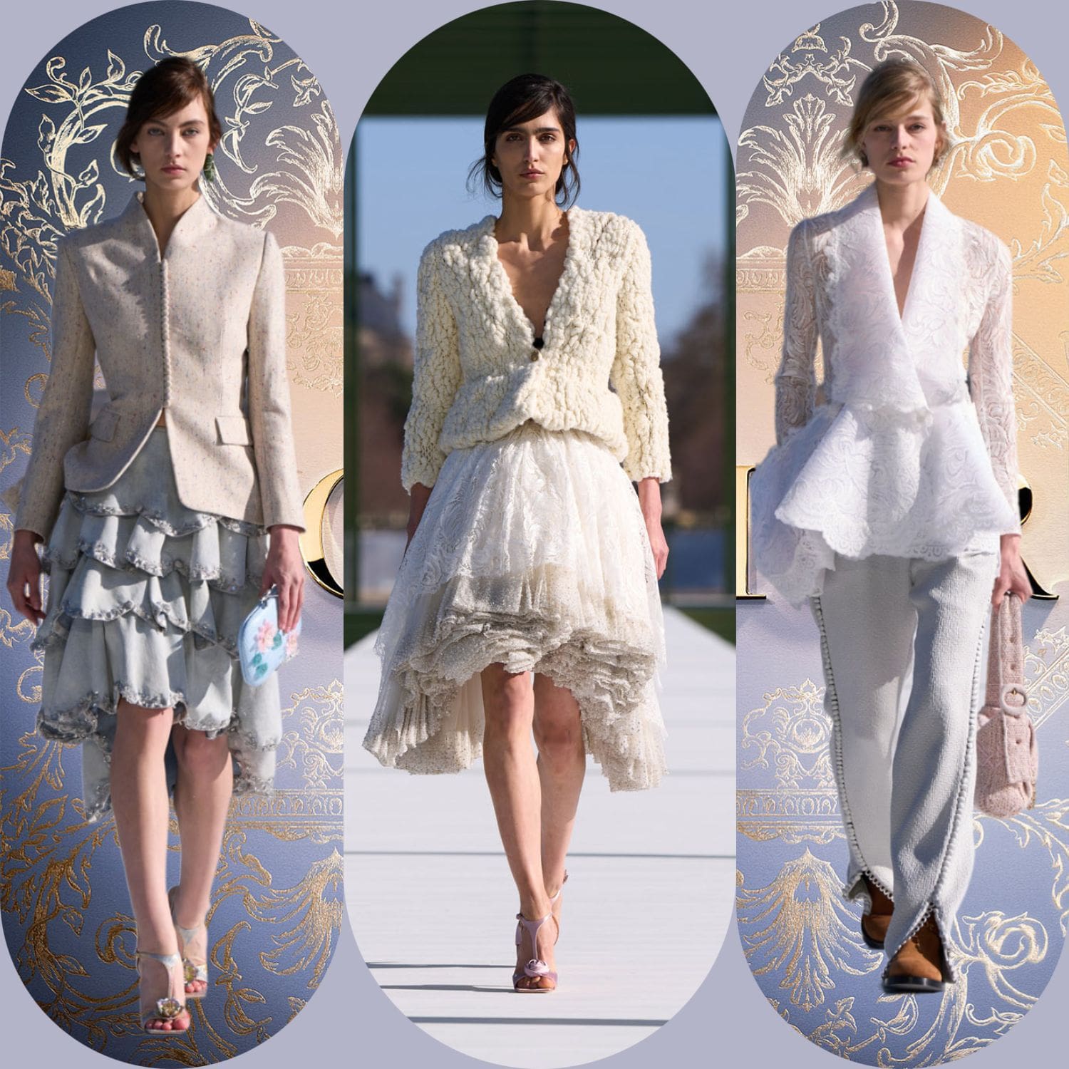 Grey and cream layers fall in uneven cascades, trimmed with micro-lace, giving the impression of flowers cresting just before bloom. The proportions are short in front, elongated behind, turning each model into a moving axis of asymmetry. Dior’s historical attachment to the promenade becomes literal.