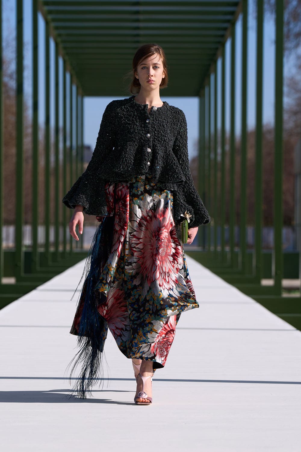 The collection opens with structured jackets paired with ruffled skirts that descend in fountains of tulle, evoking Radclyffe Hall’s imagery of spray and rainbowed mist. Anderson treats the walk through the park as a procession — a moment when ordinary steps acquire theatrical weight.