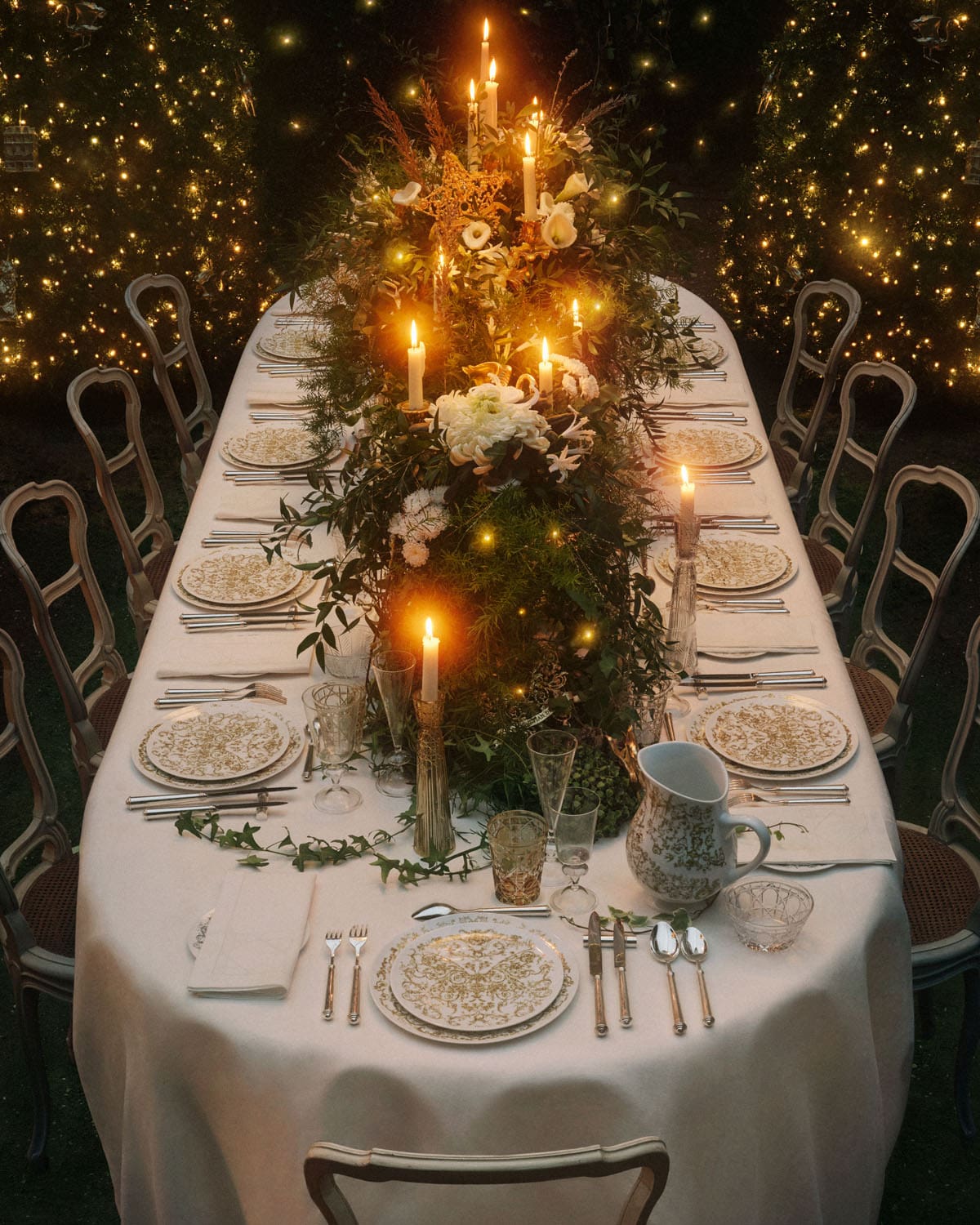 Then comes the banquet — not staged for admiration, but glowing as if summoned by charm alone. Light pools around Dior’s talismans, objects, and symbols, binding together ready-to-wear, watches, jewelry, tableware, and children’s silhouettes into a single, improbable constellation. Categories dissolve. Everything belongs, precisely because nothing is ranked.