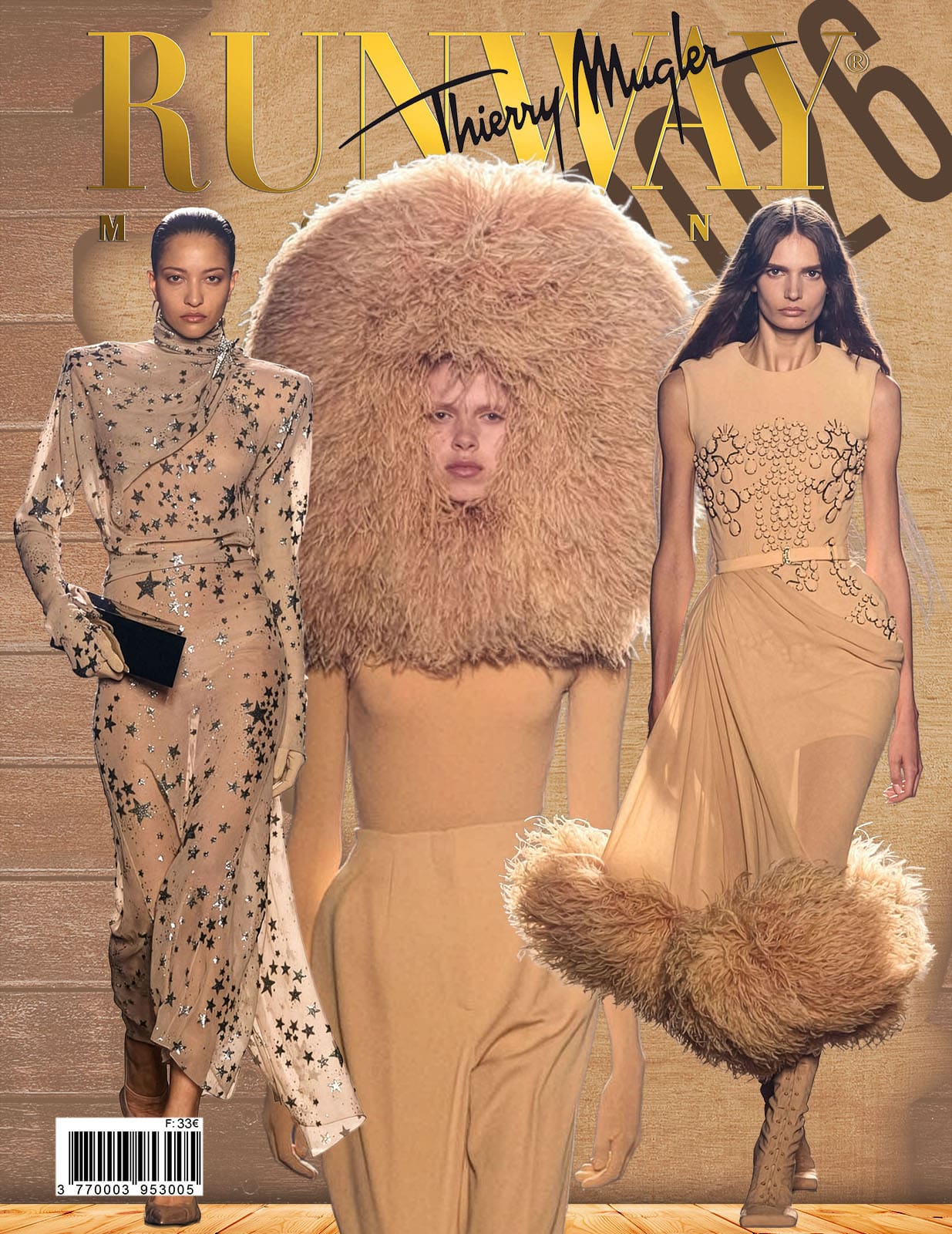 The collection builds momentum in groups, much like musical phrases. A trio of sandy-beige ensembles — shearling-trimmed bomber, tailored suit, belted coat — walk together with calm authority. The blue denim shirts anchor the palette, while olive accessories inject unexpected modernity. It’s a demonstration of how Armani can orchestrate harmony without uniformity.