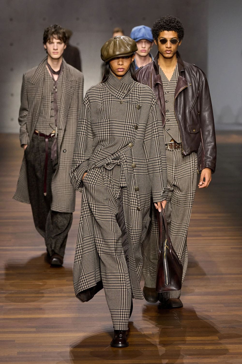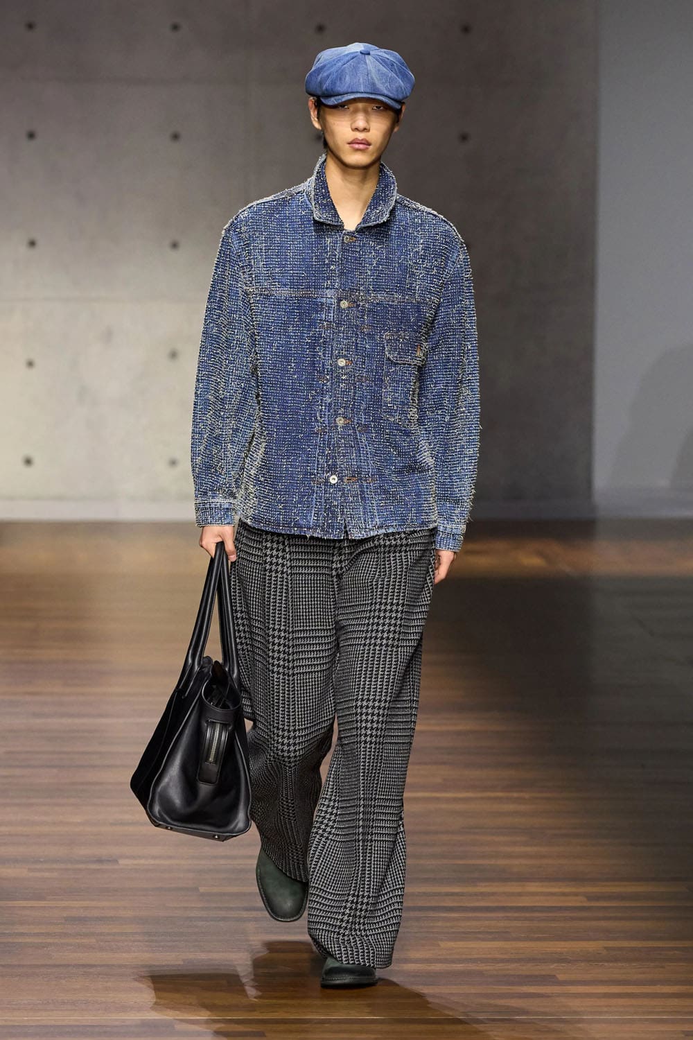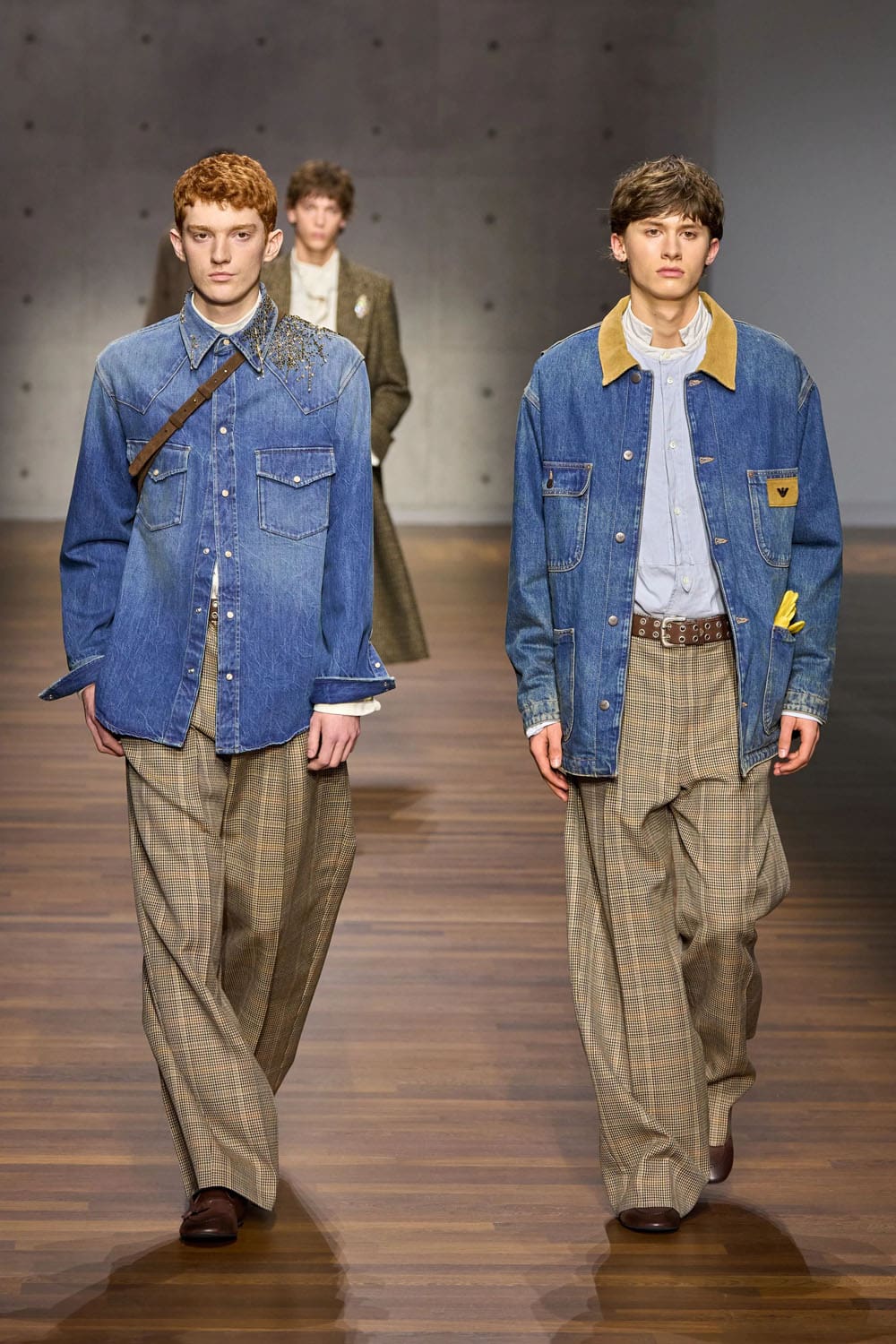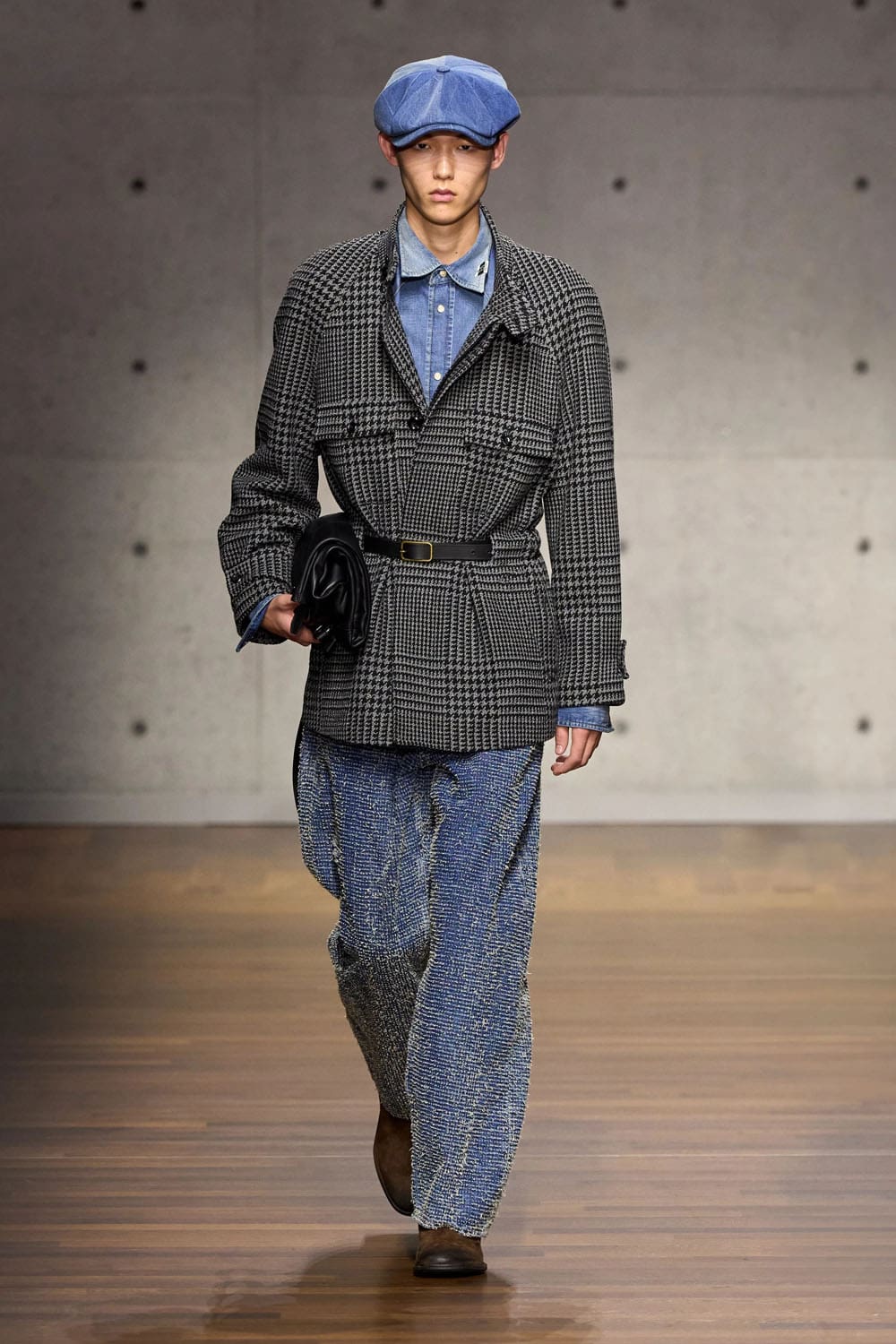 Then comes the reimagined heritage moment: denim treated not as casual wear, but as craft. A denim shirt layered beneath a belted houndstooth coat shifts the garment into new territory — British outerwear traditions translated through Italian tailoring discipline. The trousers, loose and textured, complete a look that balances ruggedness with refinement.