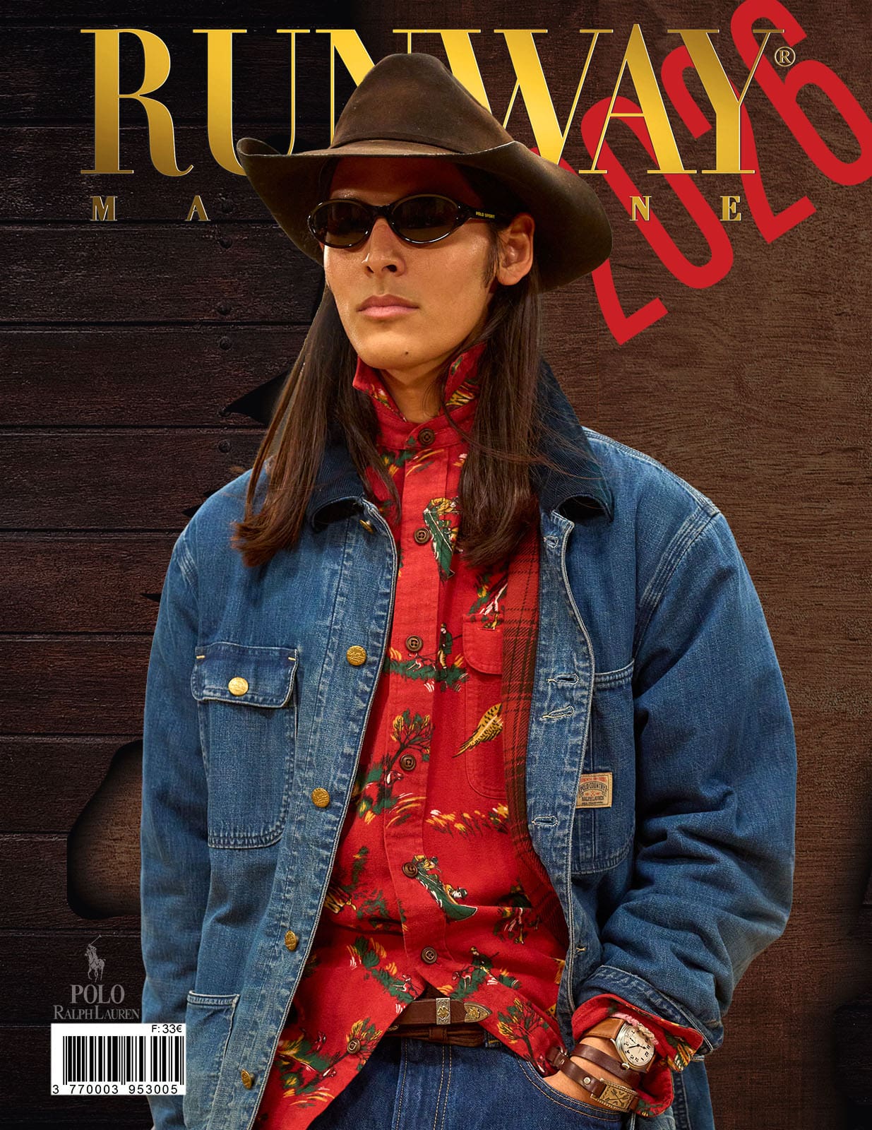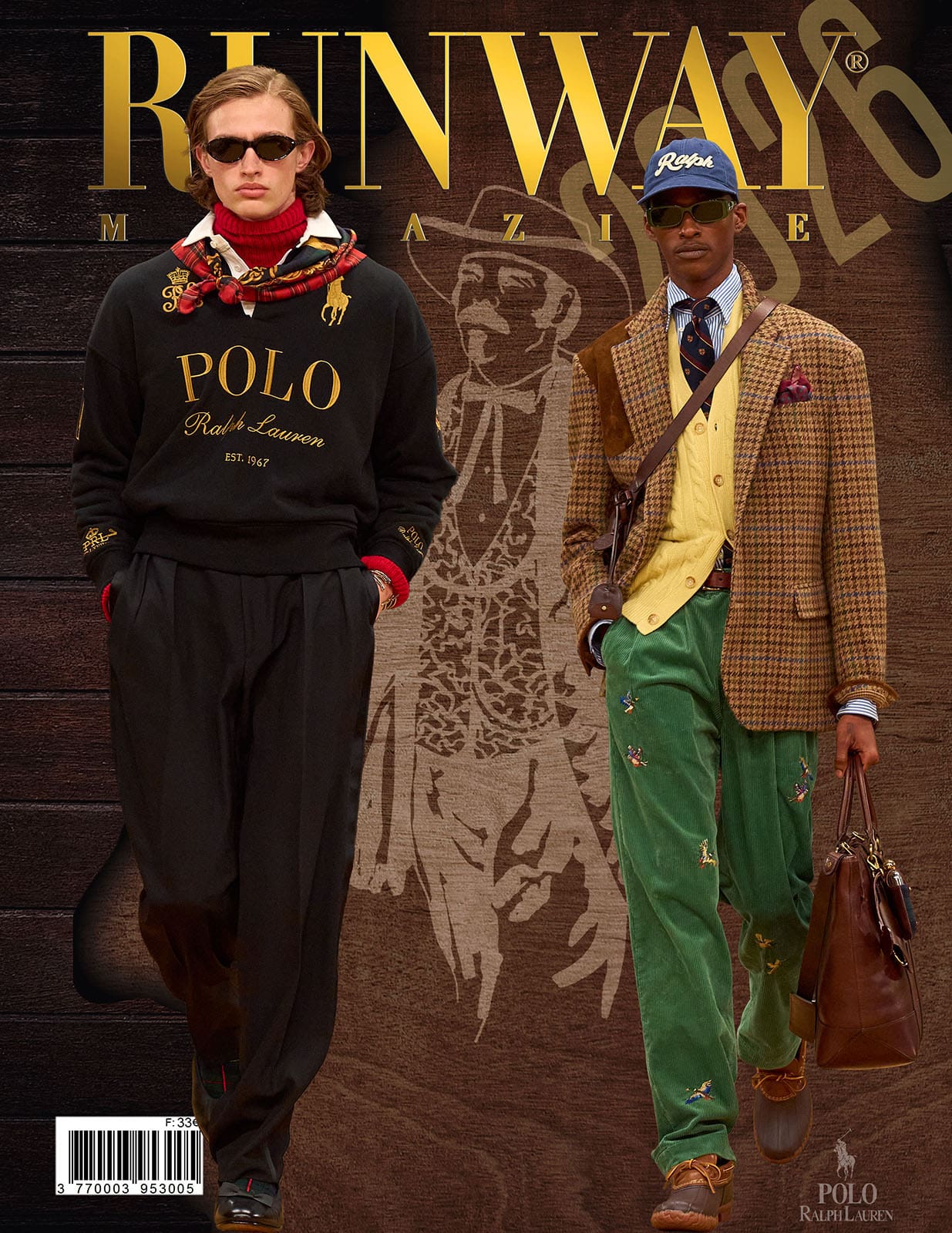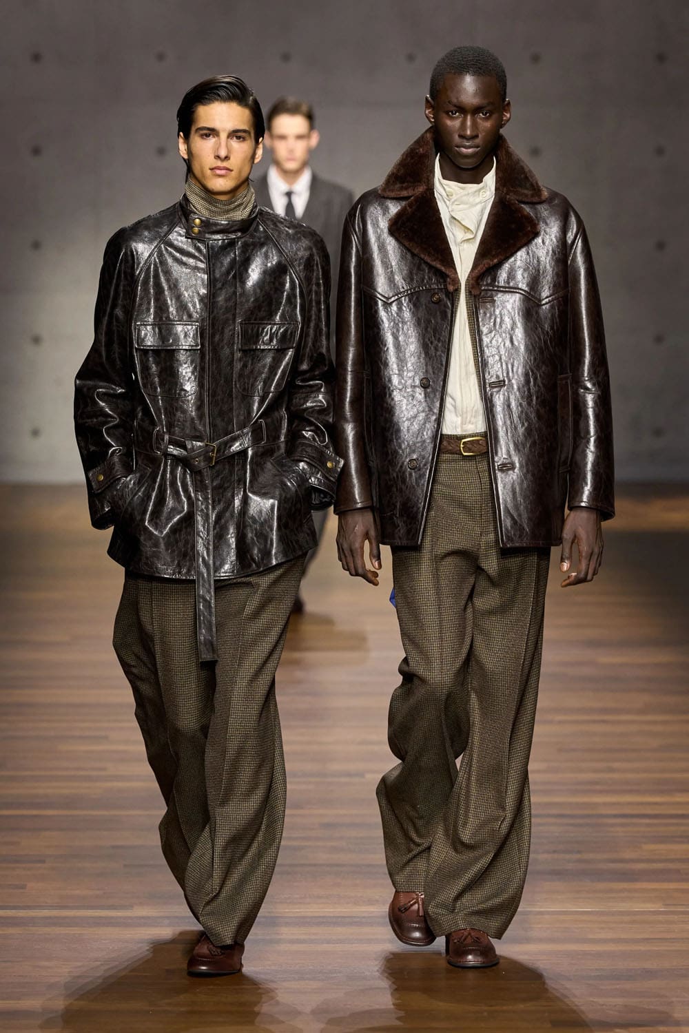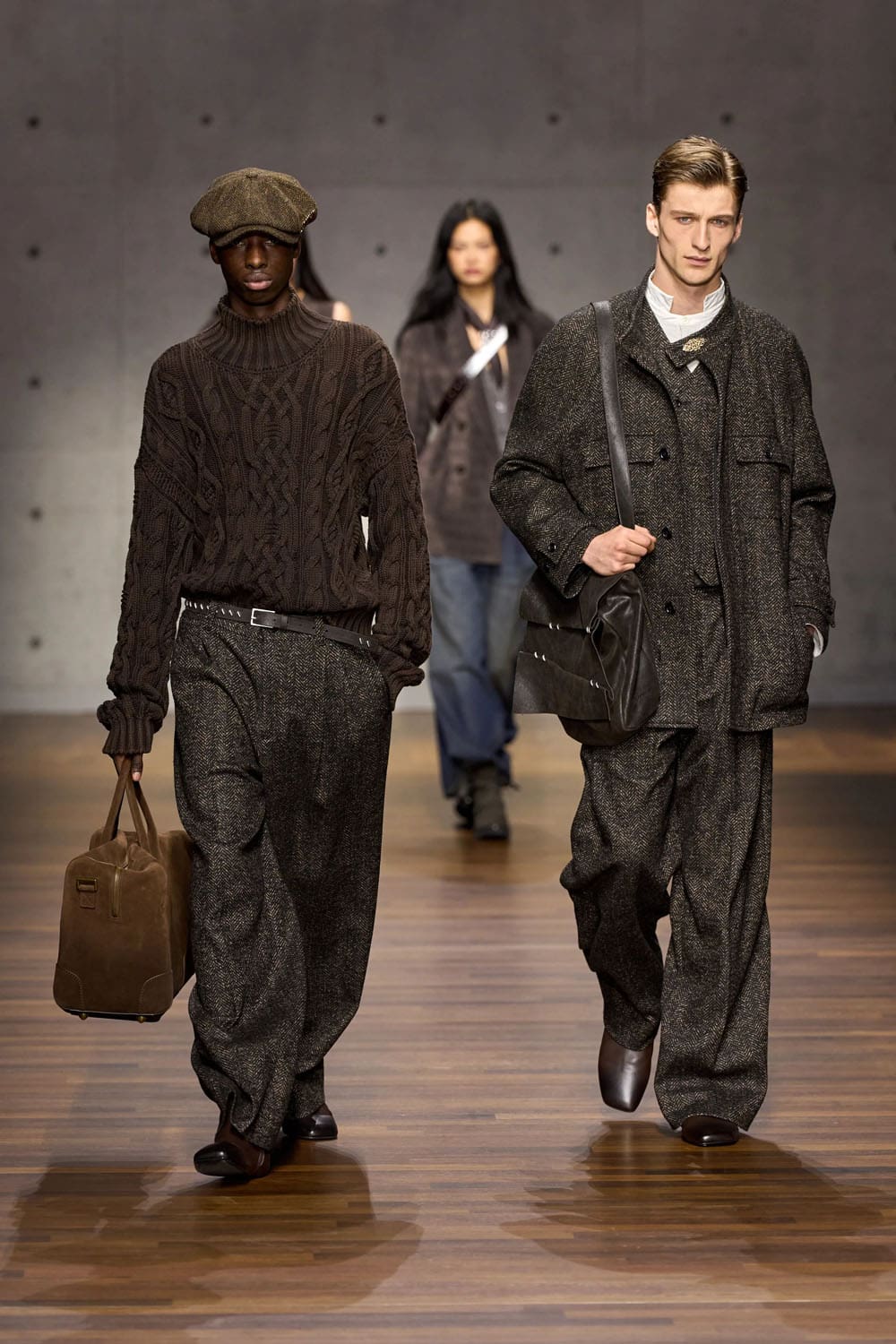 Then comes the reimagined heritage moment: denim treated not as casual wear, but as craft. A denim shirt layered beneath a belted houndstooth coat shifts the garment into new territory — British outerwear traditions translated through Italian tailoring discipline. The trousers, loose and textured, complete a look that balances ruggedness with refinement.