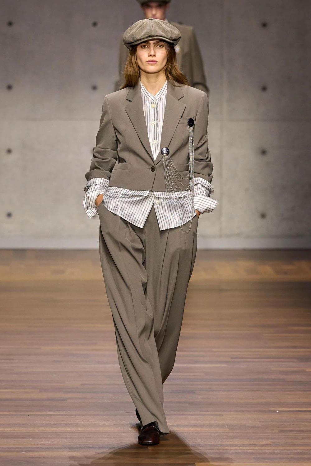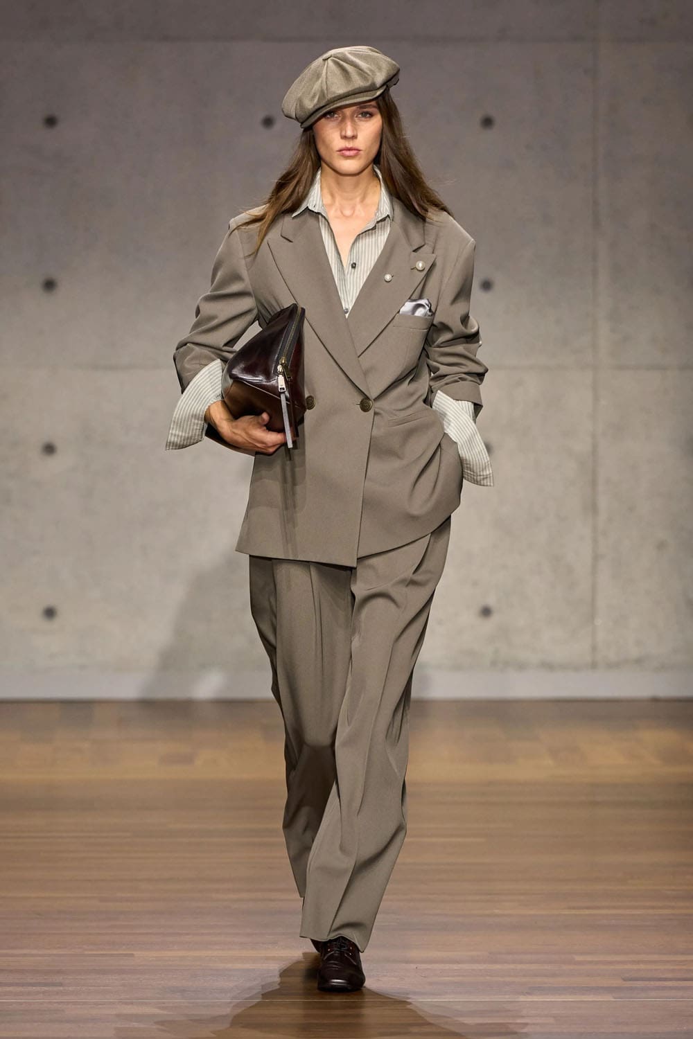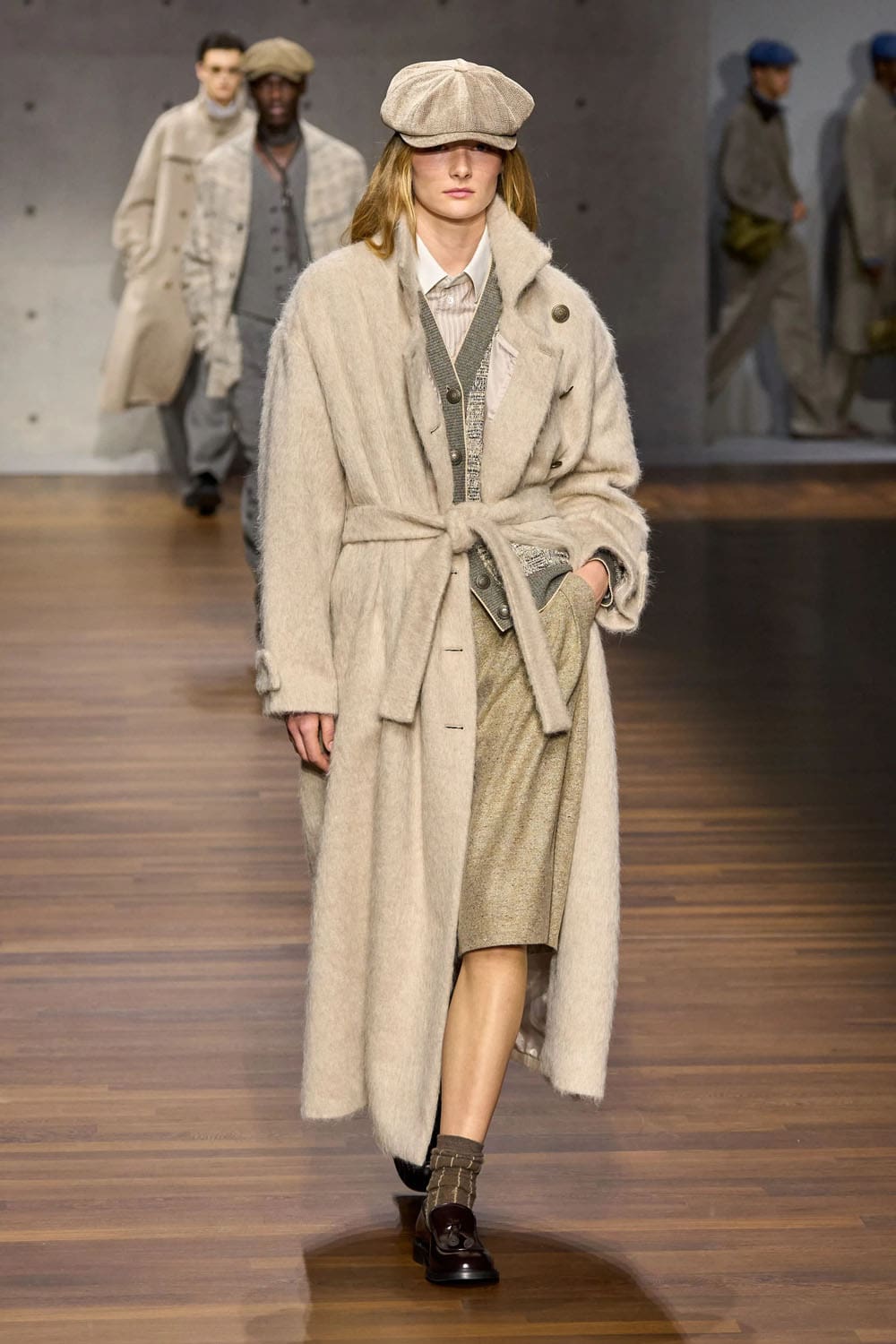The opening look sets the tempo: a boyish newsboy cap, a sharp jacket, and pleated shorts layered over long ribbed socks. It’s youthful, clever, and perfectly calibrated — a study in proportion rather than nostalgia. The double-breasted construction remains crisp, but the fabrics soften the edges; Armani’s urban sensitivity emerges in the slouch of the pocket, the swing of the hem.