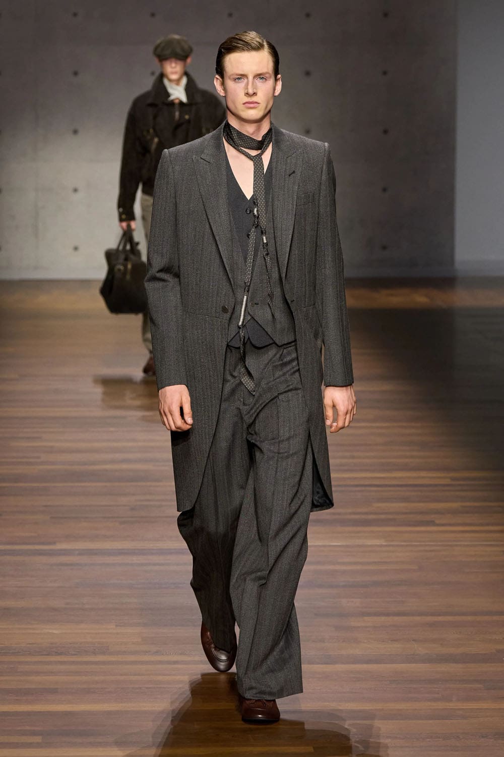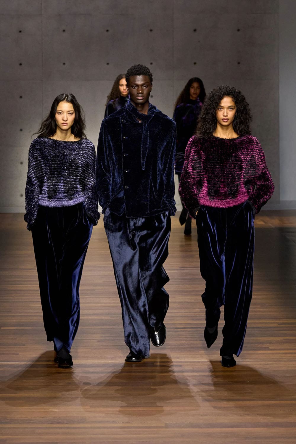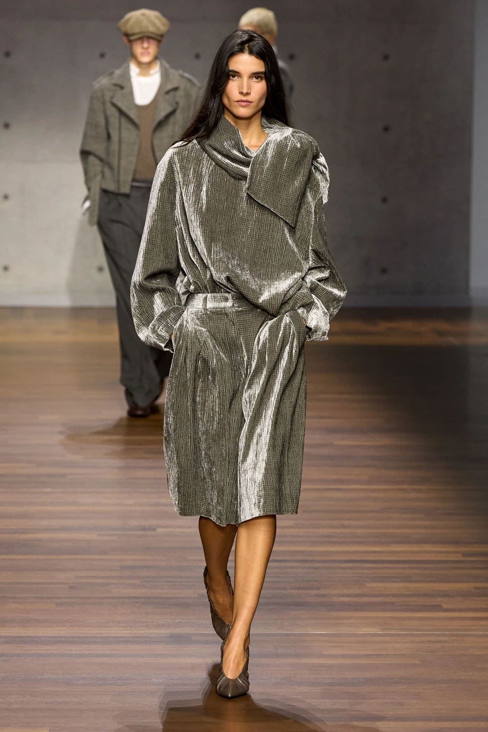 Texture plays an early solo. A grey velvet shirt and matching wide trousers glide down the runway, the pile catching light with the quiet confidence of an evening piano étude. The silhouette is relaxed yet structured, an interplay between formality and ease — Armani’s signature duality, interpreted through new hands.
