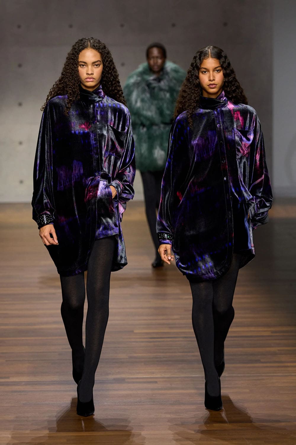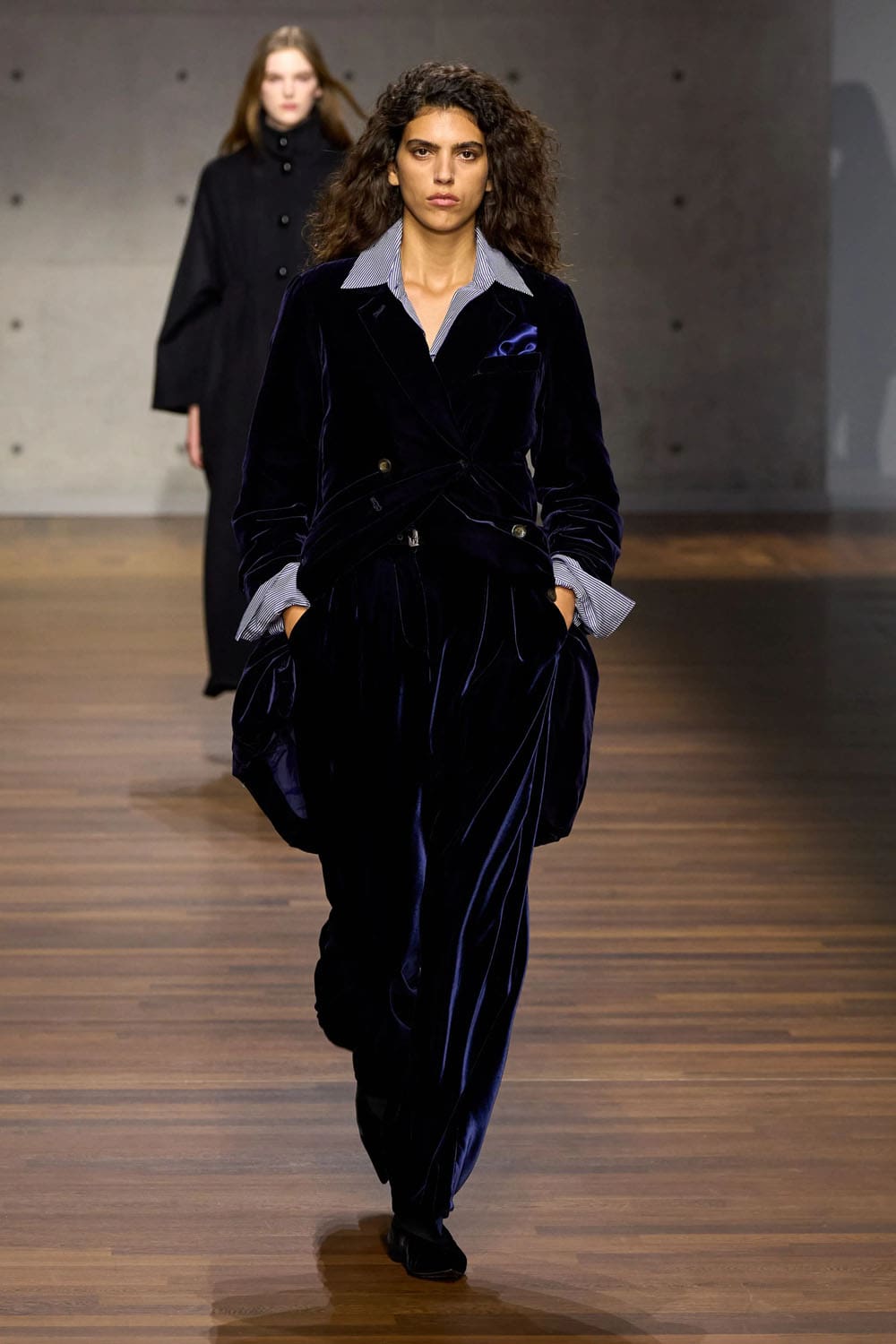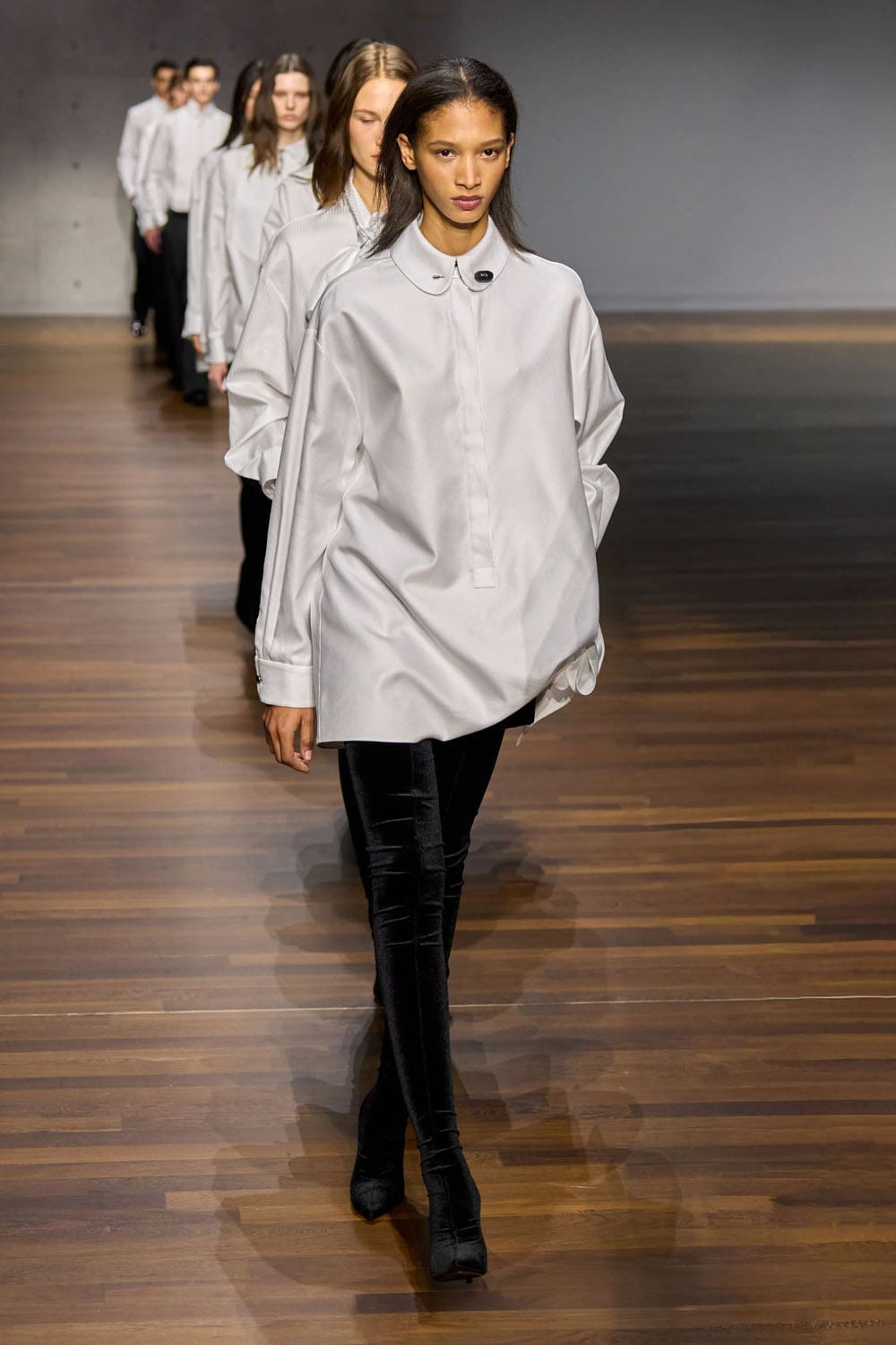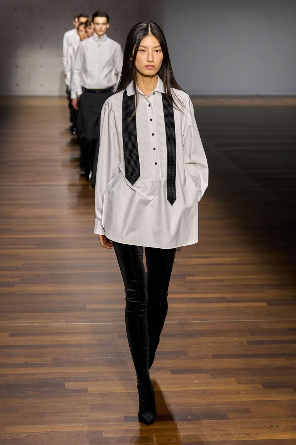 Texture plays an early solo. A grey velvet shirt and matching wide trousers glide down the runway, the pile catching light with the quiet confidence of an evening piano étude. The silhouette is relaxed yet structured, an interplay between formality and ease — Armani’s signature duality, interpreted through new hands.