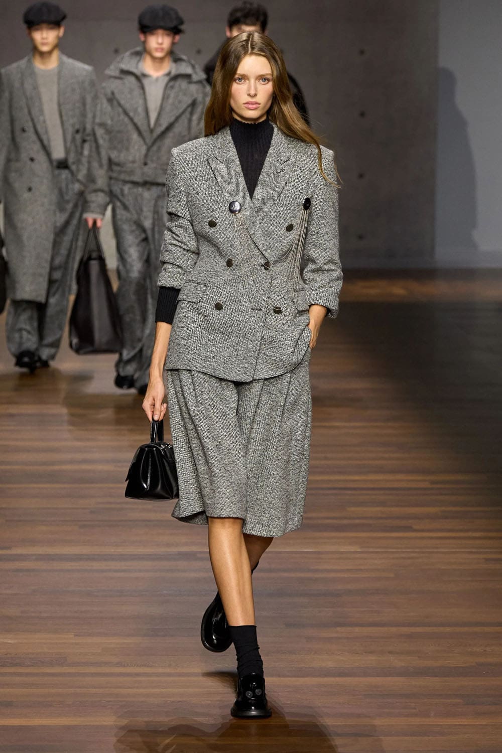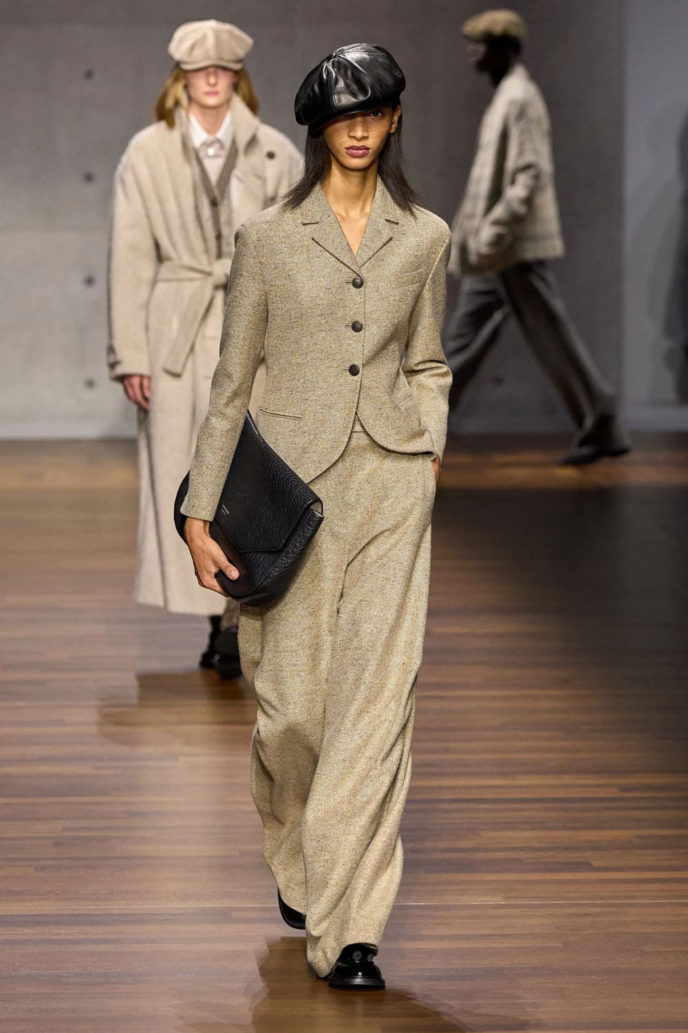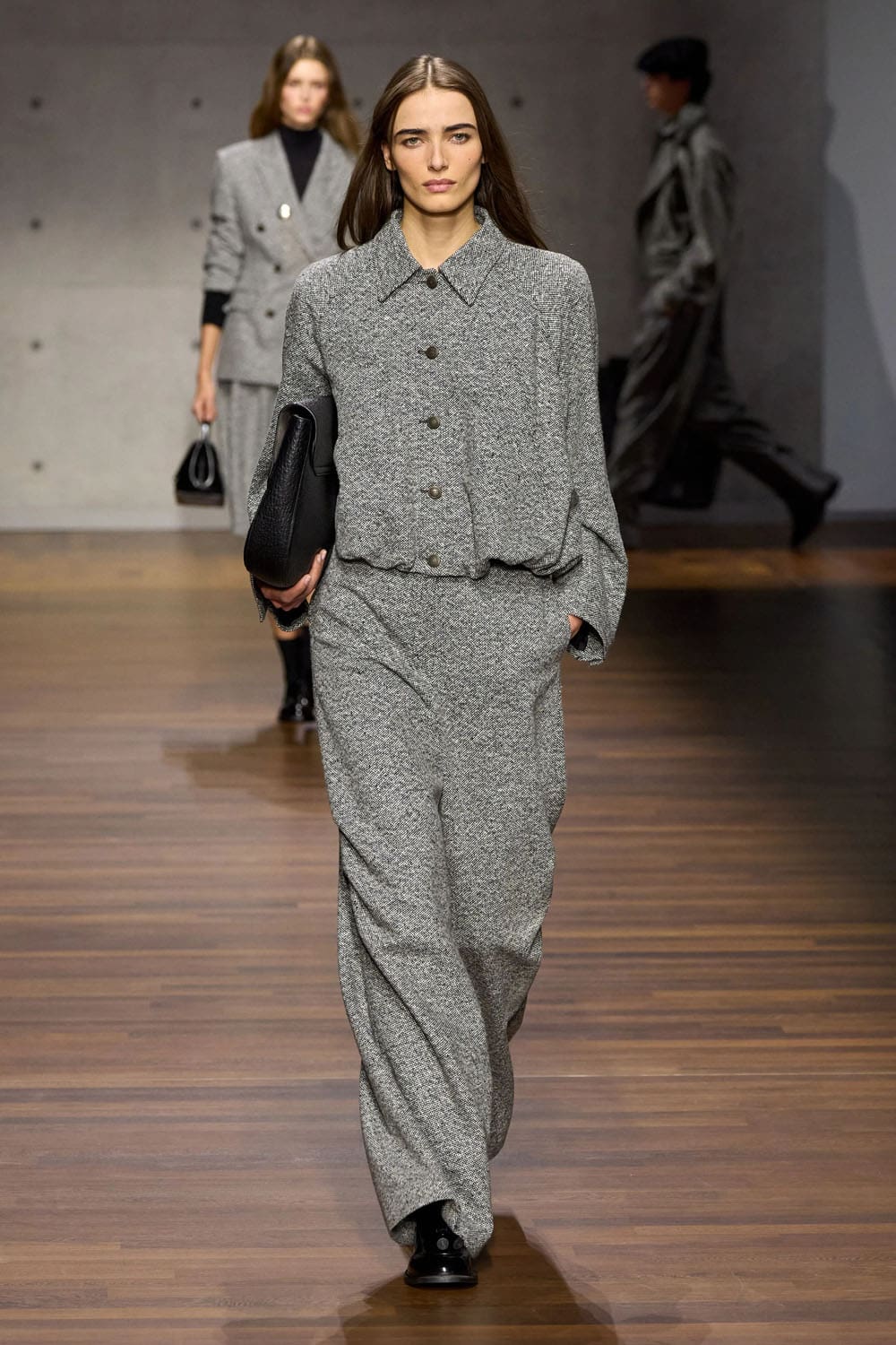 Tweed returns in a sculpted longline jacket paired with wide trousers — a mature countermelody to the earlier youthfulness. The angled closures, curved seams, and minimal collar show an acute understanding of how tailoring can express personality without ornament.