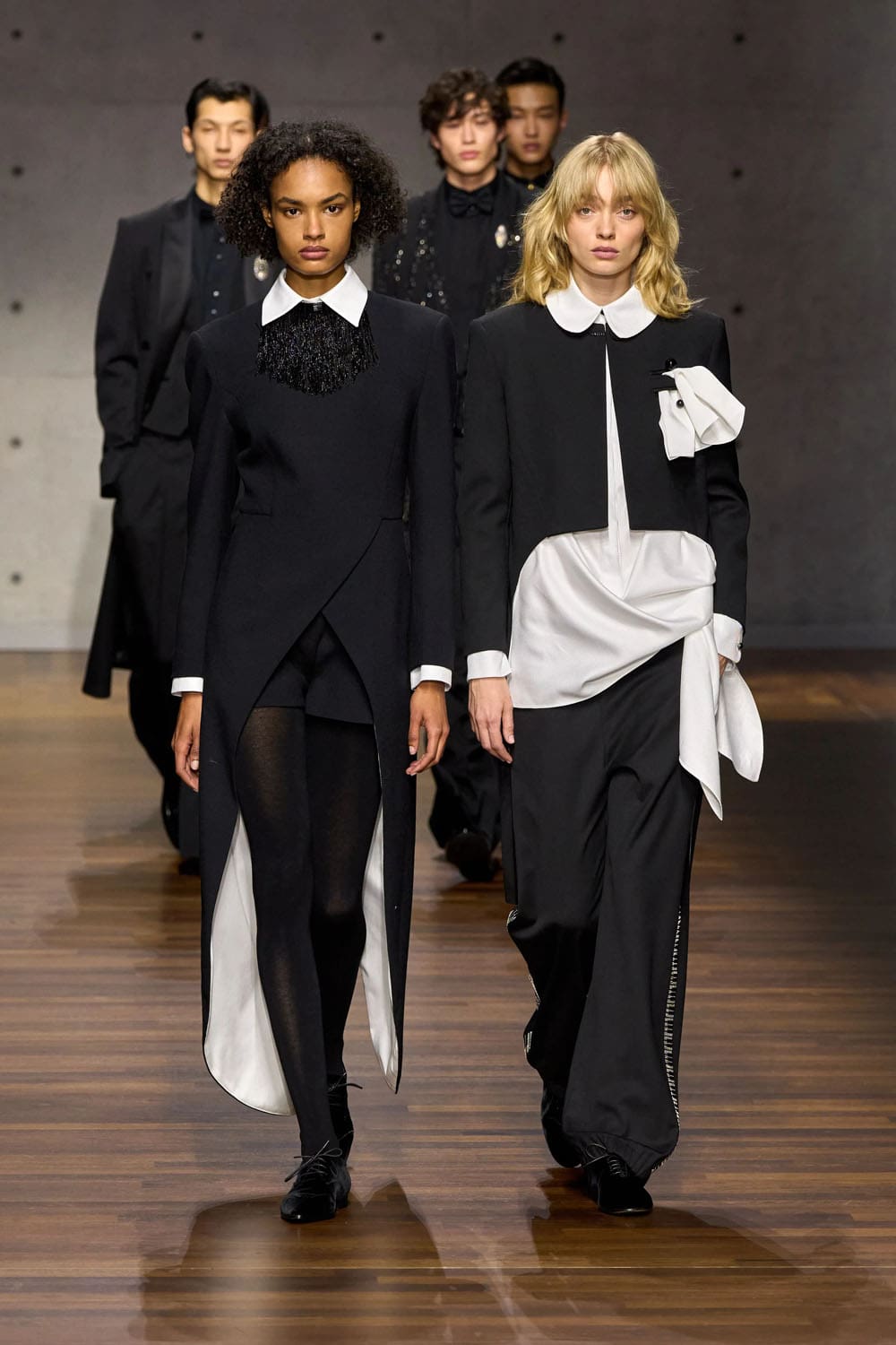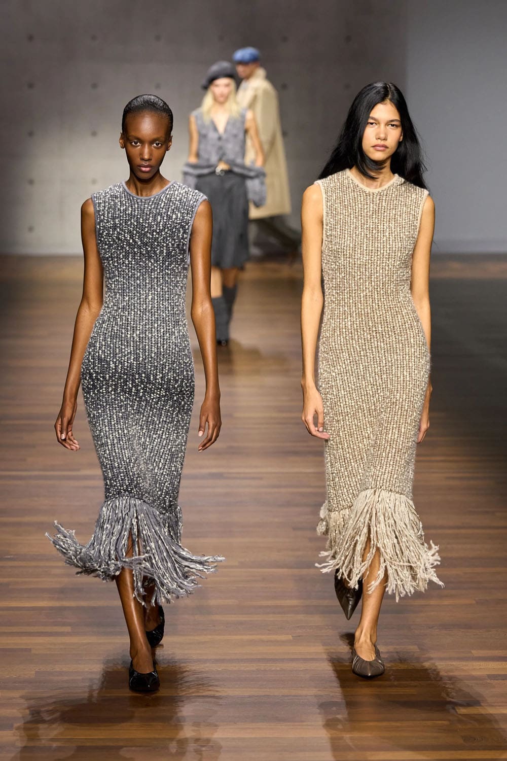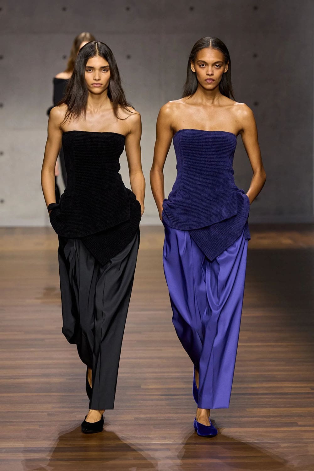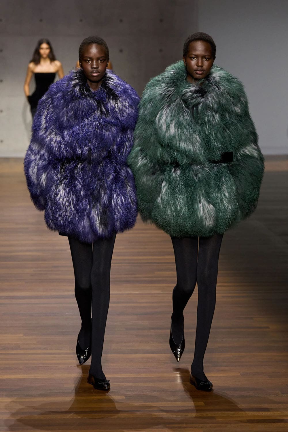 Throughout the collection, the design language remains unwavering — vertical lines, long proportions, tactile fabrics, silhouettes that breathe without losing definition. What distinguishes this season is the atmosphere: a deep sense of conversation, of co-creation, of two designers tuning the instrument rather than reinventing it.