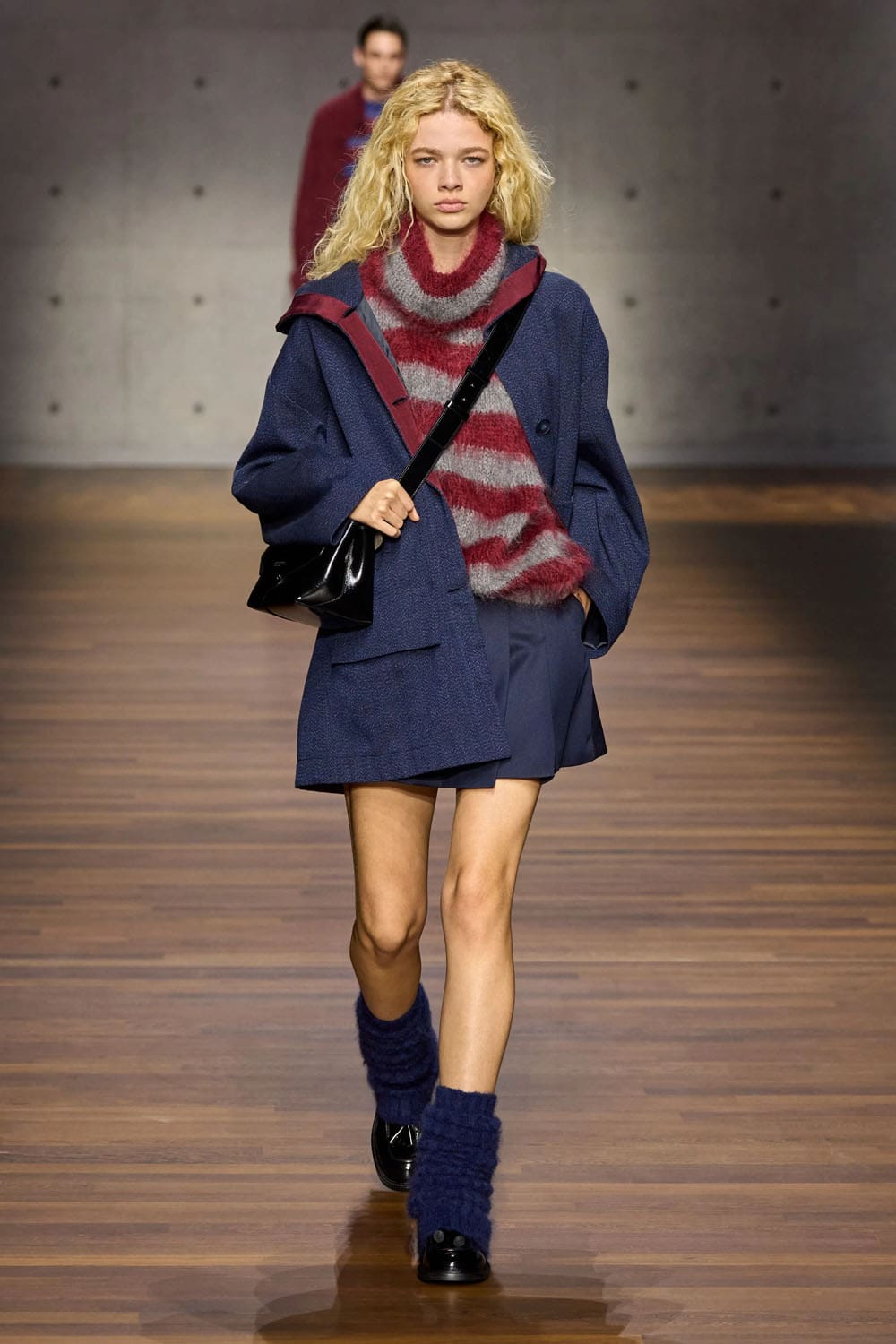 Women’s silhouettes emerge with the same clarity. A cropped tweed jacket worn with a navy pleated mini reconstructs schoolwear codes into something sharper, metropolitan, and quietly flirtatious. The oversized cap and slouchy socks modulate the severity, creating rhythm between softness and structure.