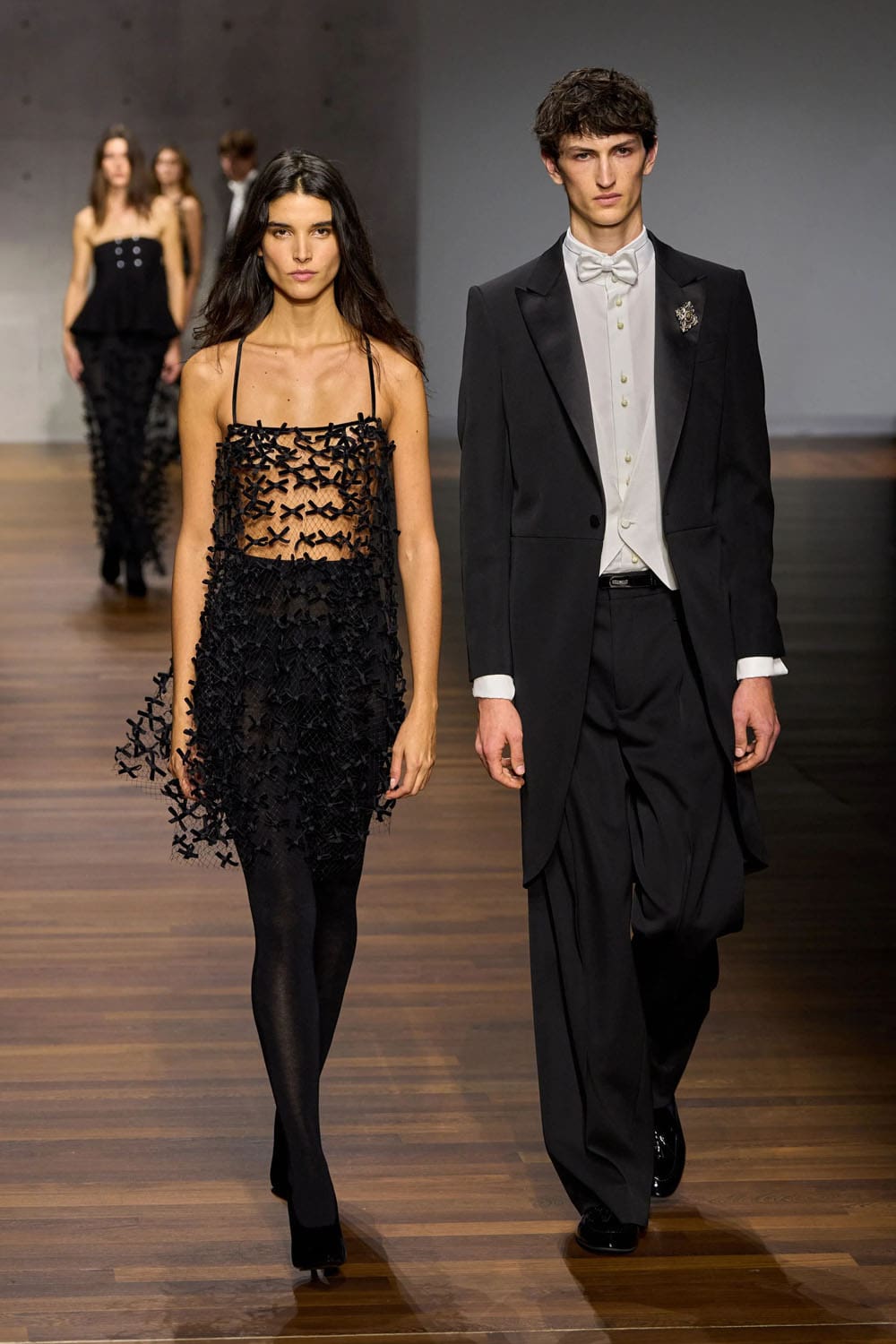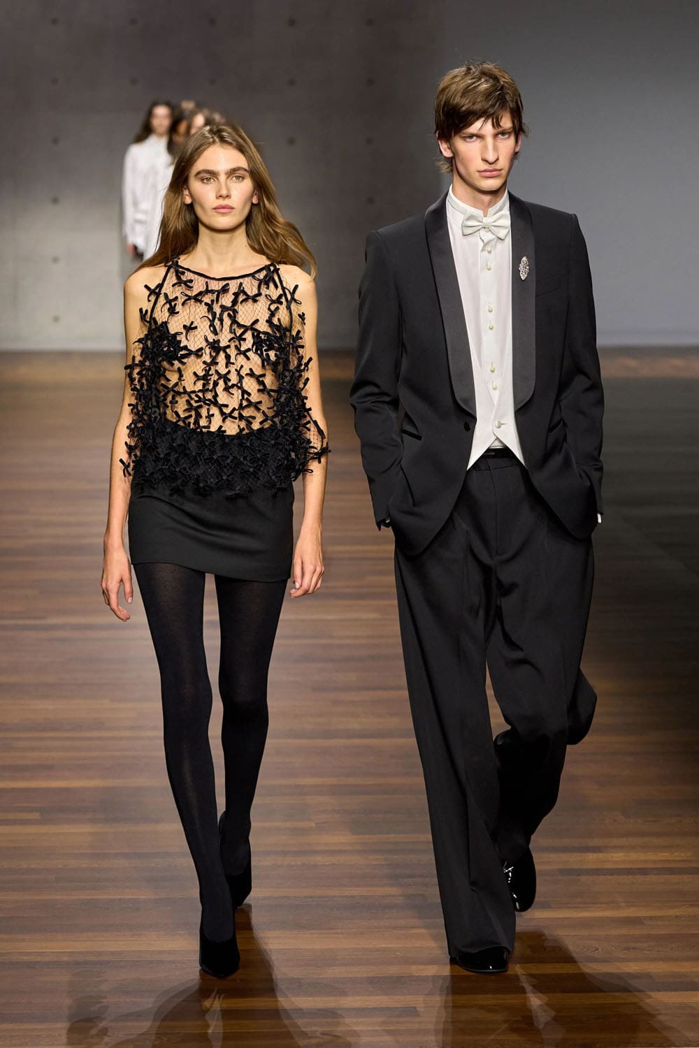 The evening passage is classical Armani: a black tuxedo and a sculptural strapless top paired with a sheer skirt embroidered with delicate, floating forms. It’s a pas de deux between masculine precision and feminine airiness — a final, gentle demonstration that neither has dominance here; each elevates the other.