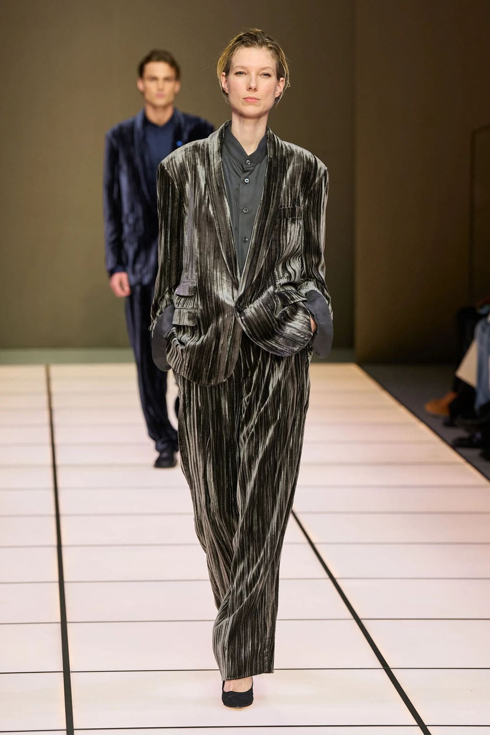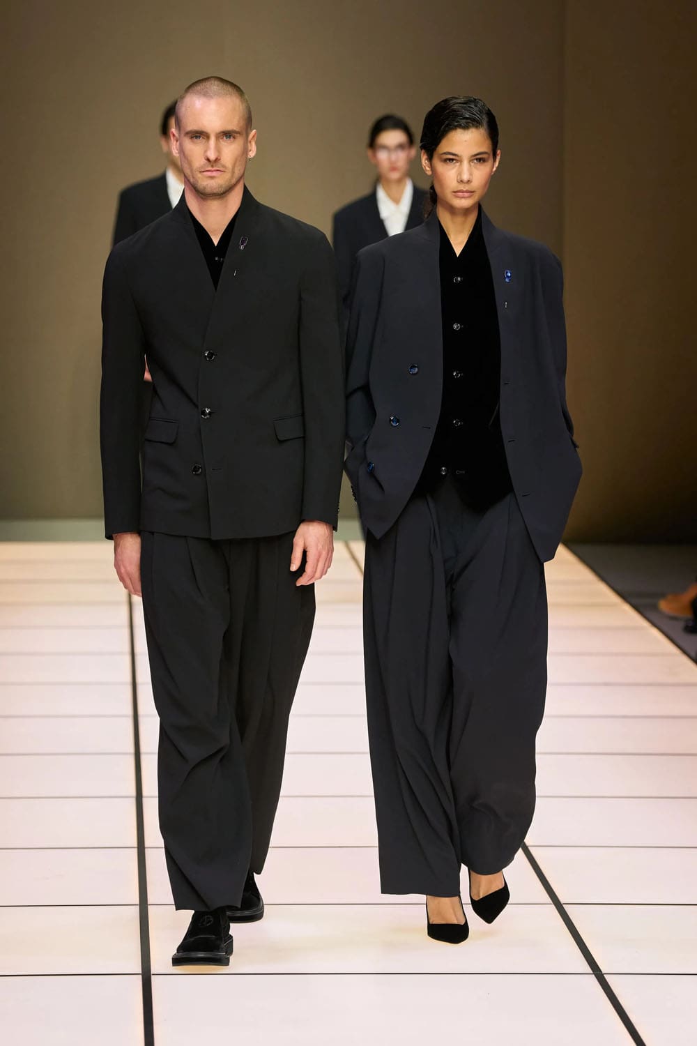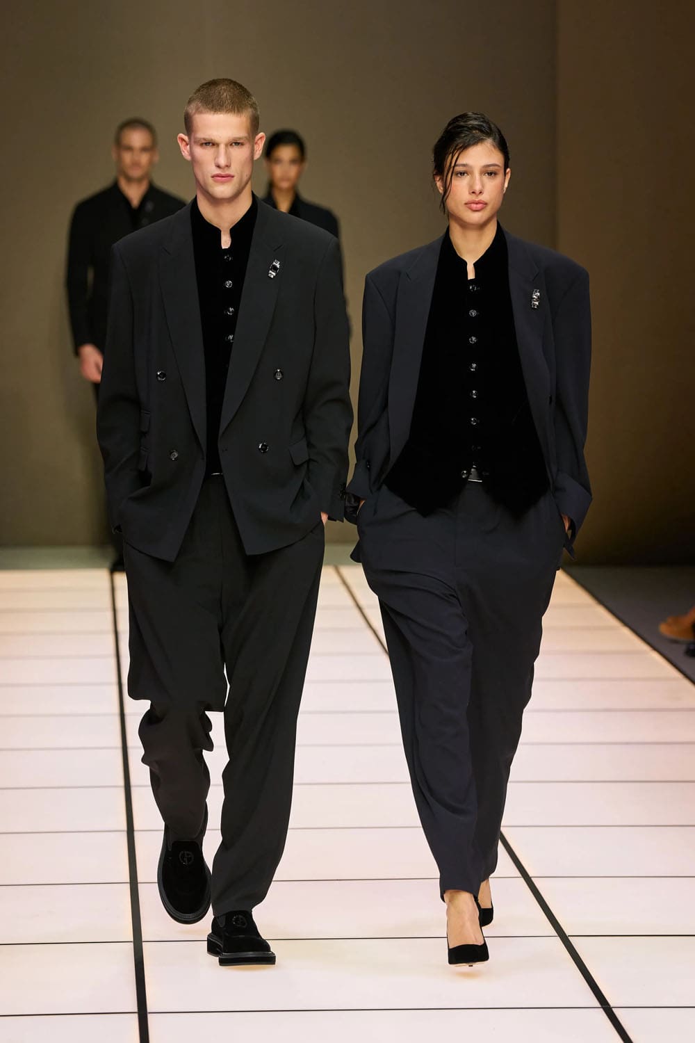 And yet, the show did nod forward. Certain menswear looks were mirrored by womenswear versions — a prelude to the co-ed Emporio Armani show. The closing eveningwear — four black and white coed pairings — brought the tempo back to near stillness. It was not grand. It was composed.