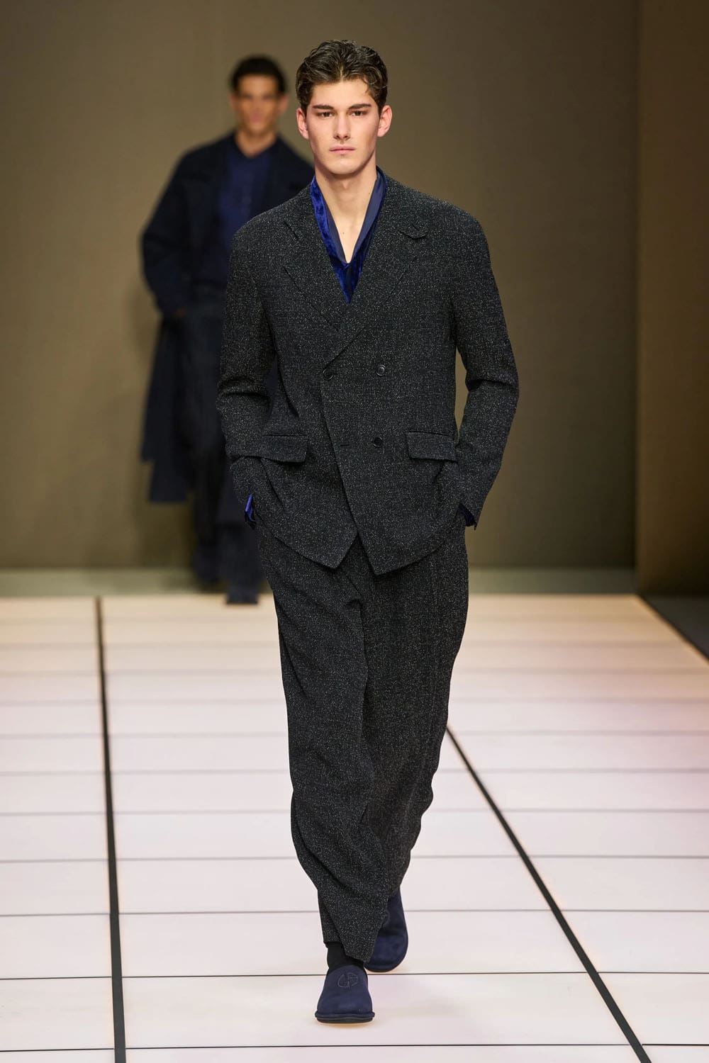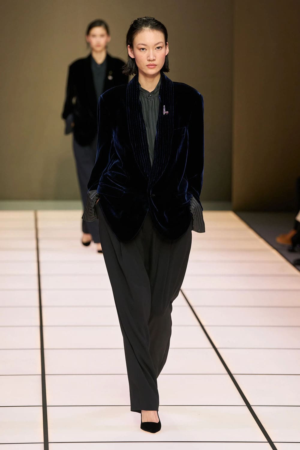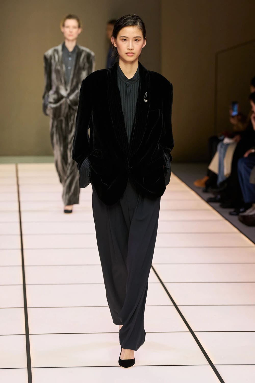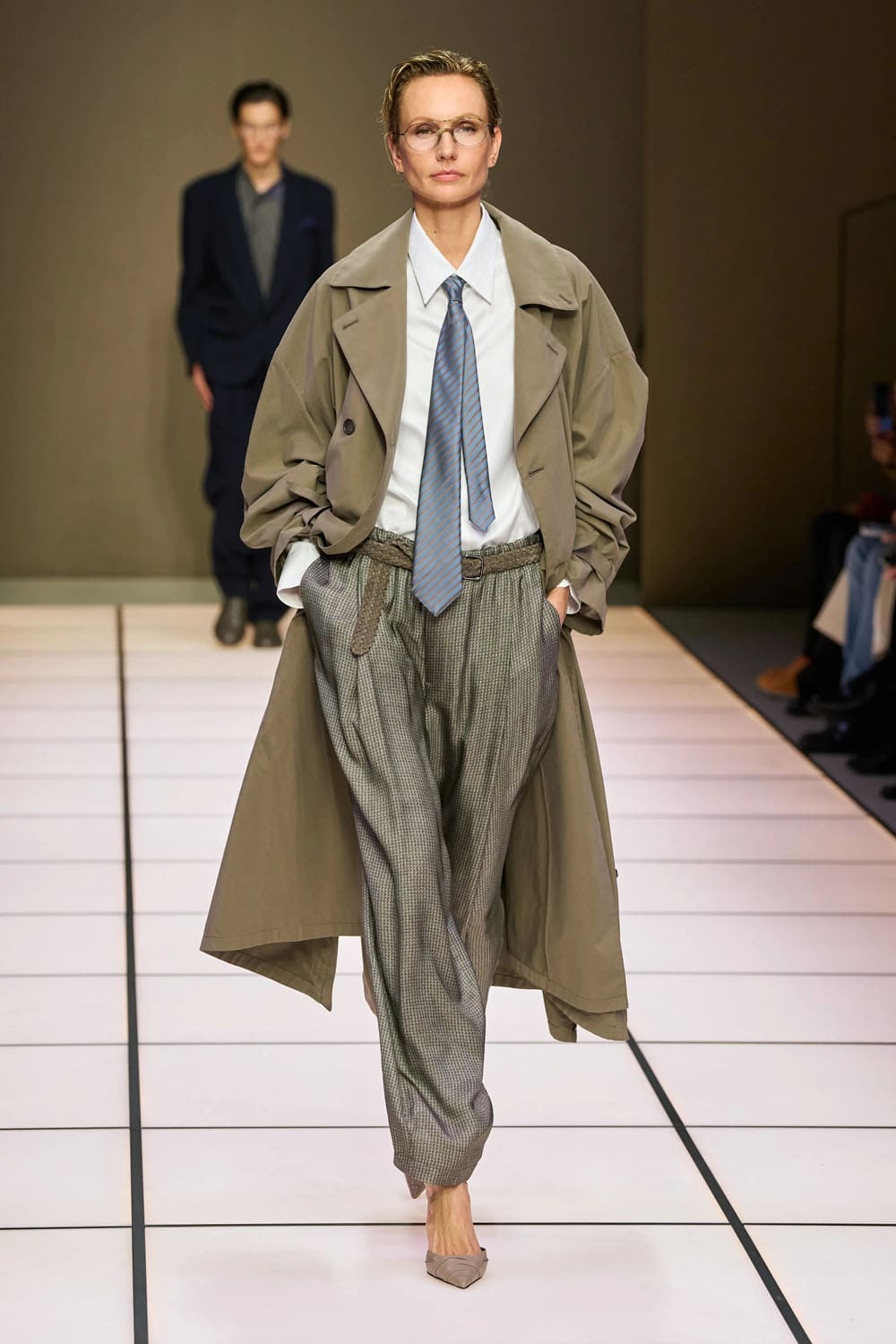 And yet, the show did nod forward. Certain menswear looks were mirrored by womenswear versions — a prelude to the co-ed Emporio Armani show. The closing eveningwear — four black and white coed pairings — brought the tempo back to near stillness. It was not grand. It was composed.