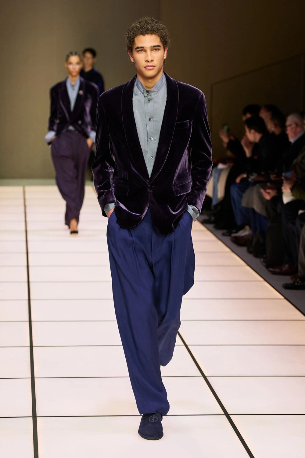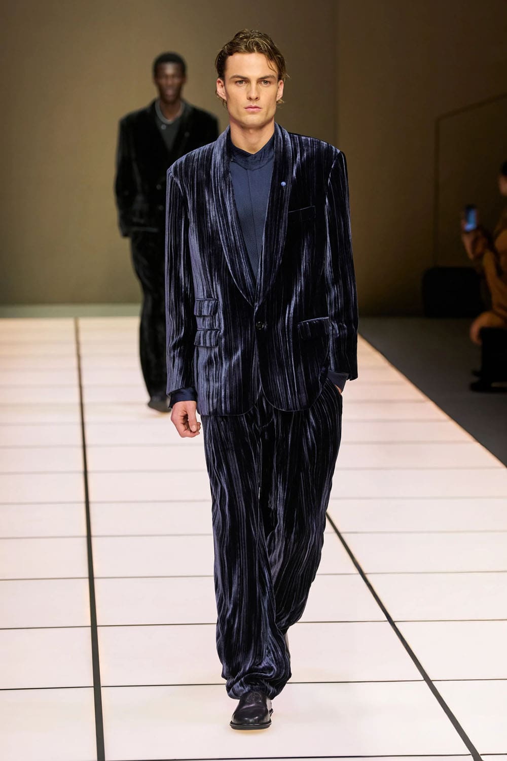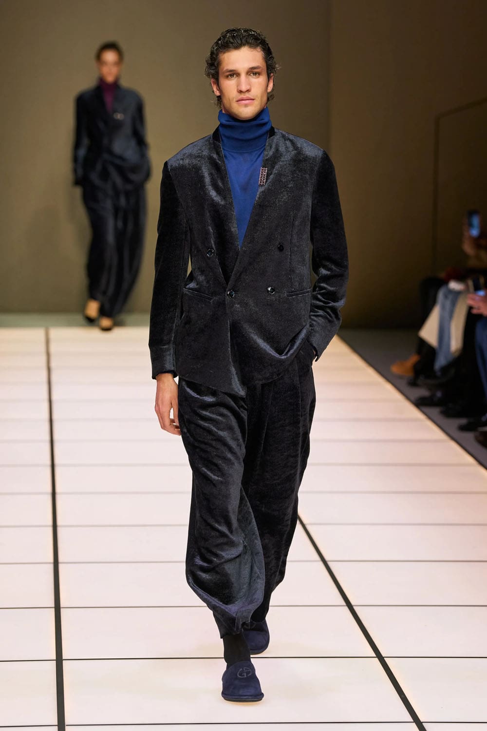 Two suits, cut in a semi-sheer crushed velvet, offered the most daring moment. Their surface shimmered like broken corduroy, fractured under the lights. Yet the tailoring held. No gimmick escaped discipline.