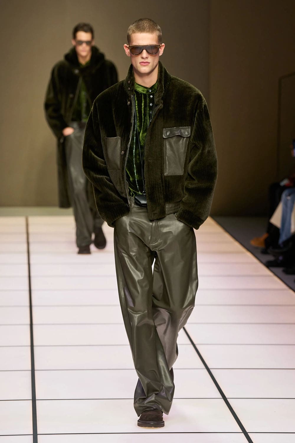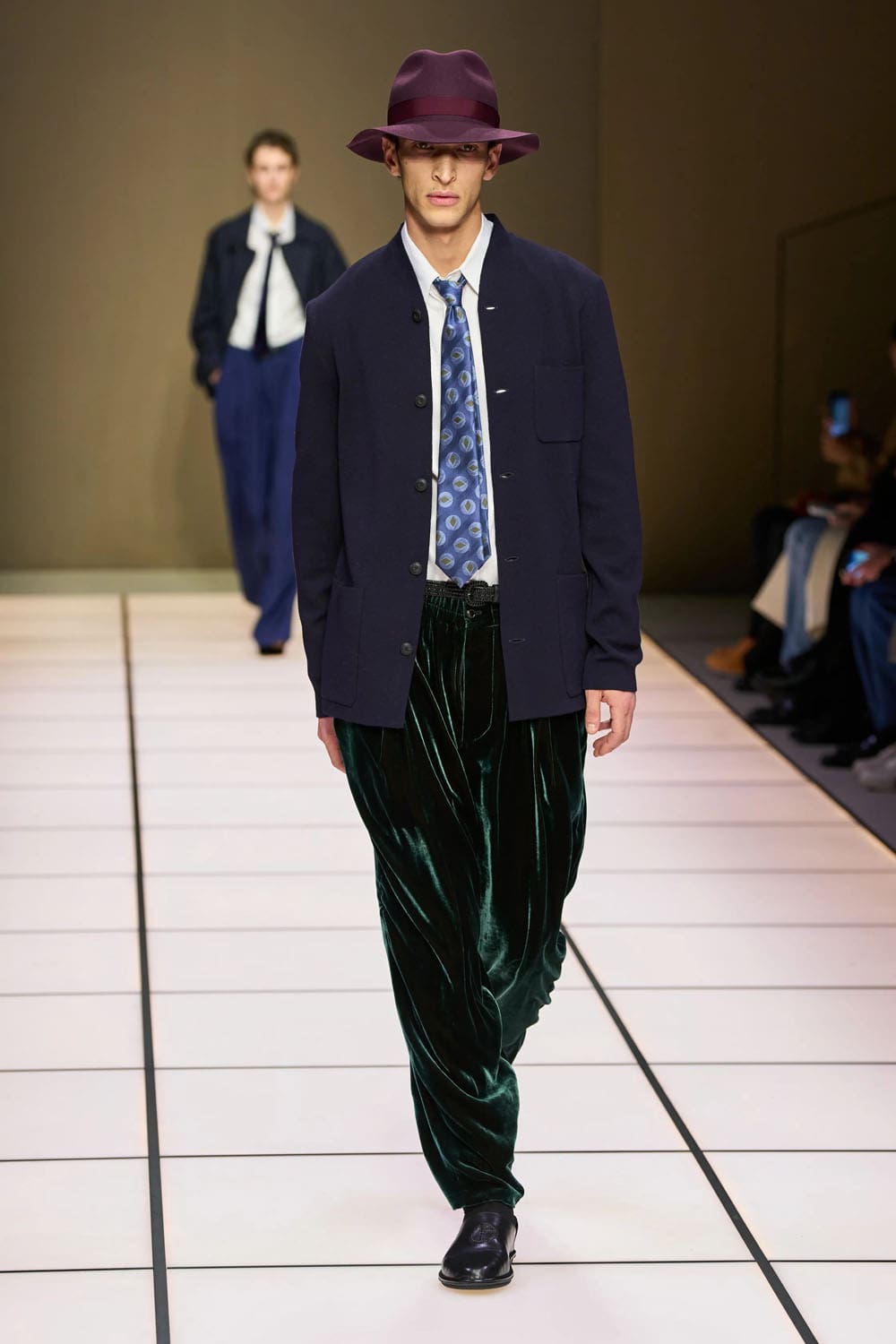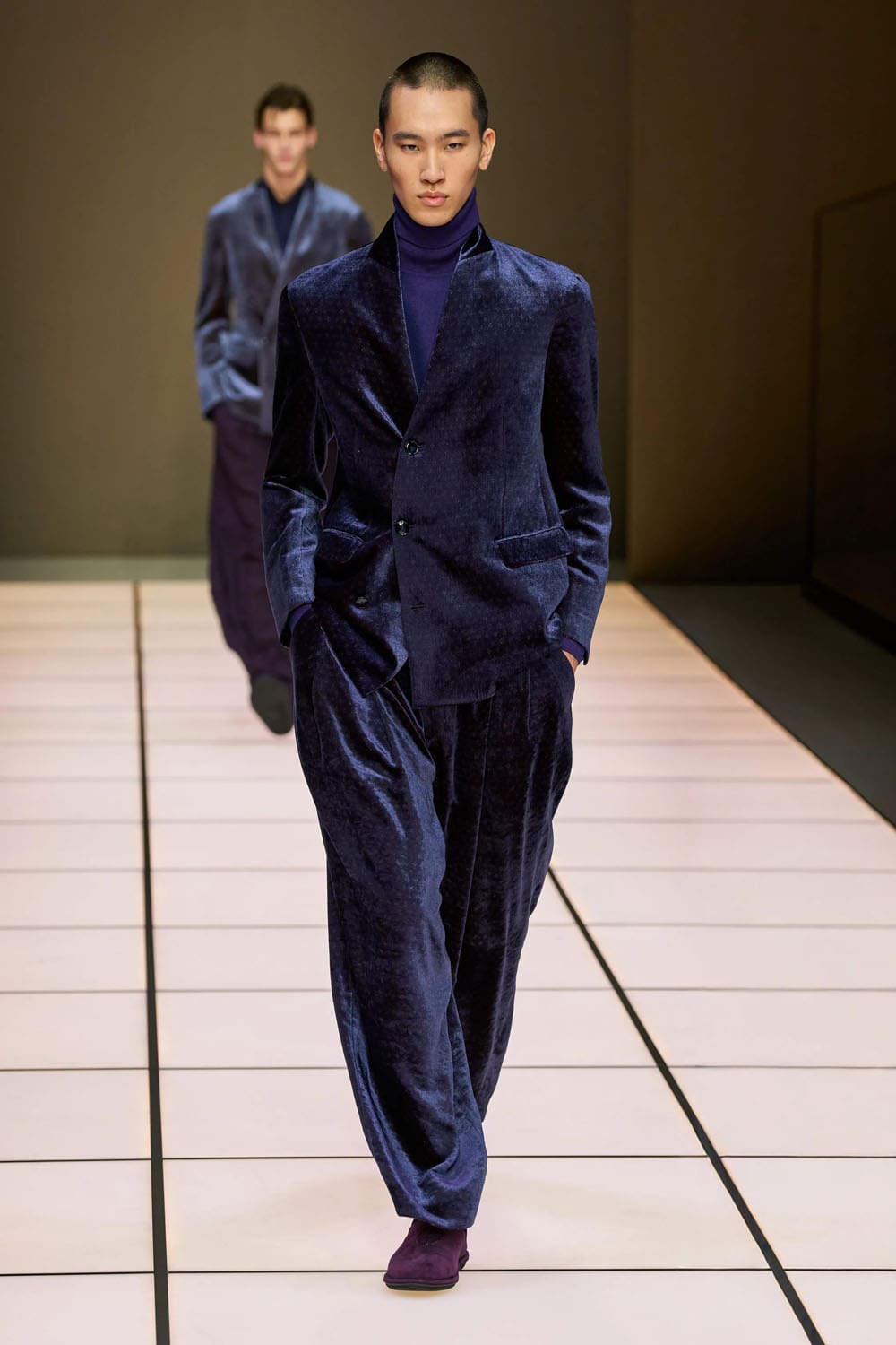 Two suits, cut in a semi-sheer crushed velvet, offered the most daring moment. Their surface shimmered like broken corduroy, fractured under the lights. Yet the tailoring held. No gimmick escaped discipline.