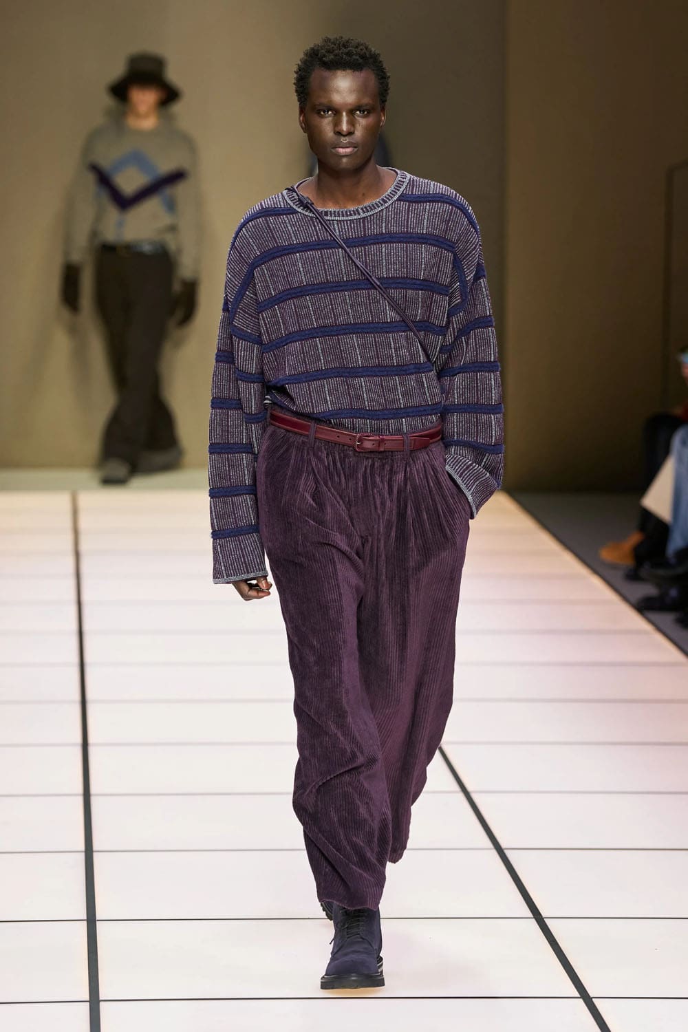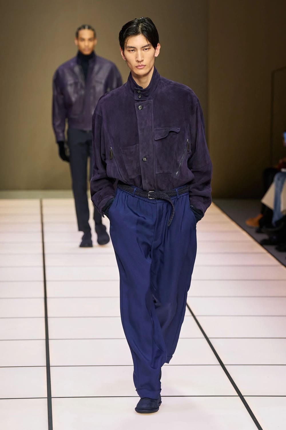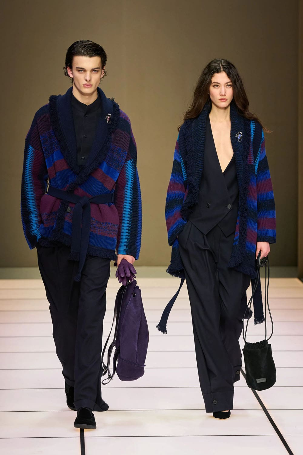 The show’s structure broke into phases — an intermission punctuated by alpine parkas, part of the Armani Neve line. Here Dell’Orco allowed himself a slight deviation: rich purples, shearlings fitted close to the body, and Alanui-striped belted cardigans that marked an unprecedented collaboration. But even this was held in check — no hysteria, no viral bait.