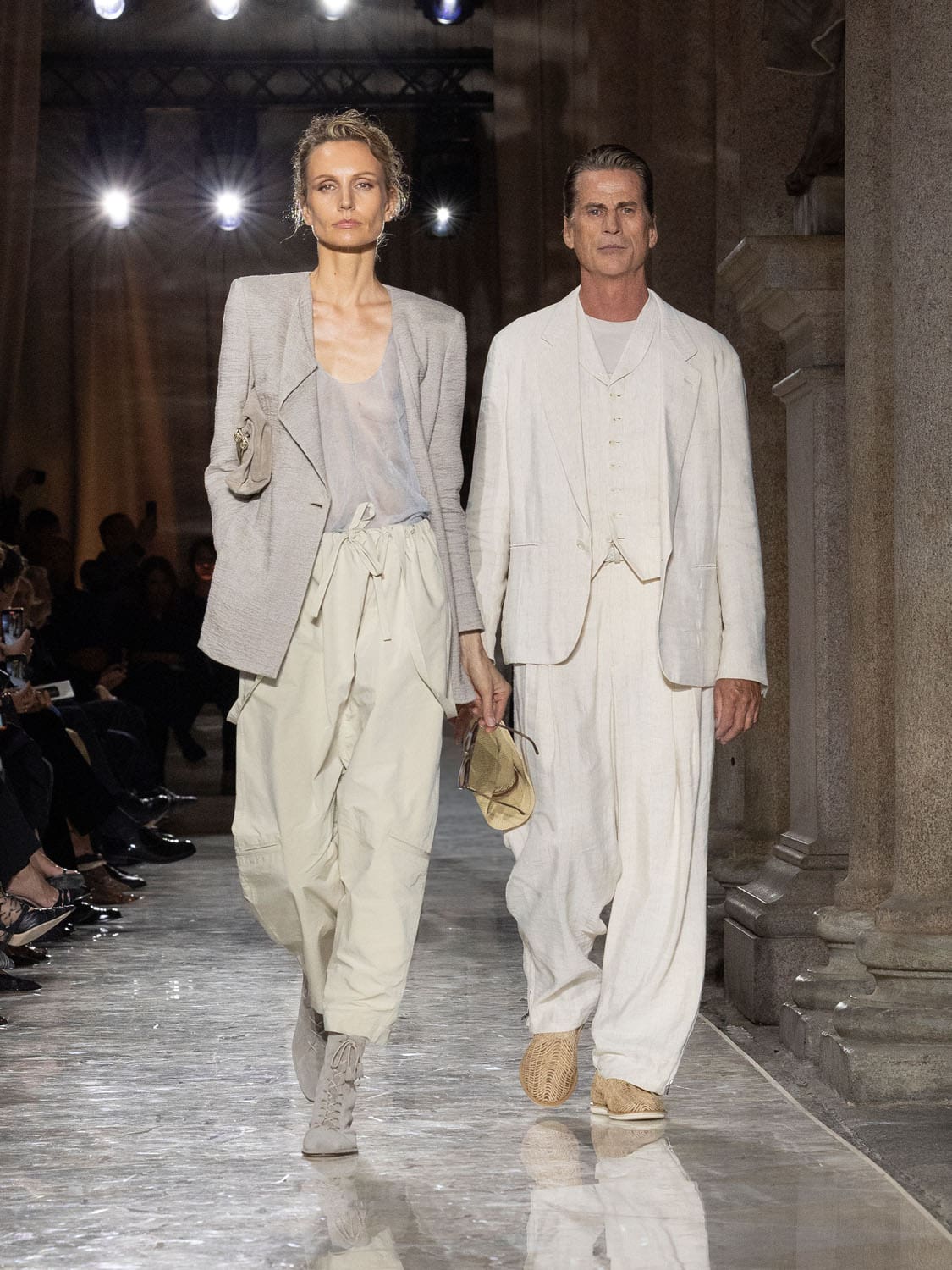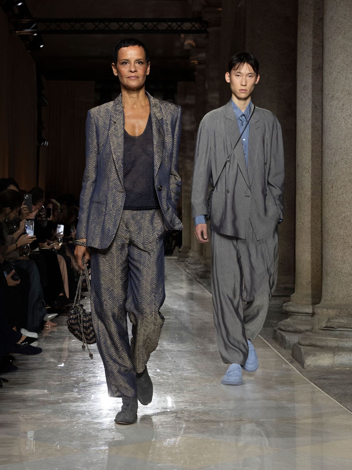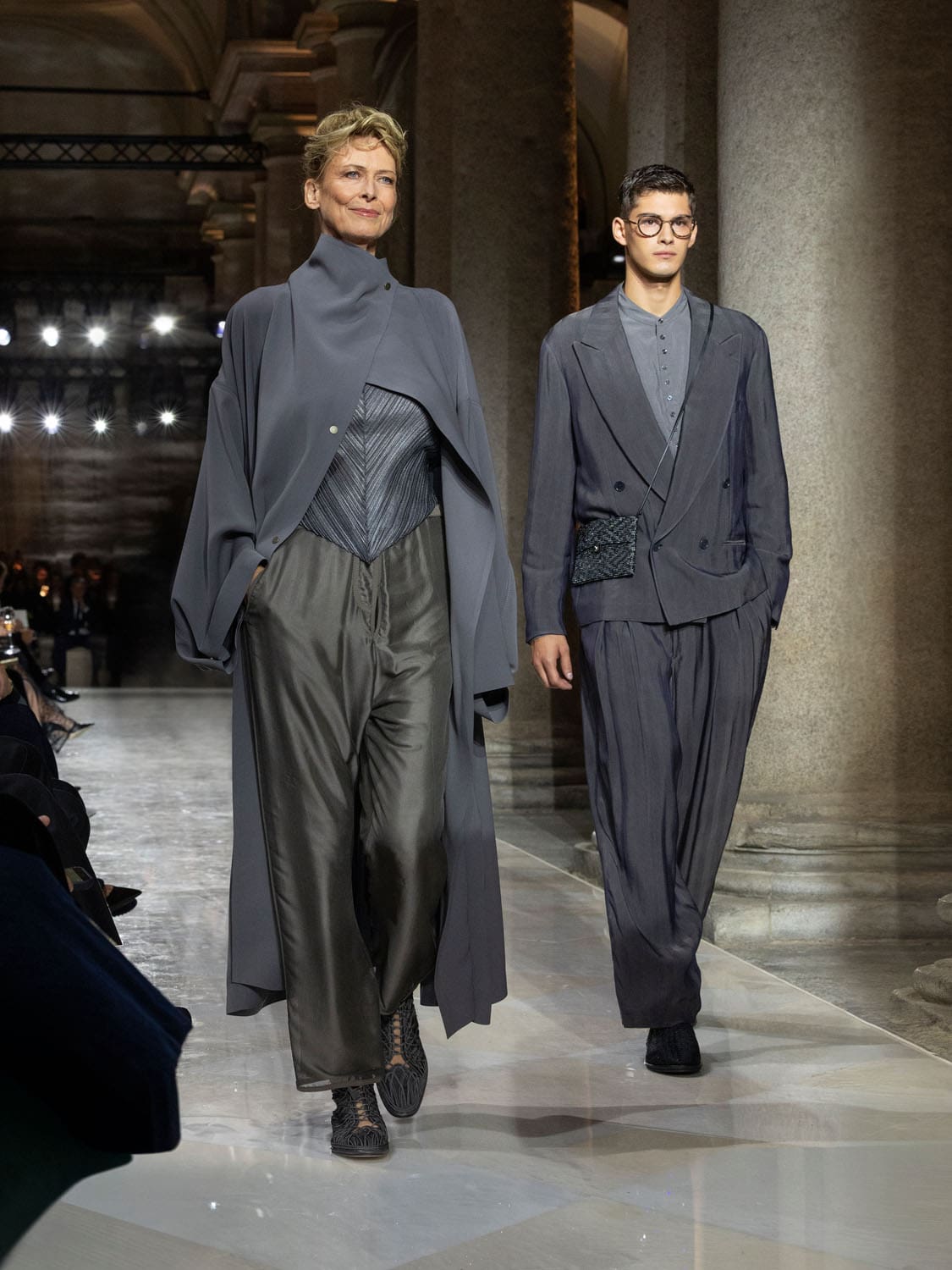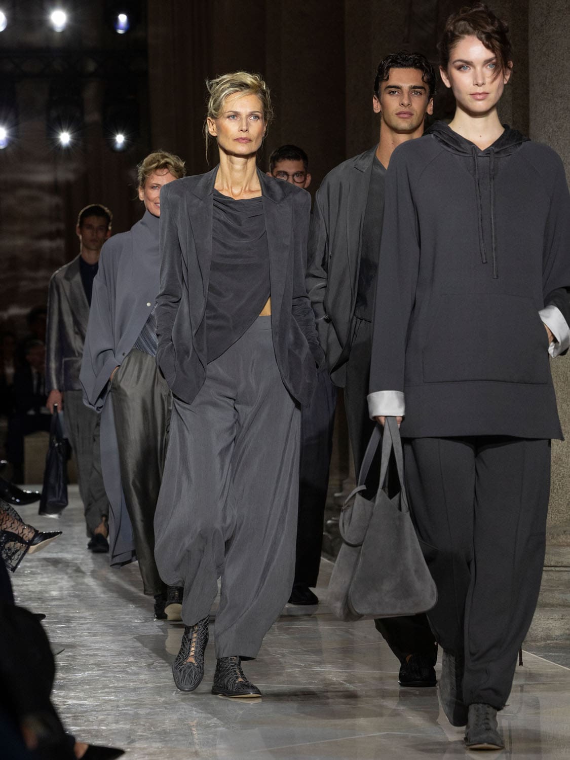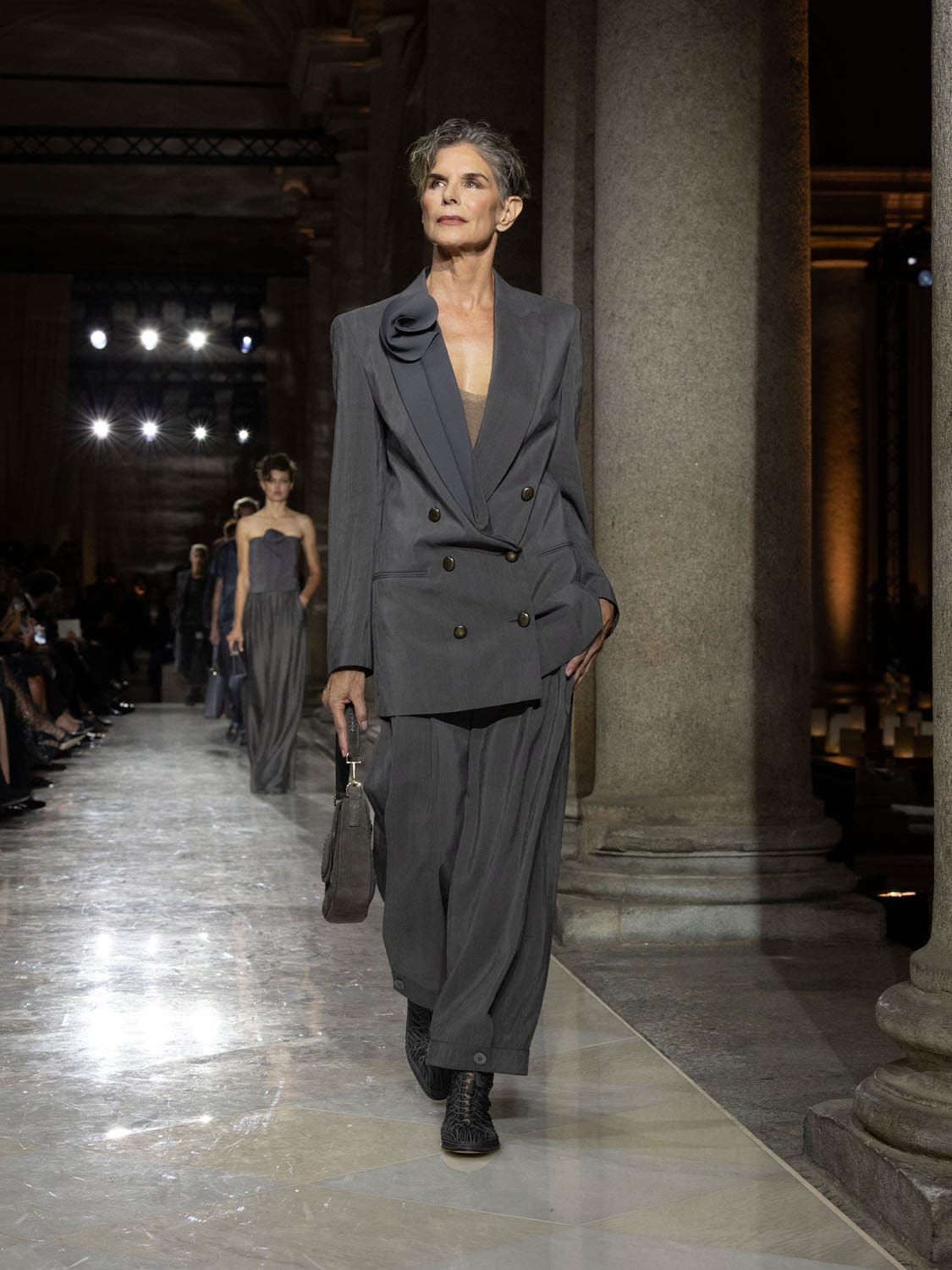 Historic Armani models returned to the runway, embodying once again the designer’s vision of woman—independent, graceful, untouchable yet deeply human. Their presence underscored the show’s gravity: not only garments walked, but history itself.