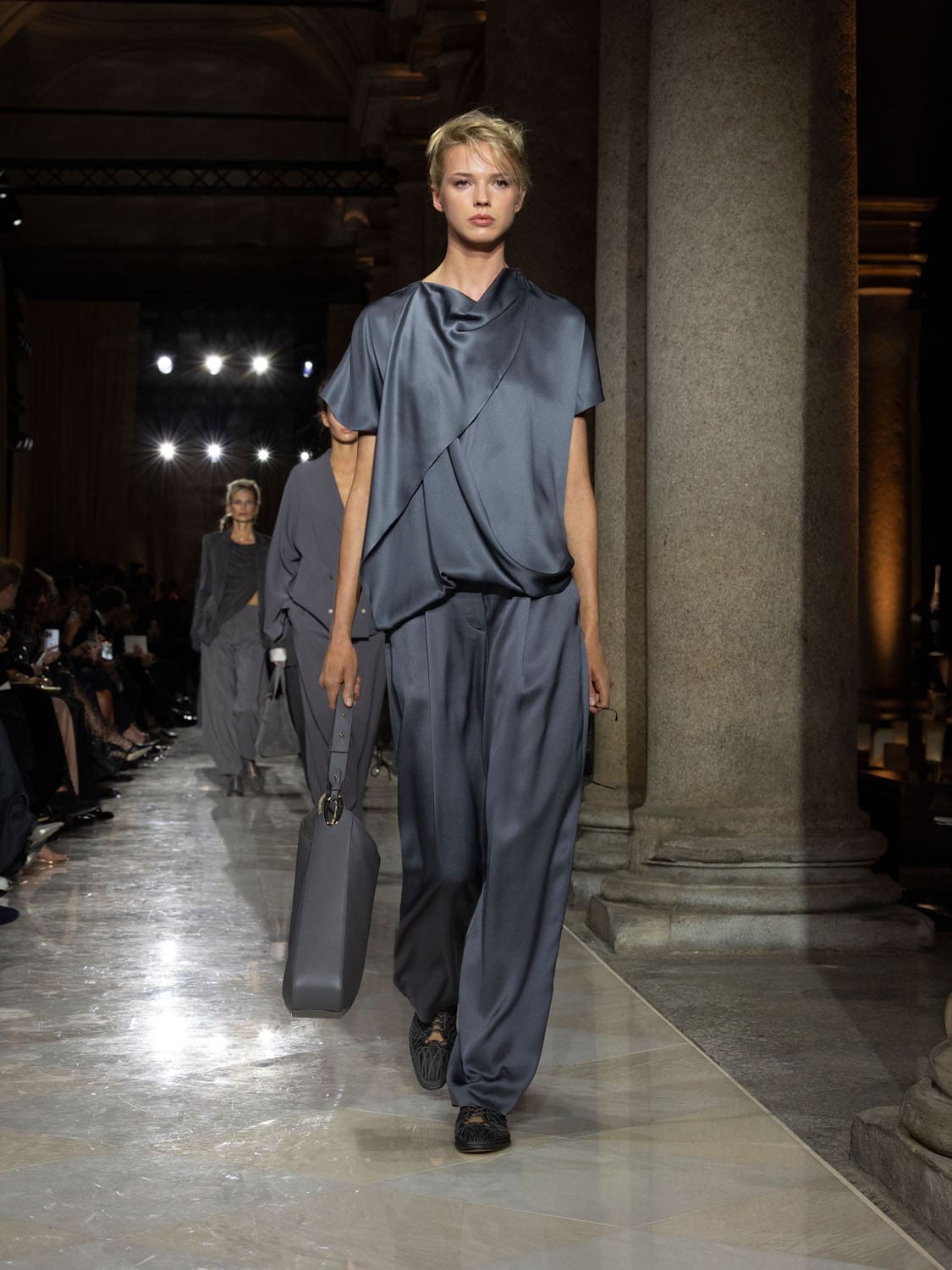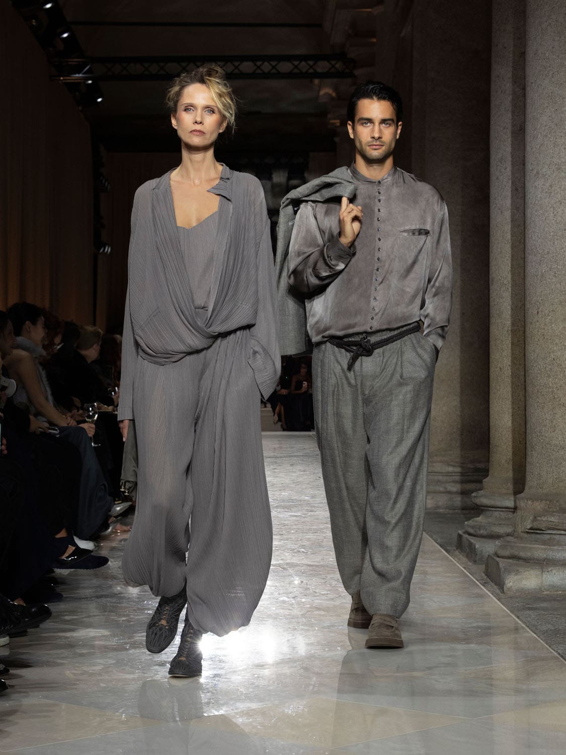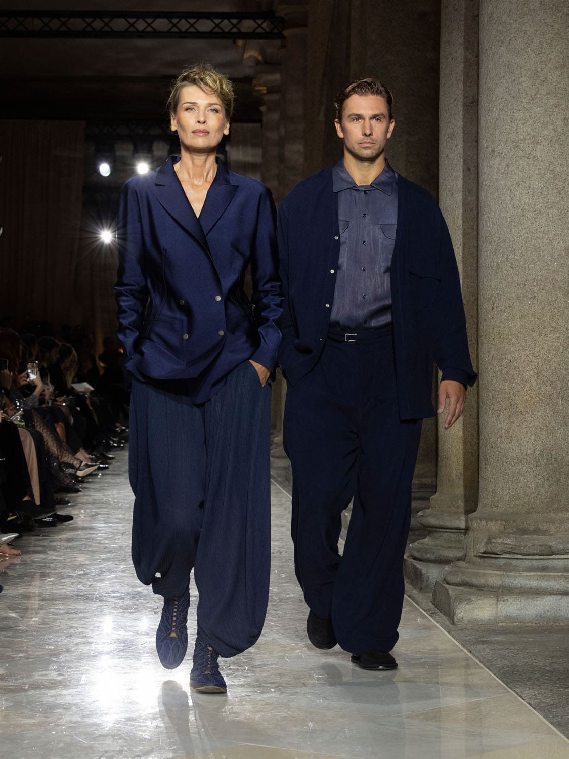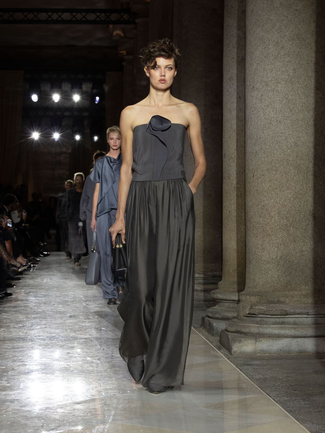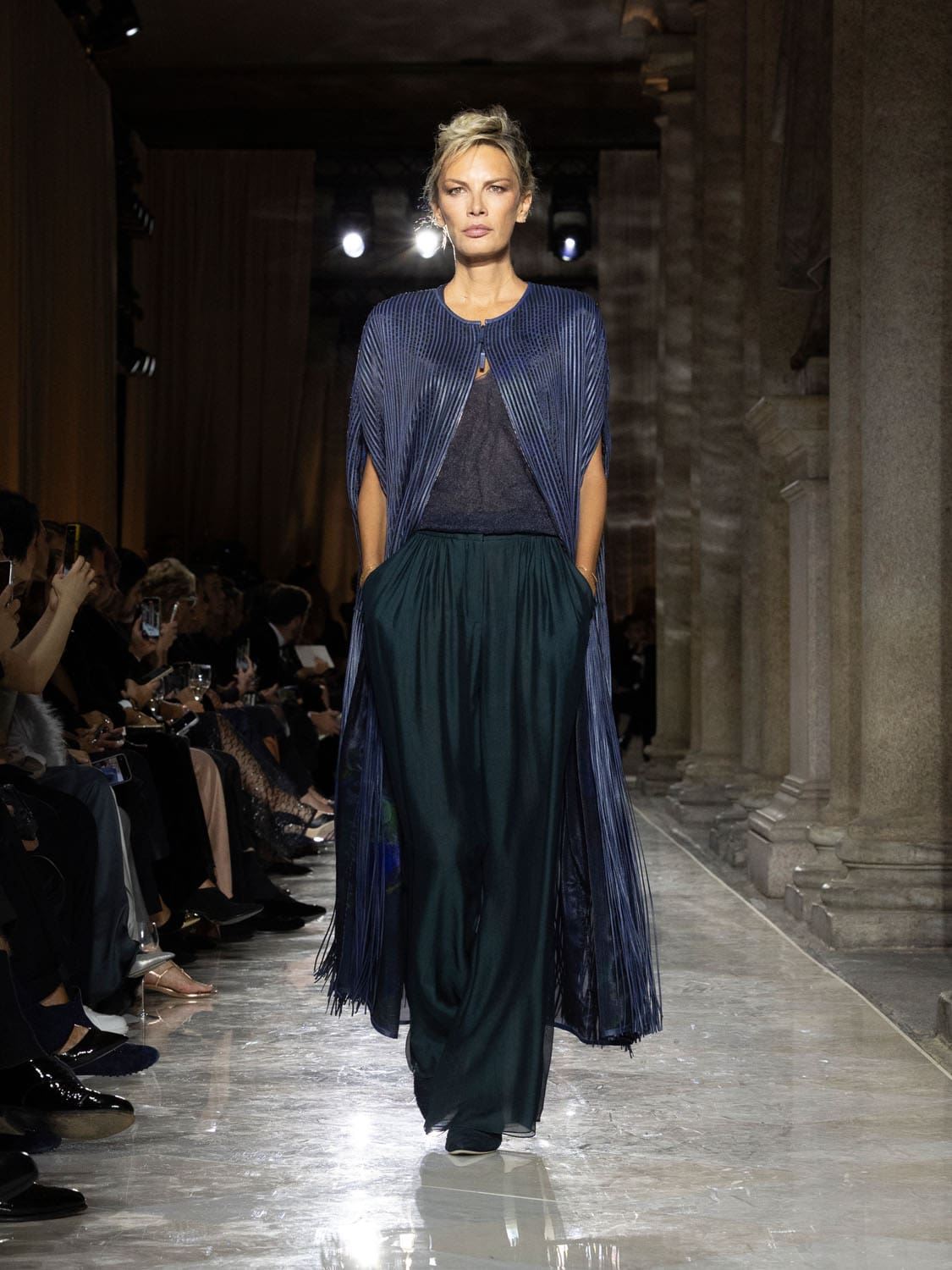 Historic Armani models returned to the runway, embodying once again the designer’s vision of woman—independent, graceful, untouchable yet deeply human. Their presence underscored the show’s gravity: not only garments walked, but history itself.