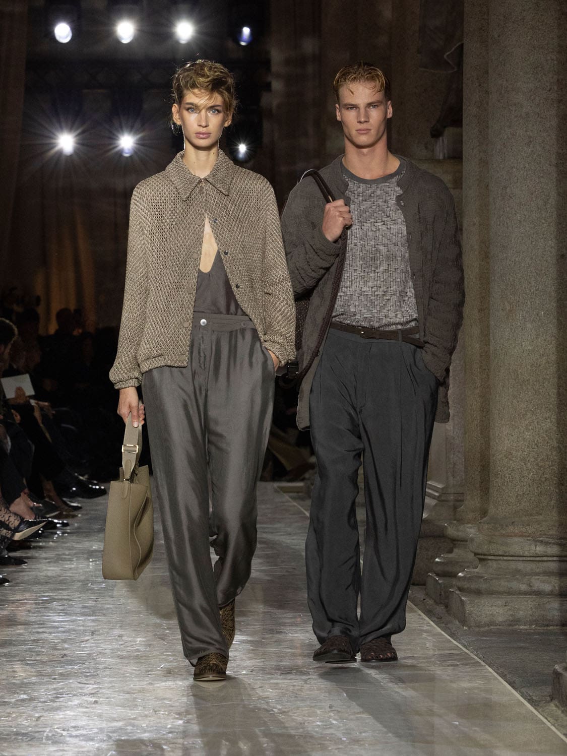 The show unfolded as both remembrance and celebration. This year marks the 50th anniversary of the house of Armani, an anniversary already inaugurated with Armani/Archivio and the landmark exhibition at the Pinacoteca di Brera, where 133 archival creations conversed with masterpieces of Italian art. Last night, the dialogue between past and present deepened. Each silhouette, each fabric, seemed like a coded letter left by the designer—an archive of emotion rendered in cloth.