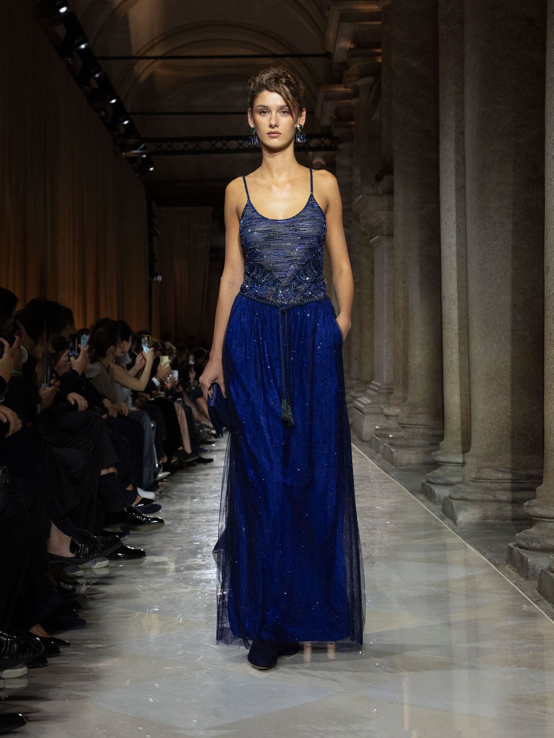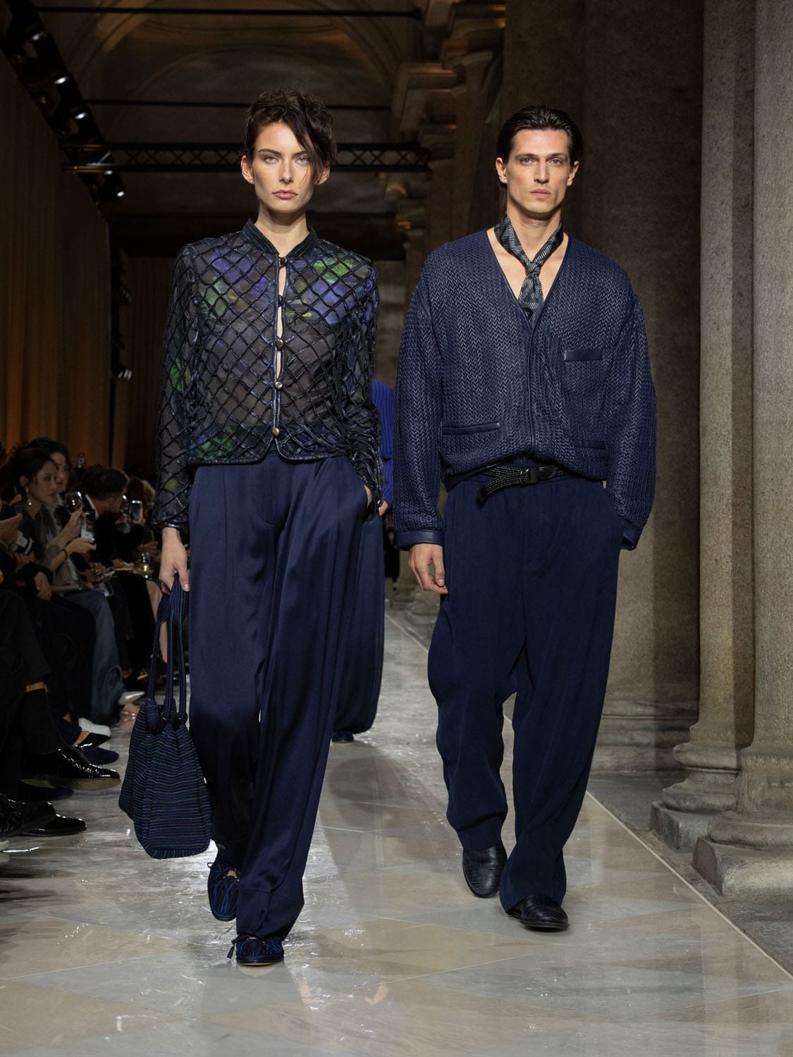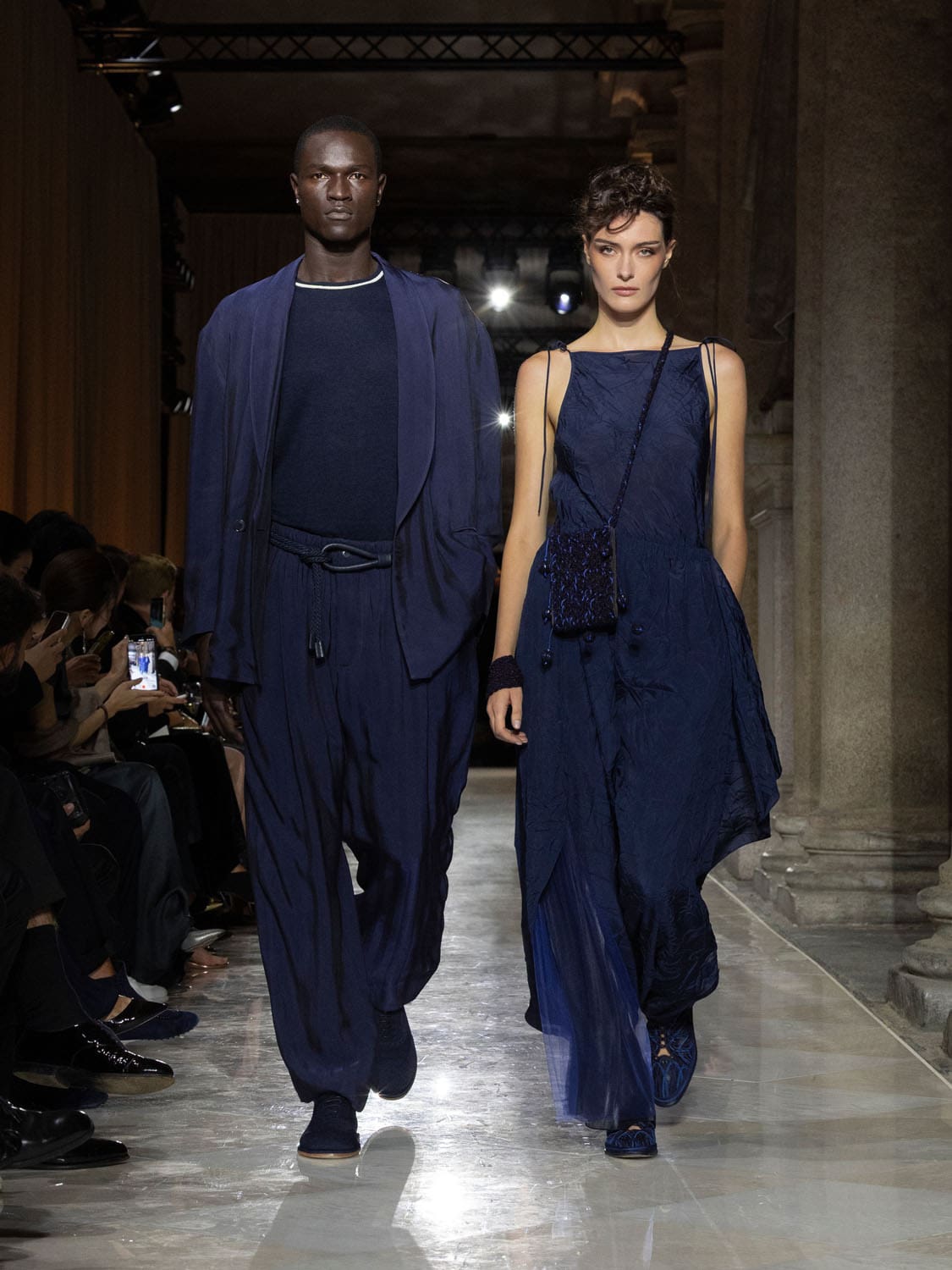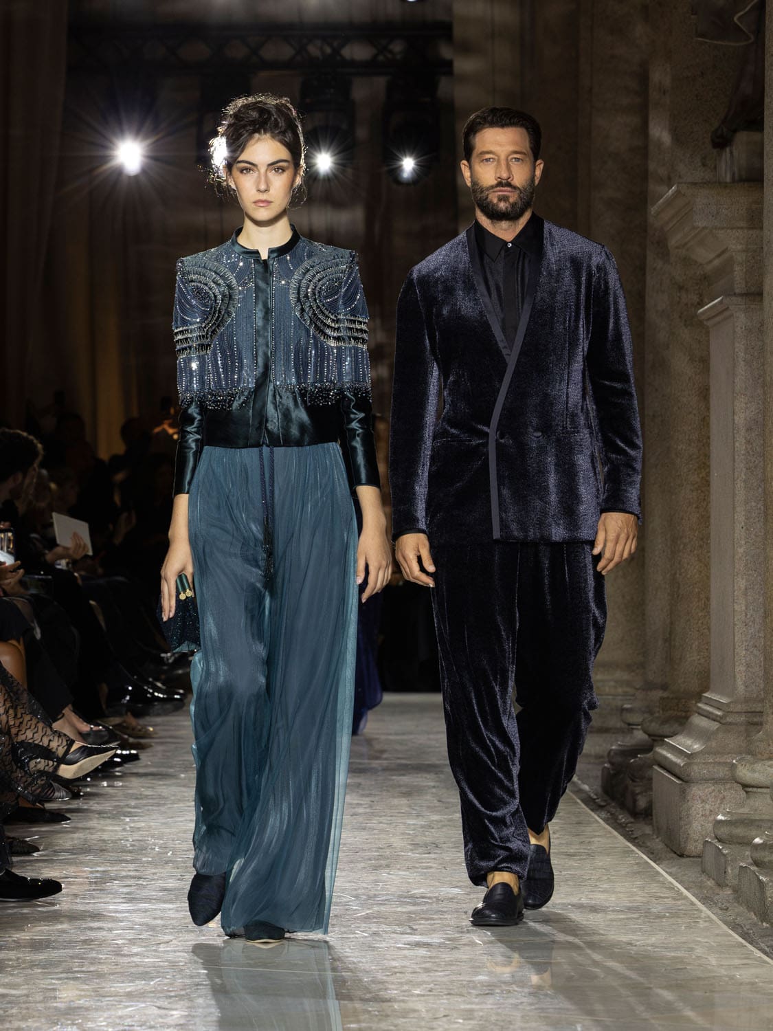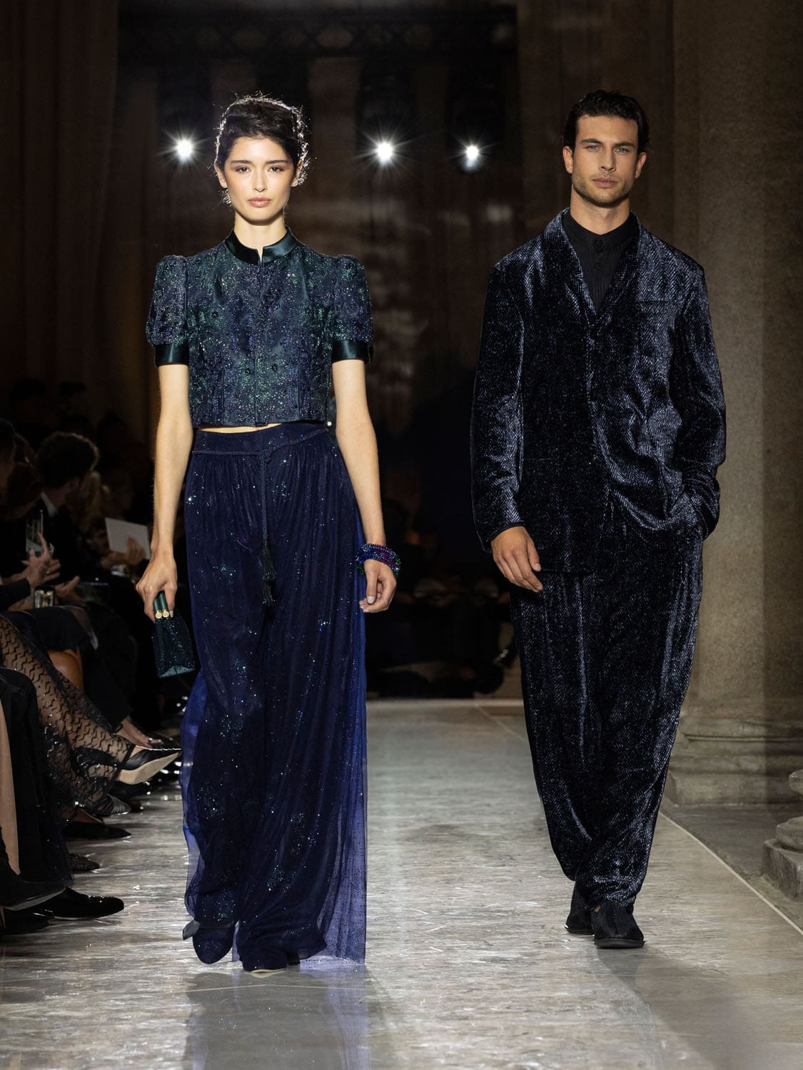 Colours shifted like landscapes at dusk and dawn, from earthy neutrals to deep nocturnal blues, interrupted by flashes of jewel tones that caught the eye like sun on water. Nothing was rigid; everything was fluid, designed to yield and flow. It was Armani’s eternal paradox: strength expressed through weightlessness, a powerful statement through garments that feel almost like air.