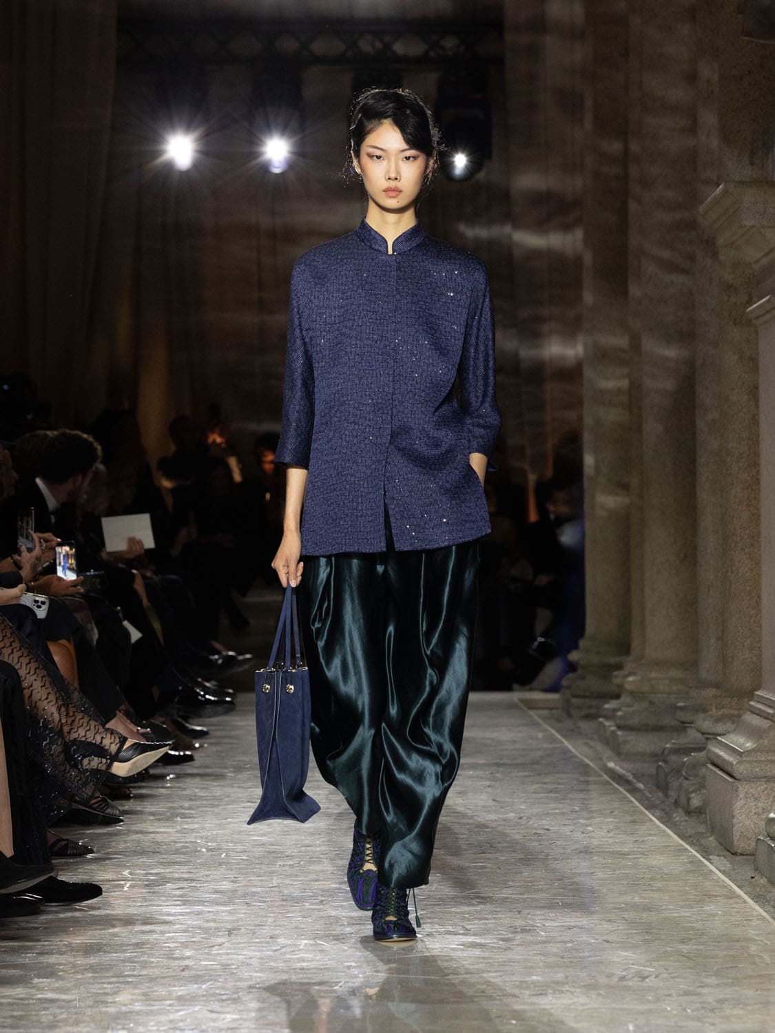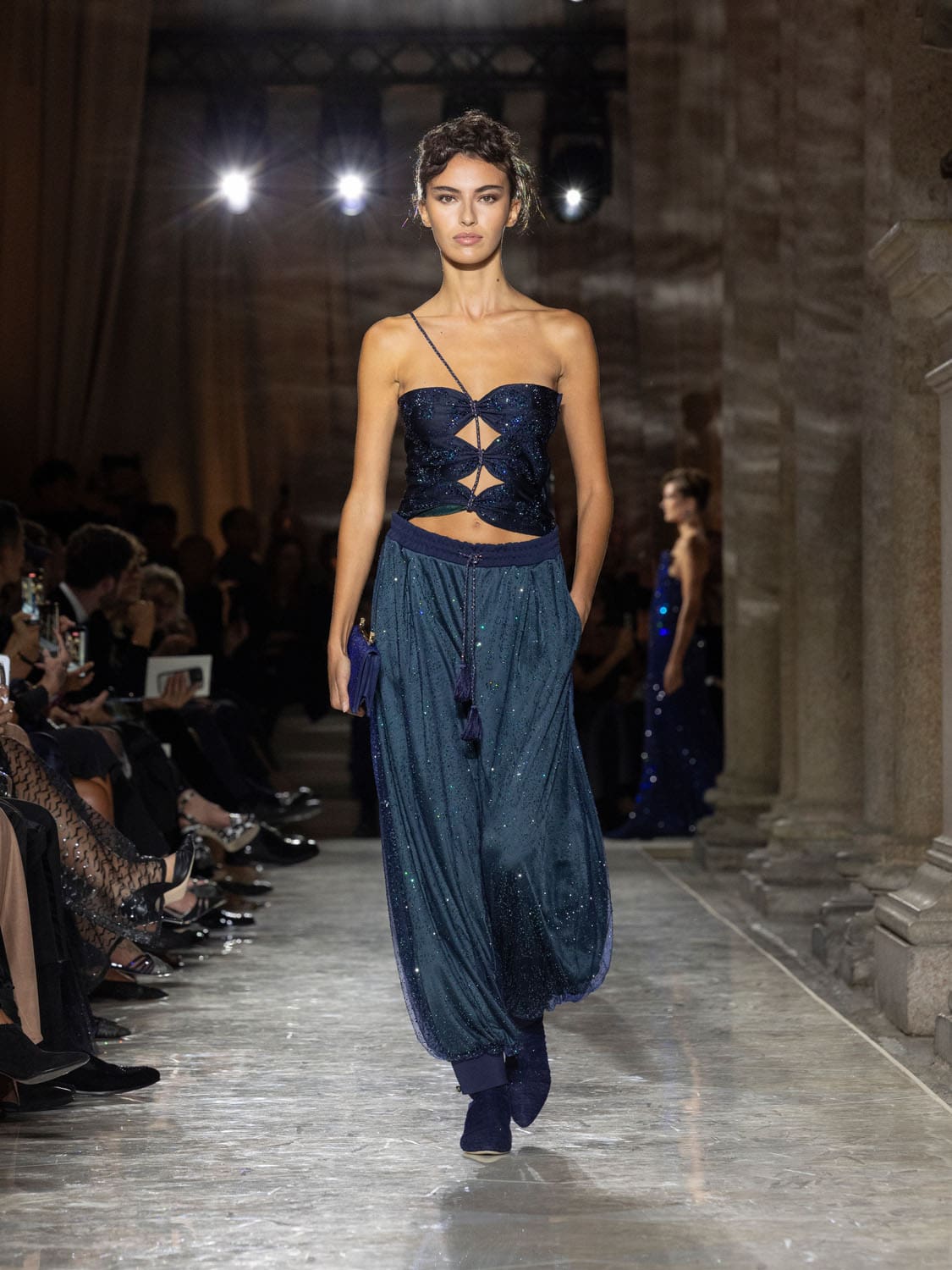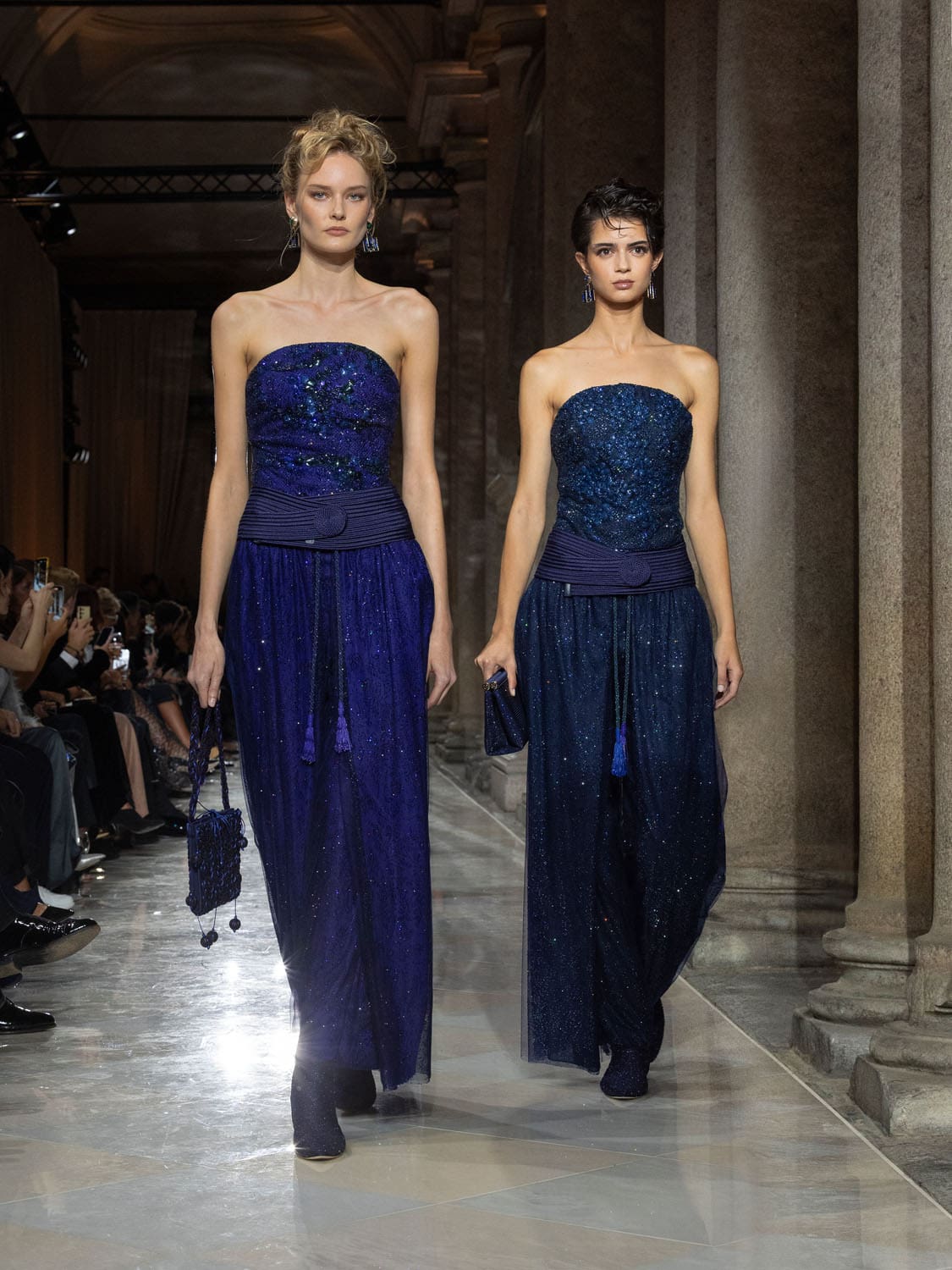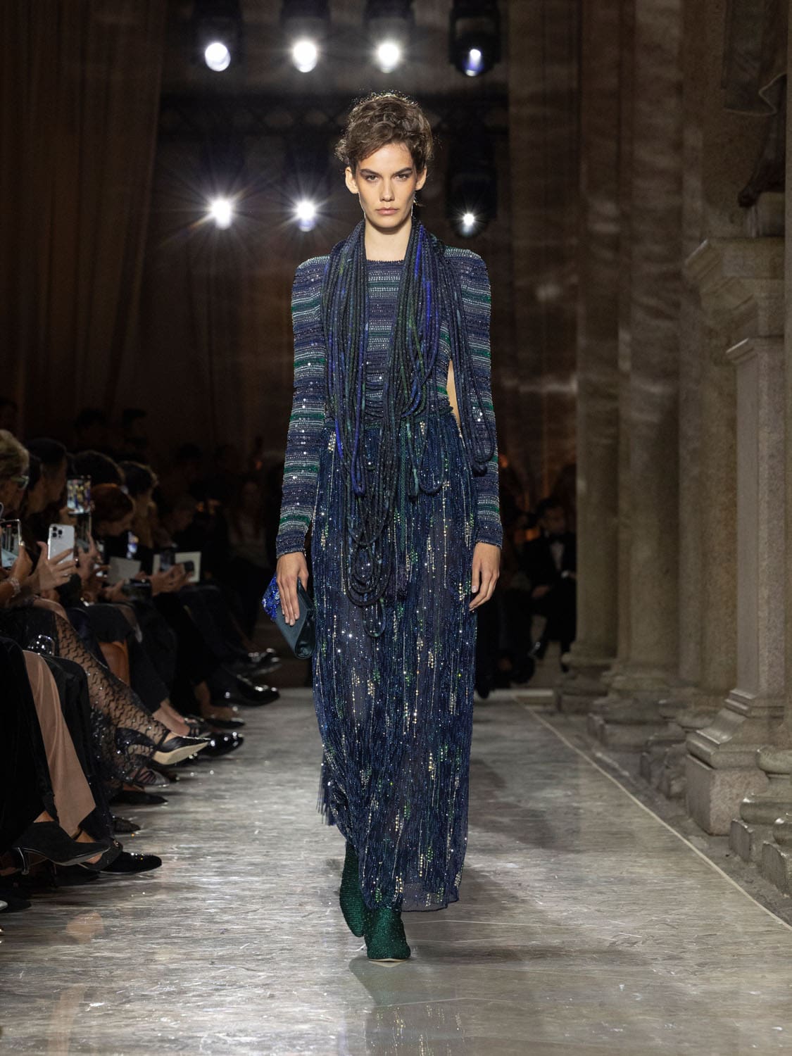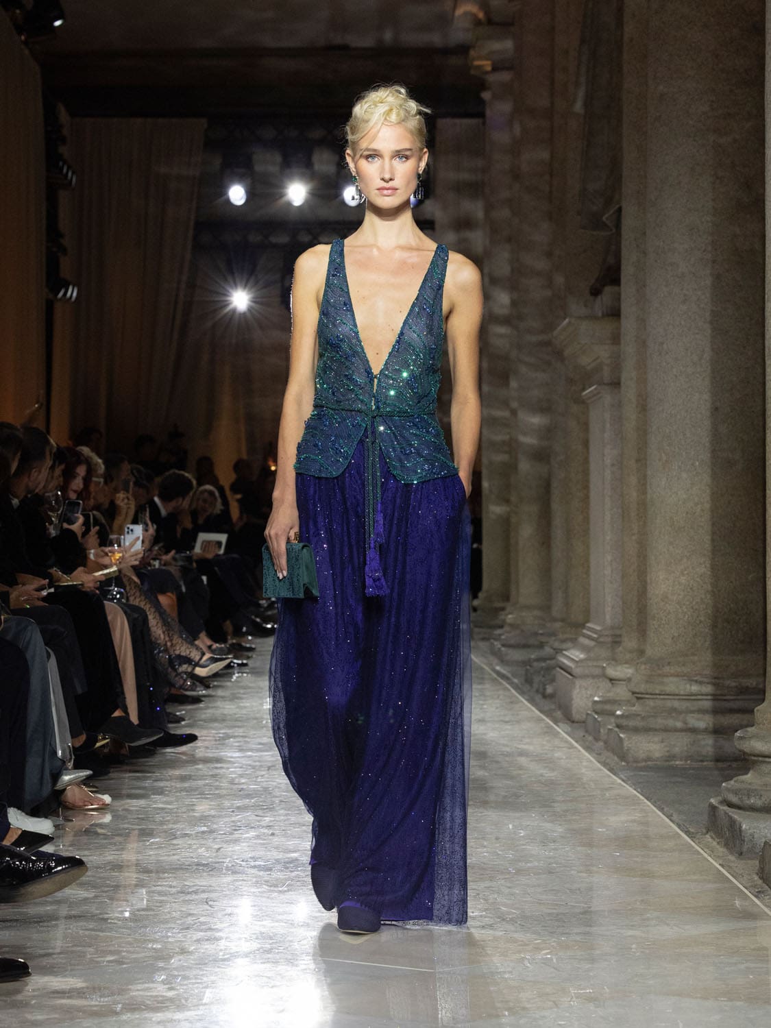 Colours shifted like landscapes at dusk and dawn, from earthy neutrals to deep nocturnal blues, interrupted by flashes of jewel tones that caught the eye like sun on water. Nothing was rigid; everything was fluid, designed to yield and flow. It was Armani’s eternal paradox: strength expressed through weightlessness, a powerful statement through garments that feel almost like air.