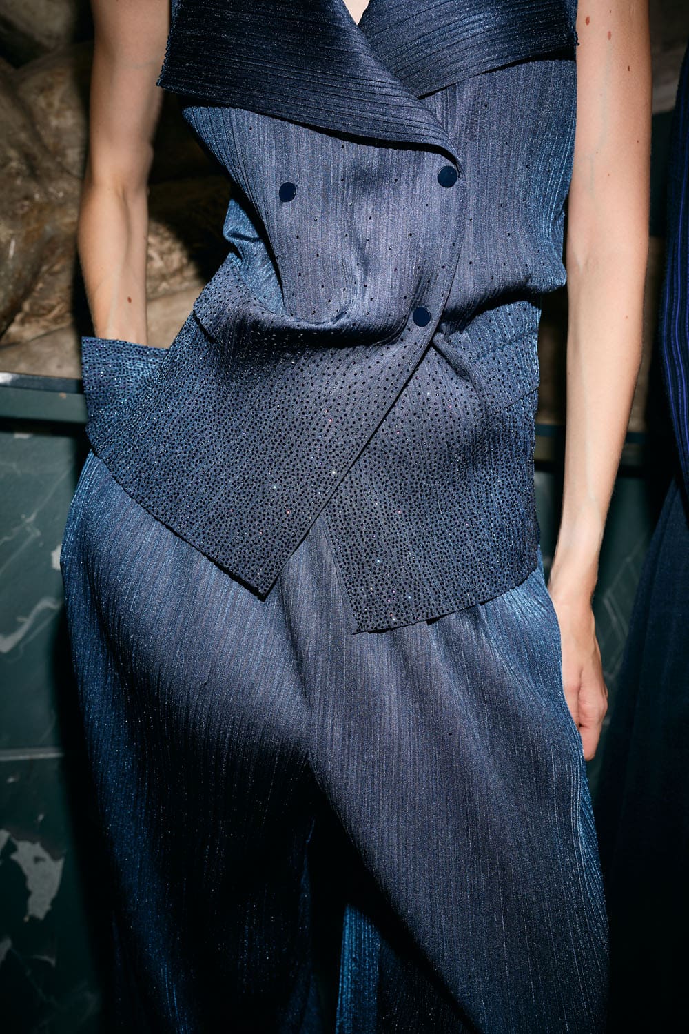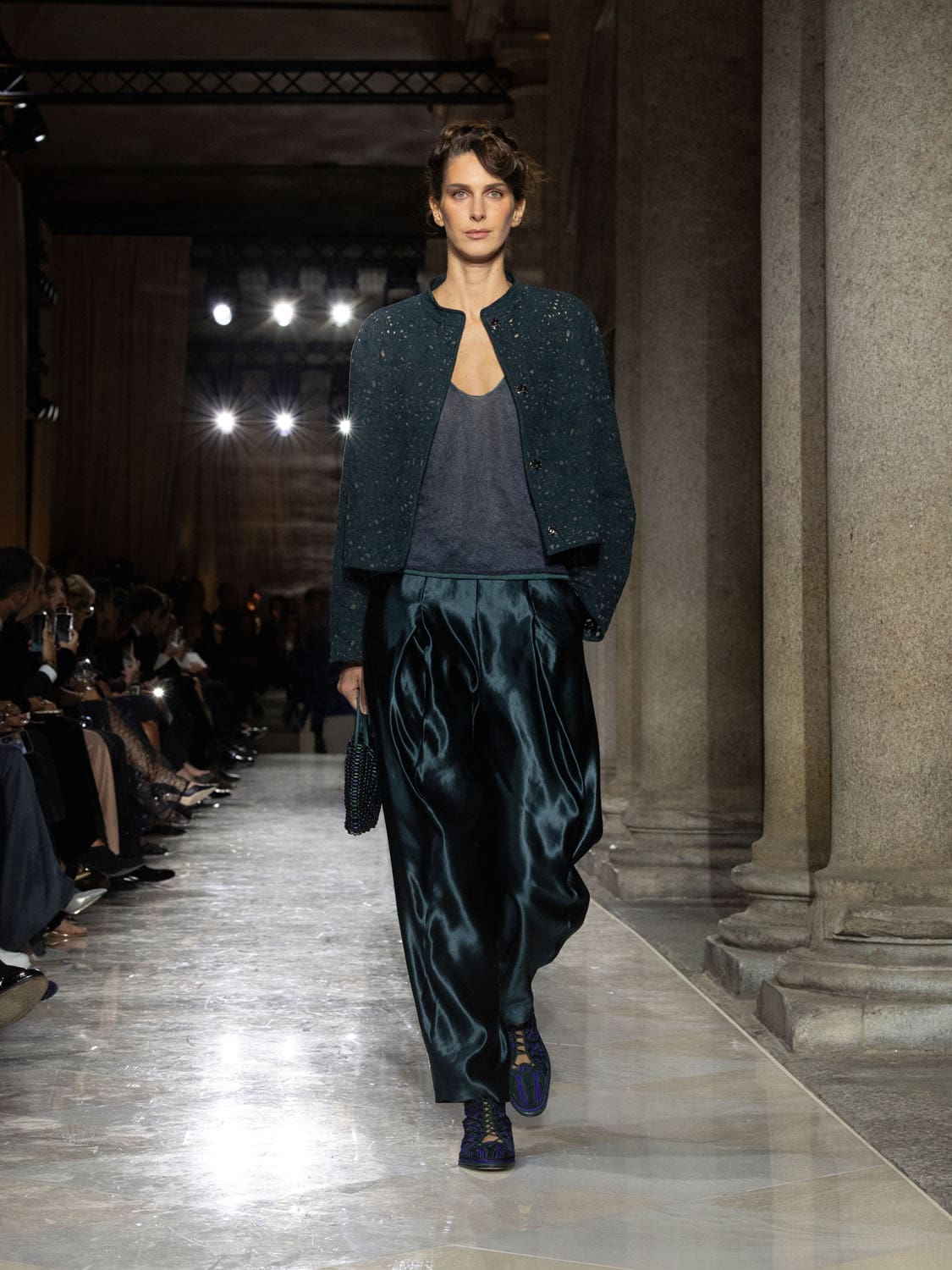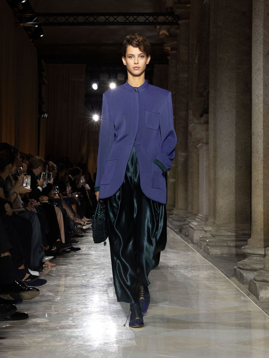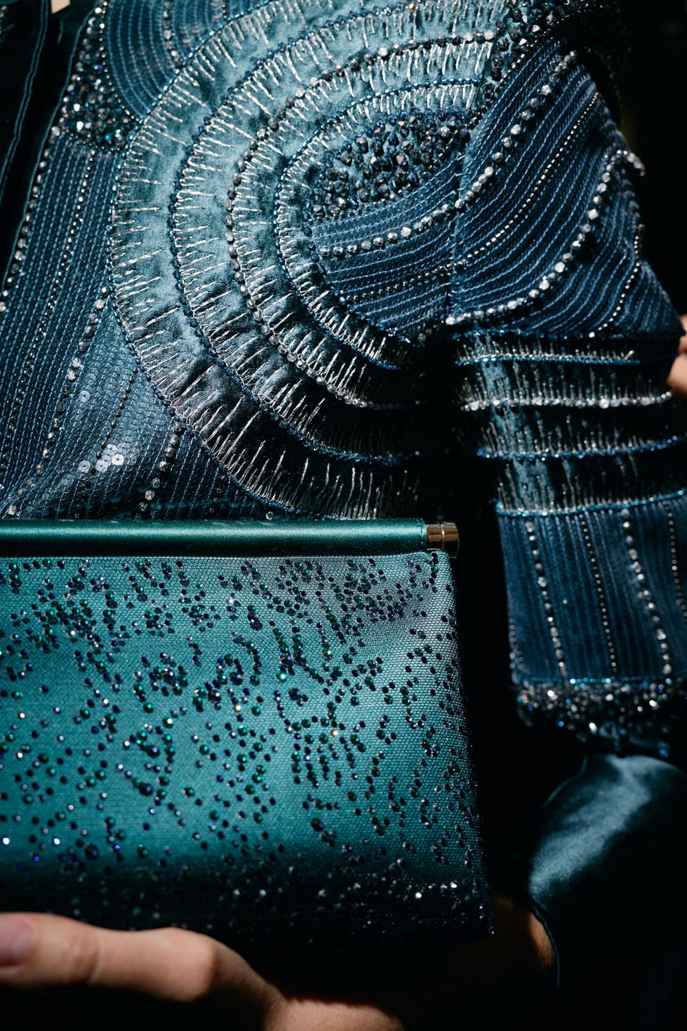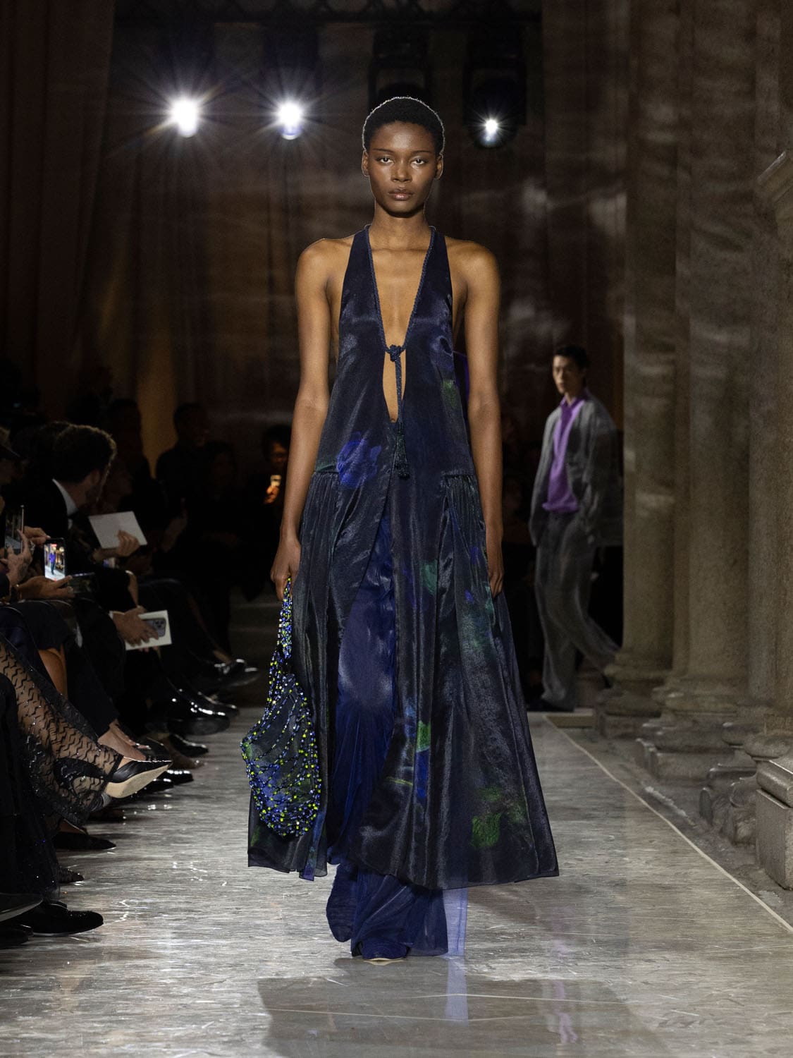 Colours shifted like landscapes at dusk and dawn, from earthy neutrals to deep nocturnal blues, interrupted by flashes of jewel tones that caught the eye like sun on water. Nothing was rigid; everything was fluid, designed to yield and flow. It was Armani’s eternal paradox: strength expressed through weightlessness, a powerful statement through garments that feel almost like air.