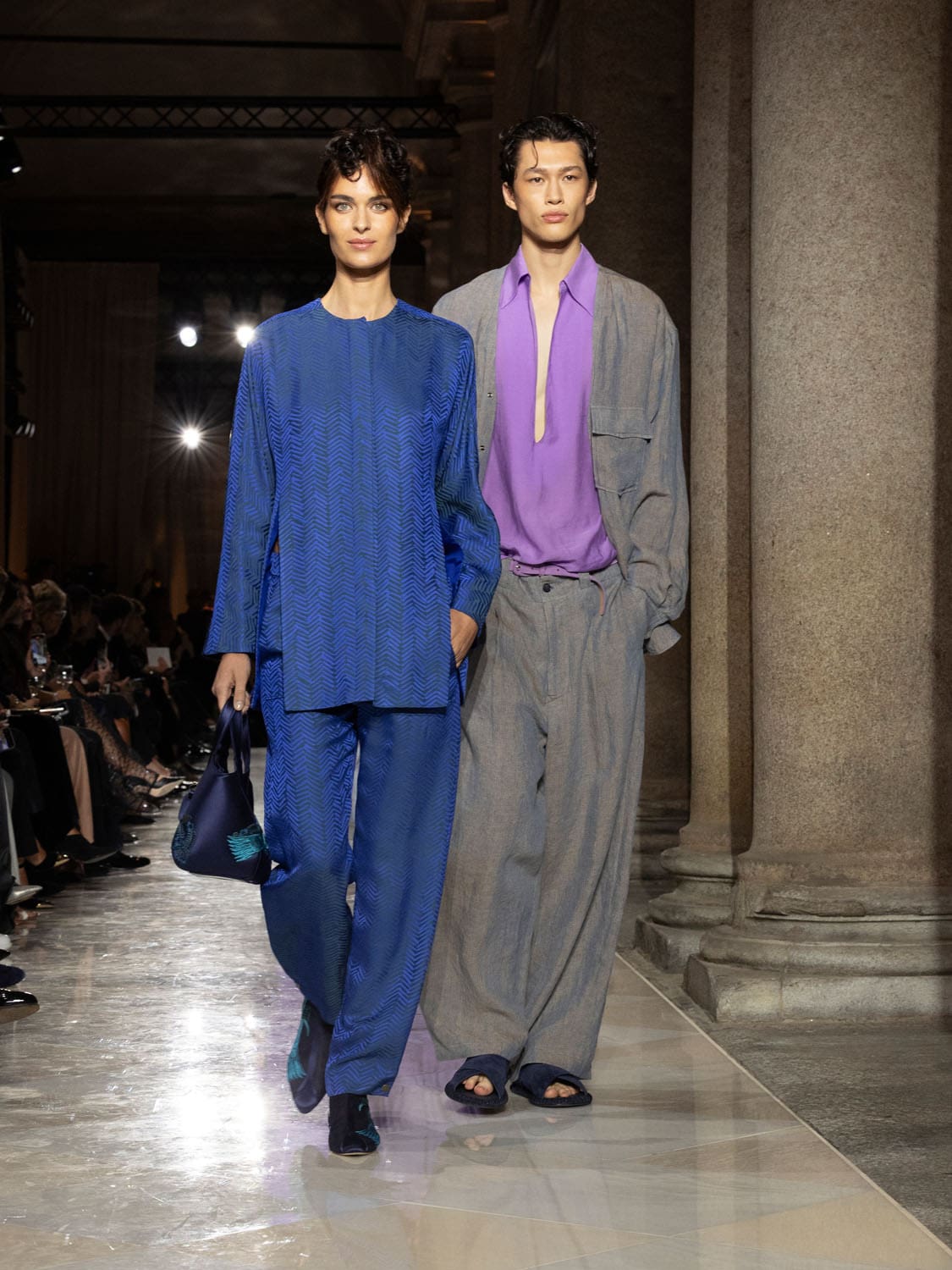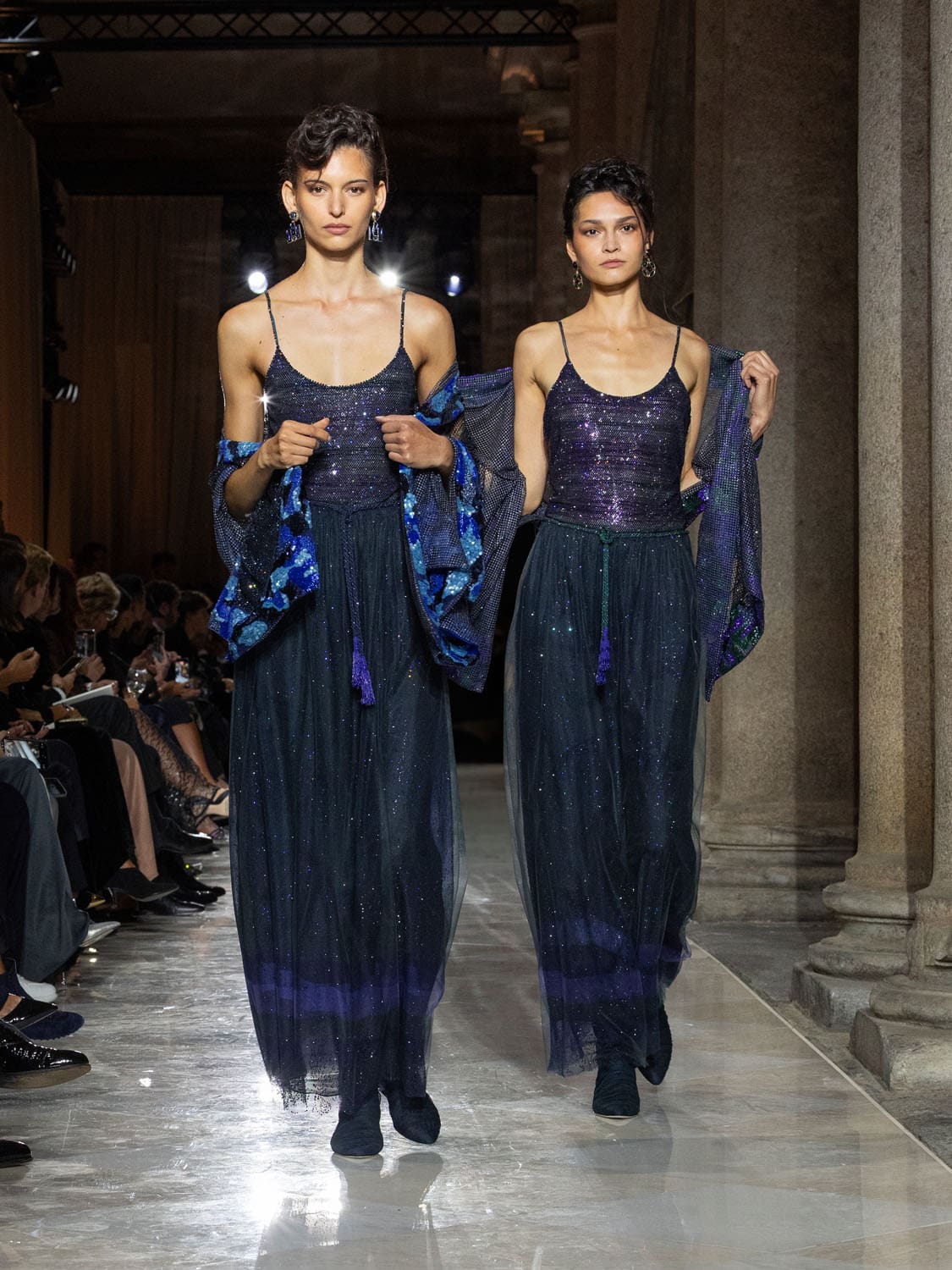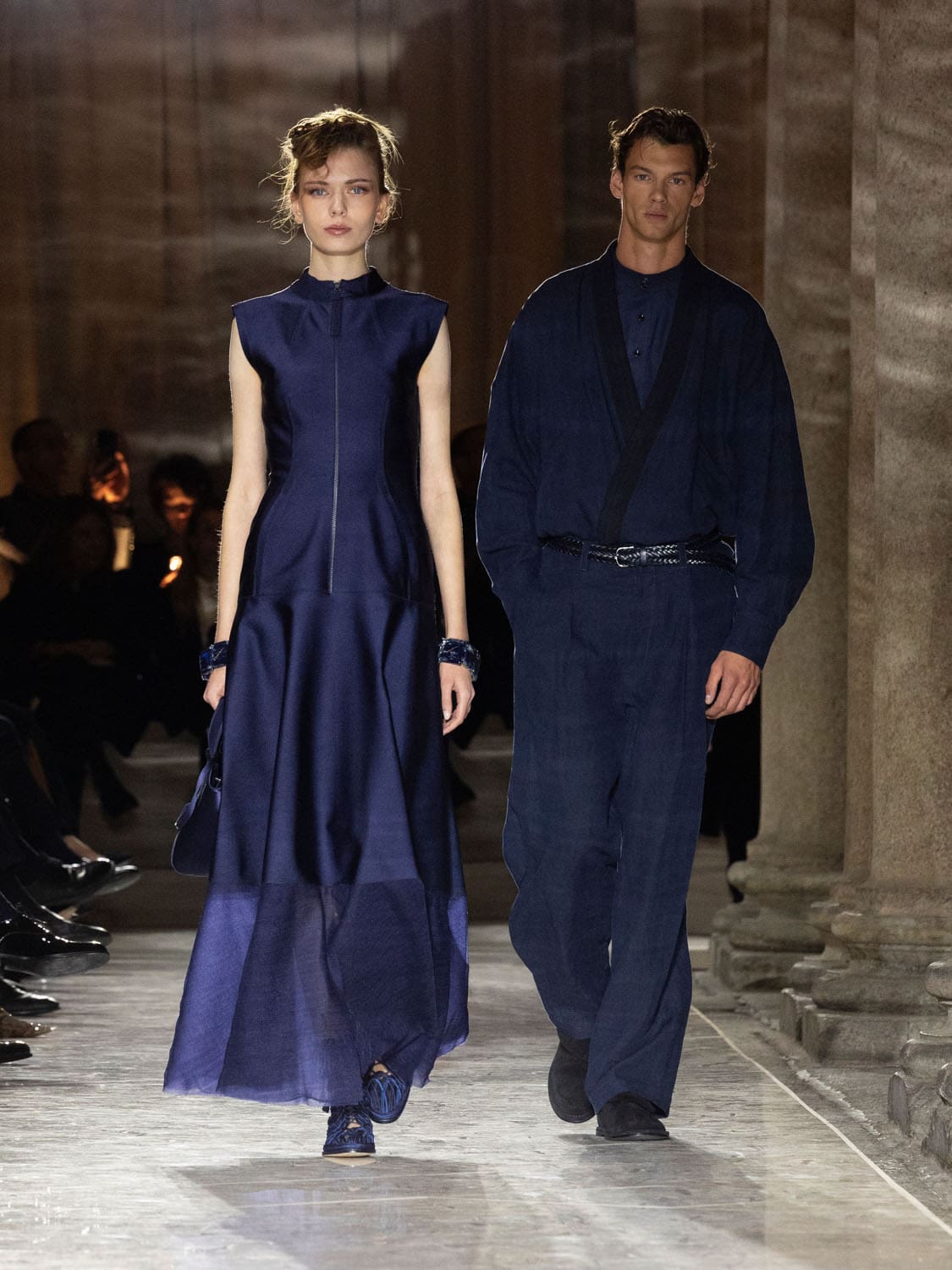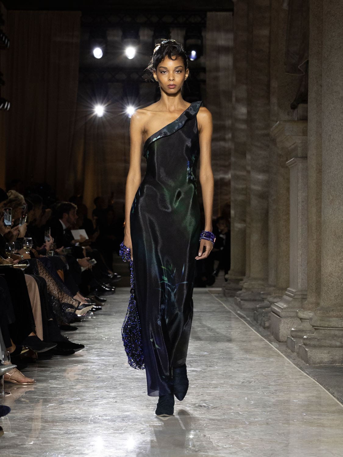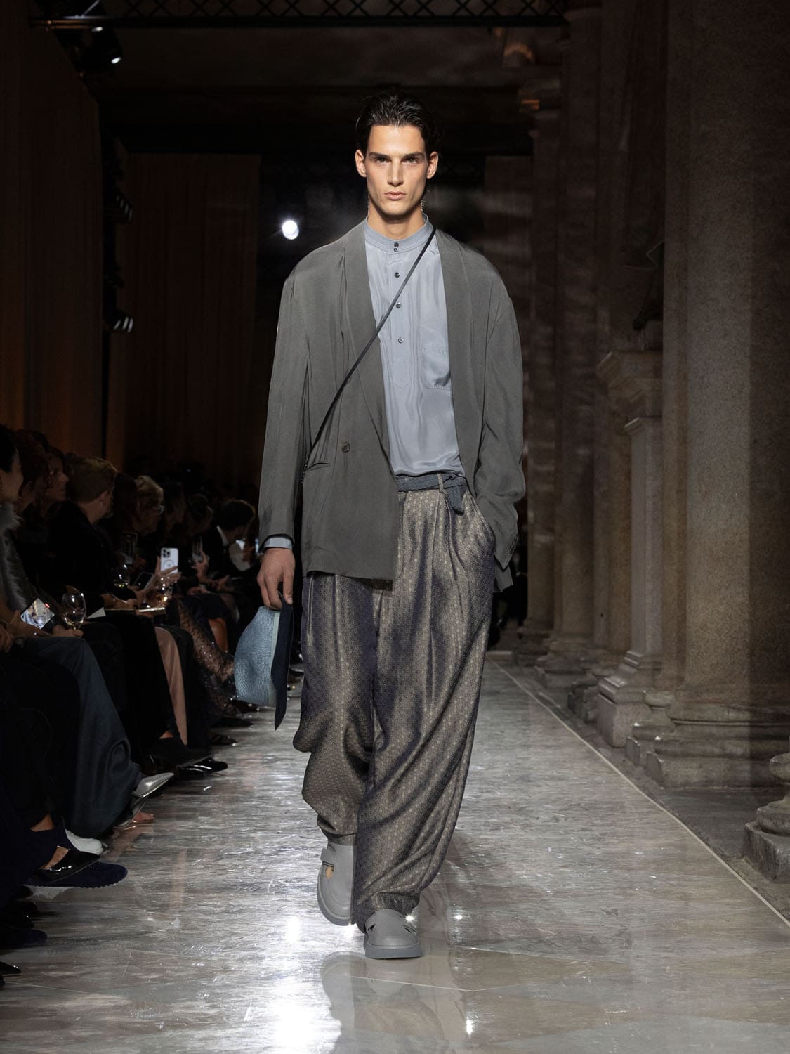 Colours shifted like landscapes at dusk and dawn, from earthy neutrals to deep nocturnal blues, interrupted by flashes of jewel tones that caught the eye like sun on water. Nothing was rigid; everything was fluid, designed to yield and flow. It was Armani’s eternal paradox: strength expressed through weightlessness, a powerful statement through garments that feel almost like air.