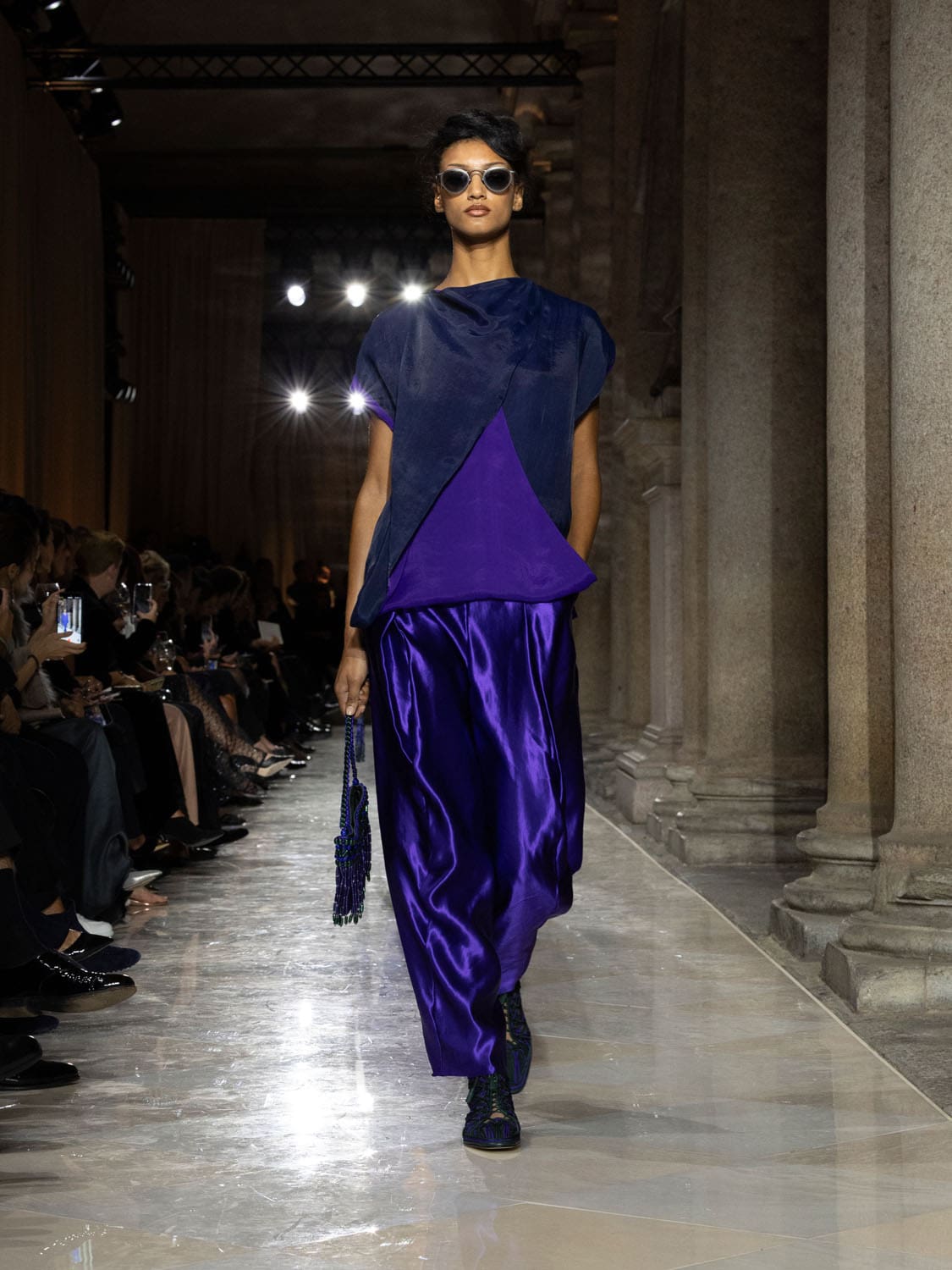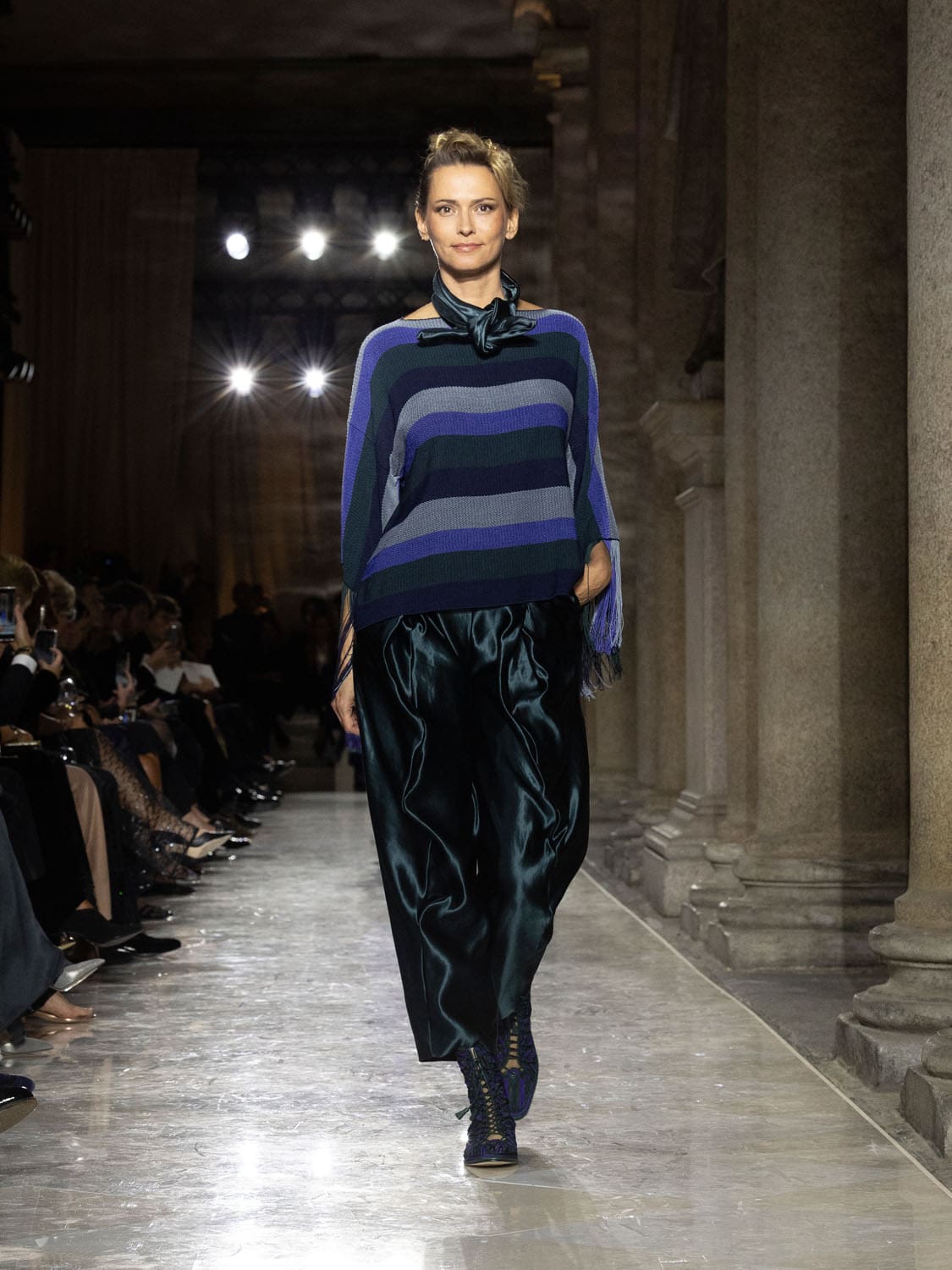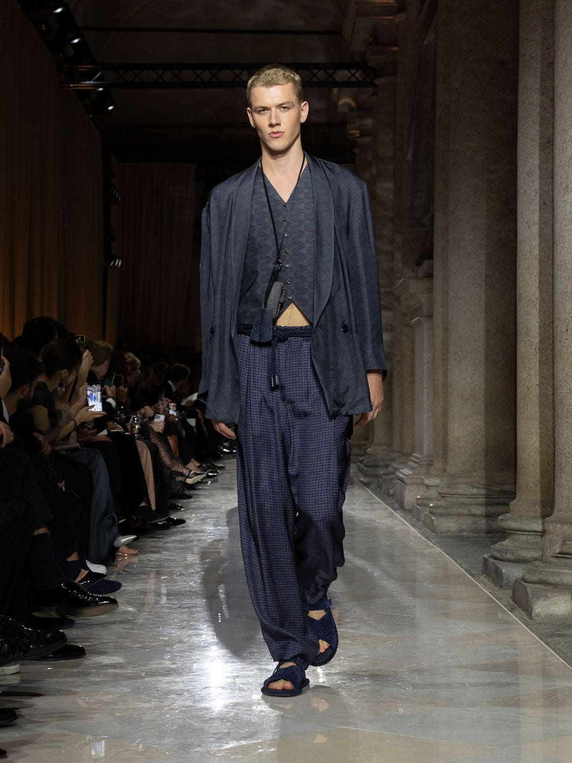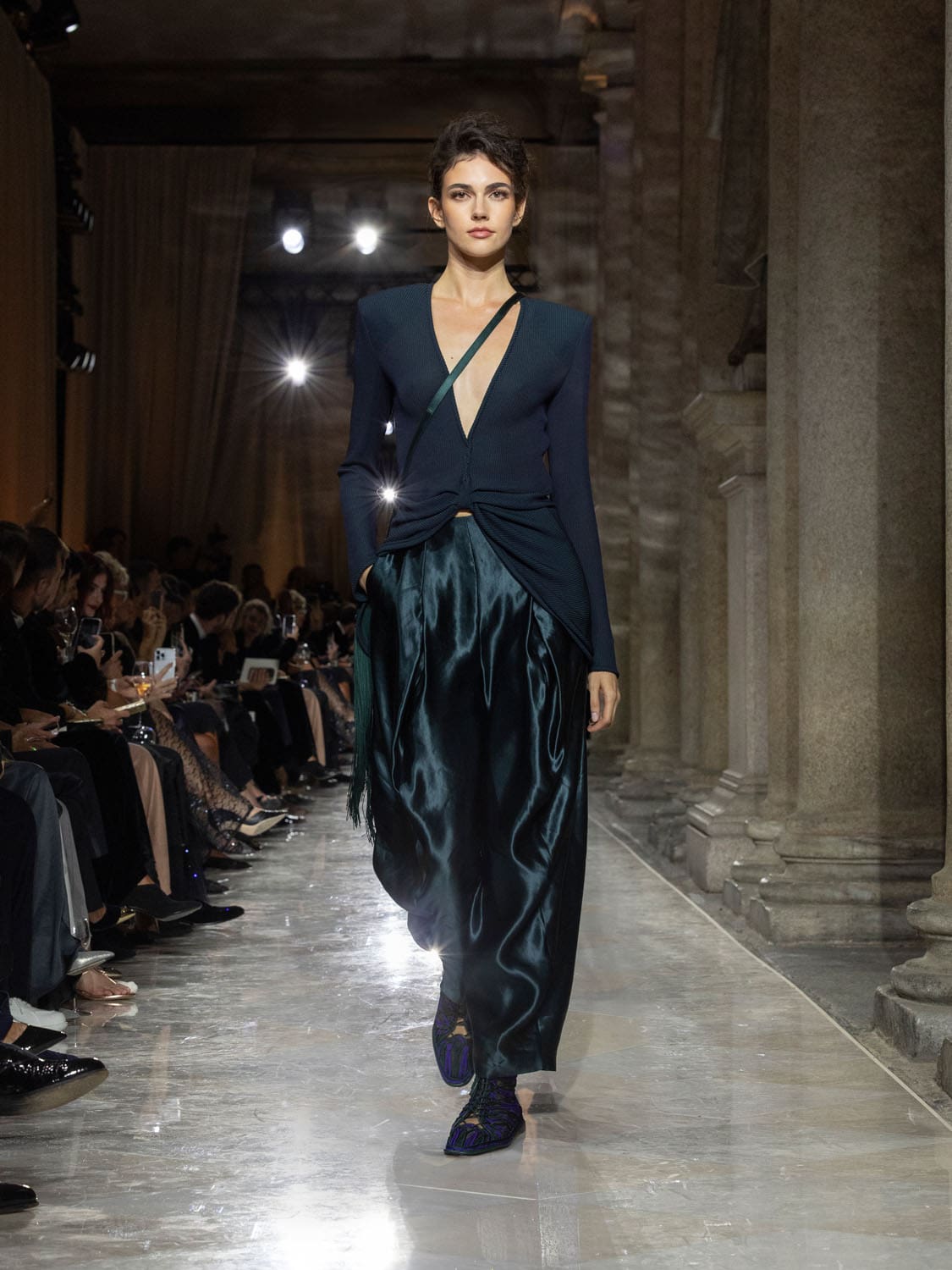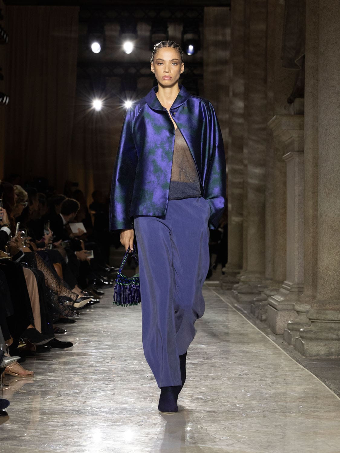 Colours shifted like landscapes at dusk and dawn, from earthy neutrals to deep nocturnal blues, interrupted by flashes of jewel tones that caught the eye like sun on water. Nothing was rigid; everything was fluid, designed to yield and flow. It was Armani’s eternal paradox: strength expressed through weightlessness, a powerful statement through garments that feel almost like air.