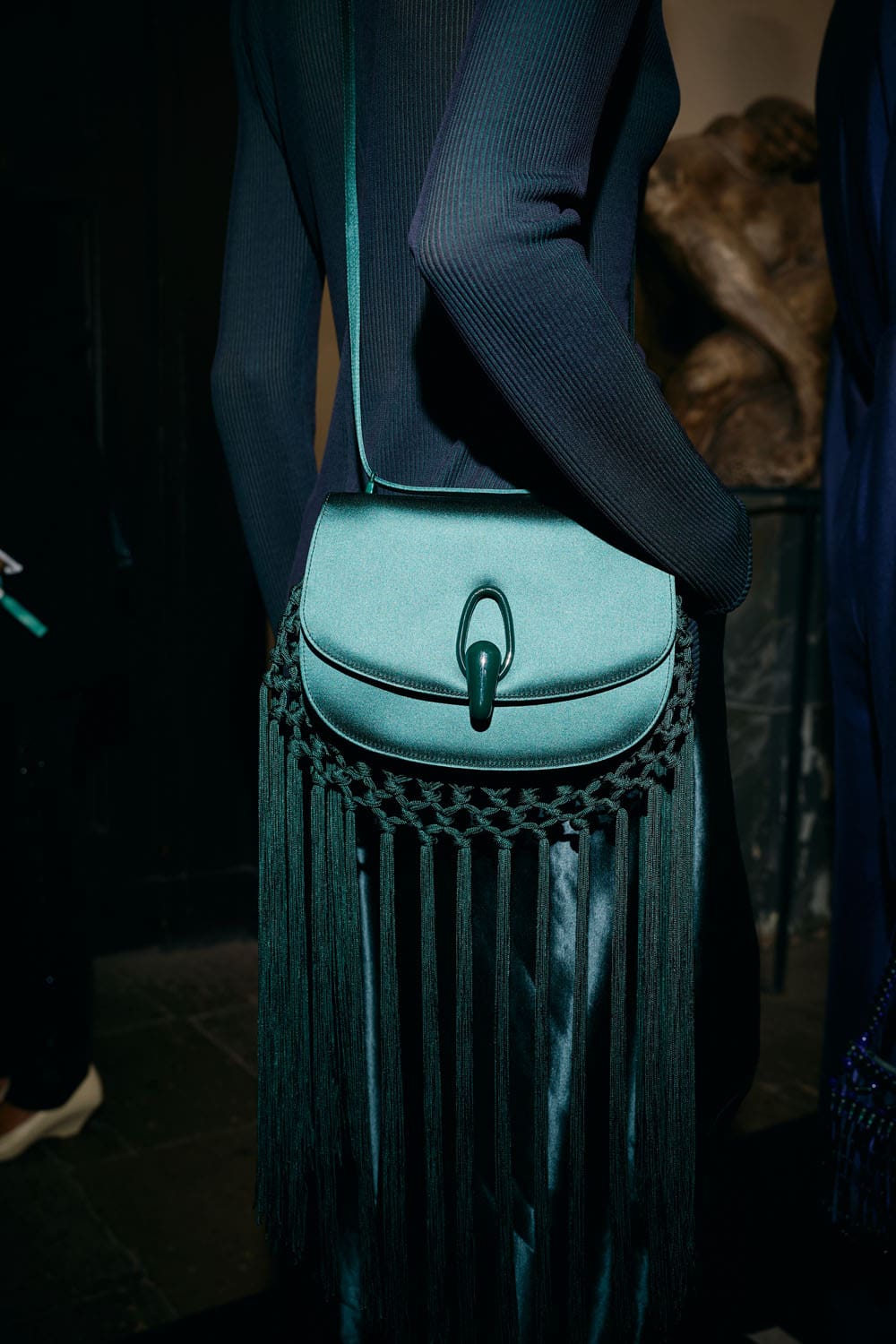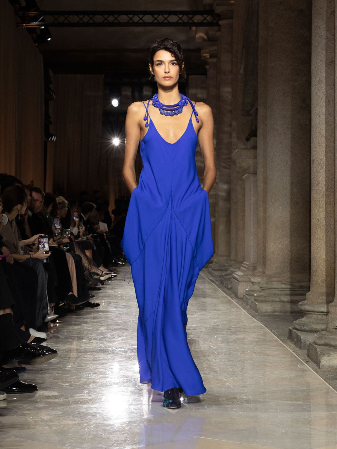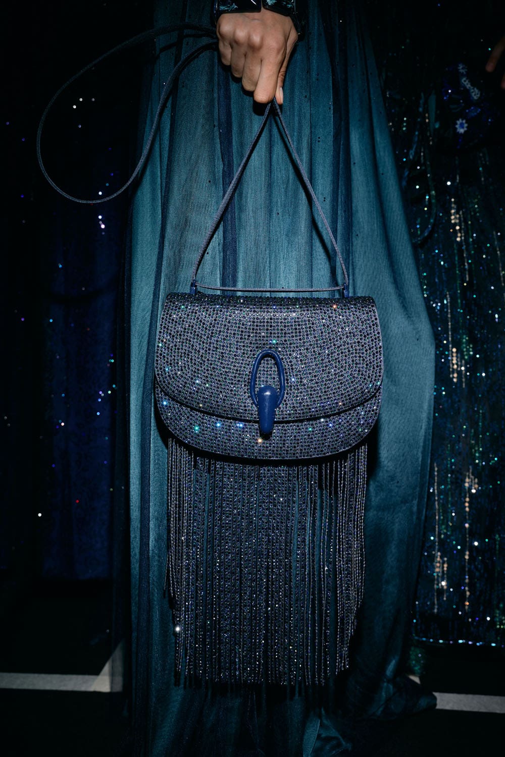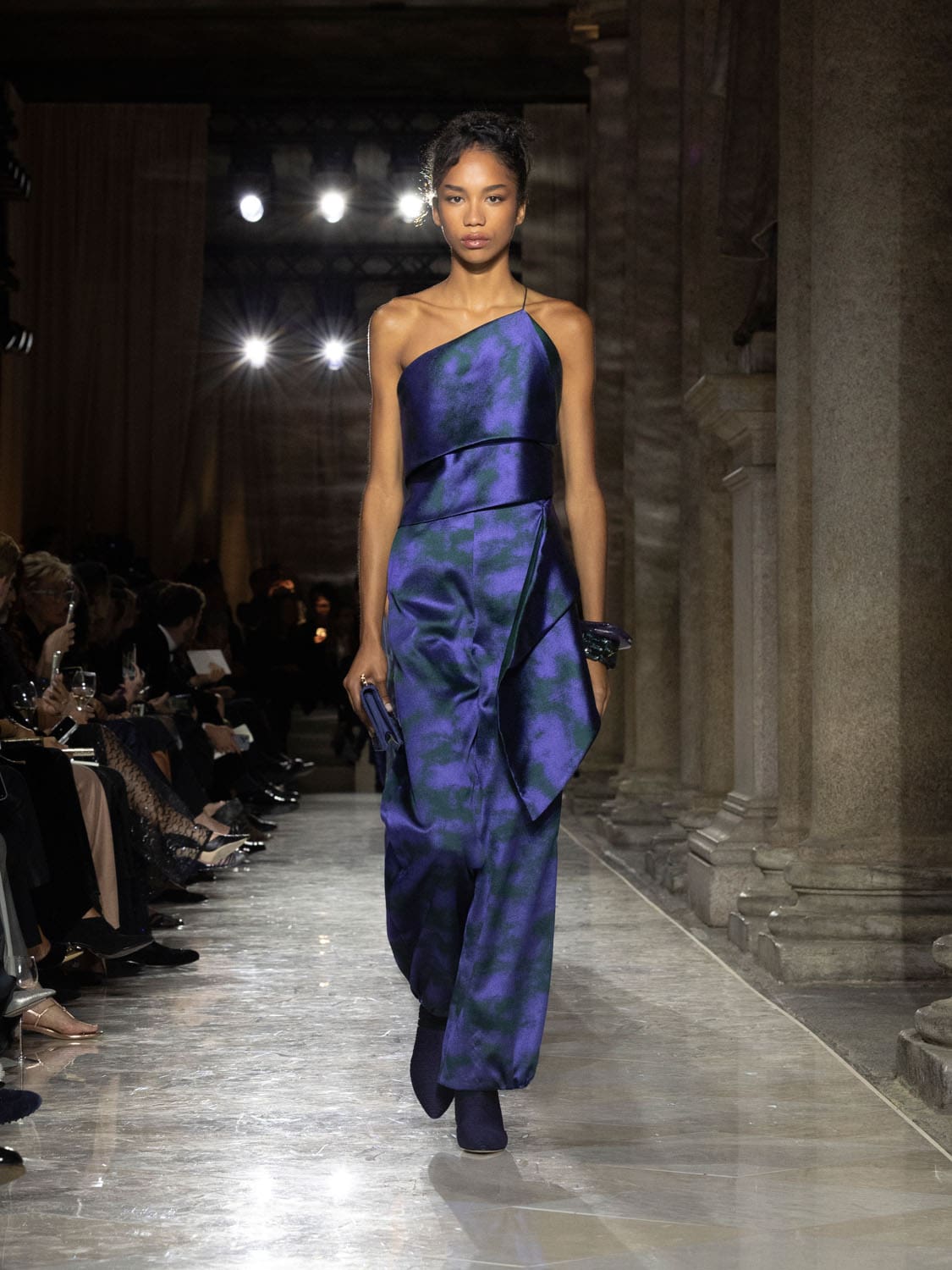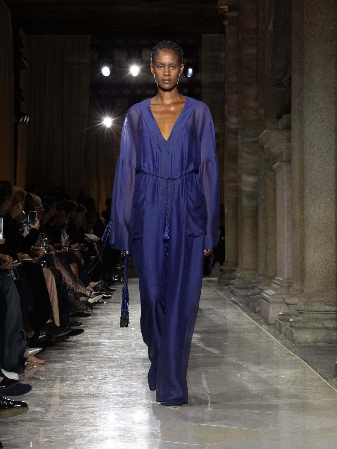 Colours shifted like landscapes at dusk and dawn, from earthy neutrals to deep nocturnal blues, interrupted by flashes of jewel tones that caught the eye like sun on water. Nothing was rigid; everything was fluid, designed to yield and flow. It was Armani’s eternal paradox: strength expressed through weightlessness, a powerful statement through garments that feel almost like air.