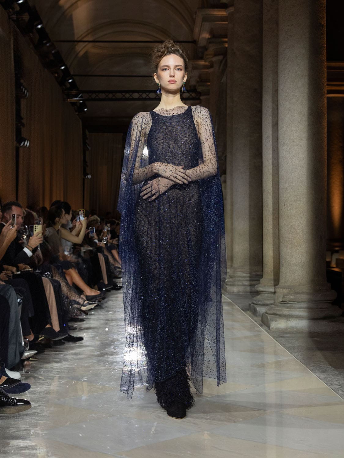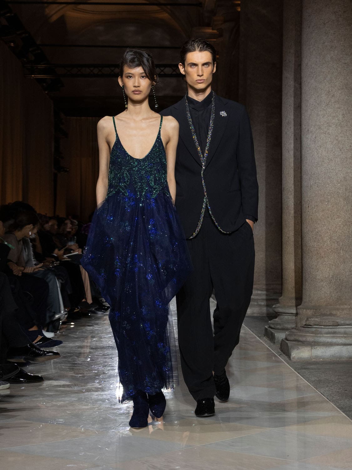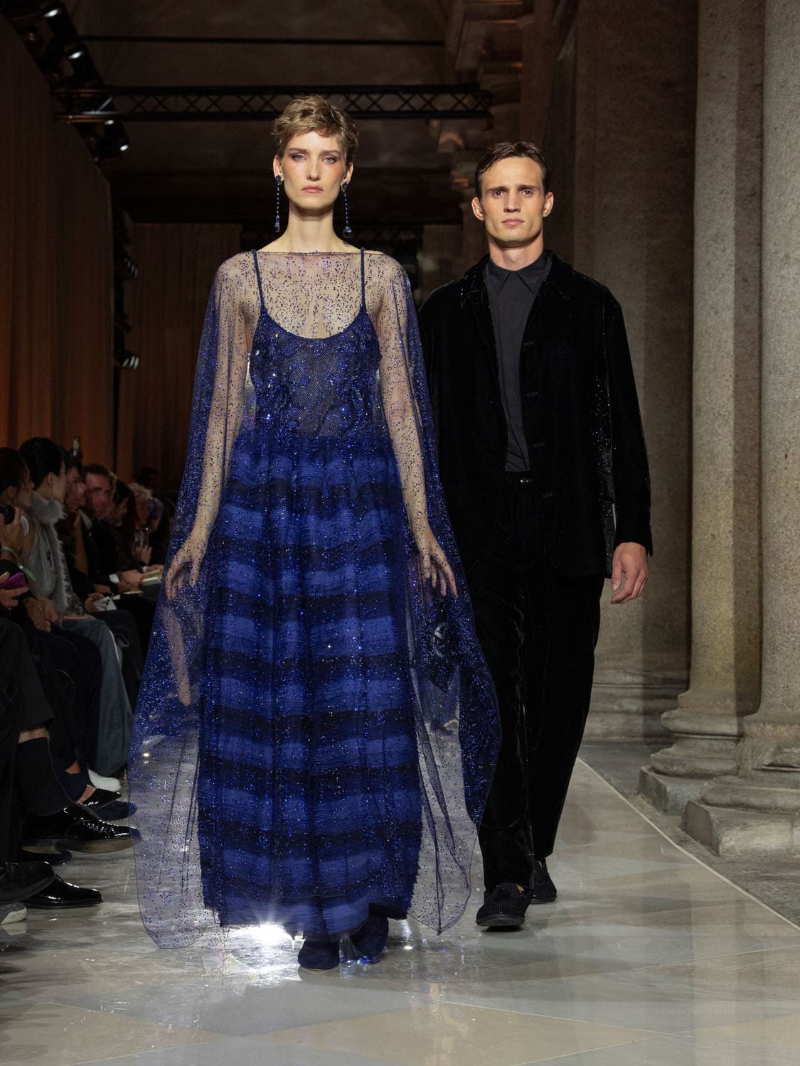 In its gestures, the collection felt less like clothing and more like a language of farewell. Dresses of gossamer lightness seemed conceived to disappear into memory, while tailored jackets carried the discipline of his Milanese atelier. The emotional cadence of the evening built on contrasts—fluidity against structure, memory against future, a cycle closing so that new ones may begin.