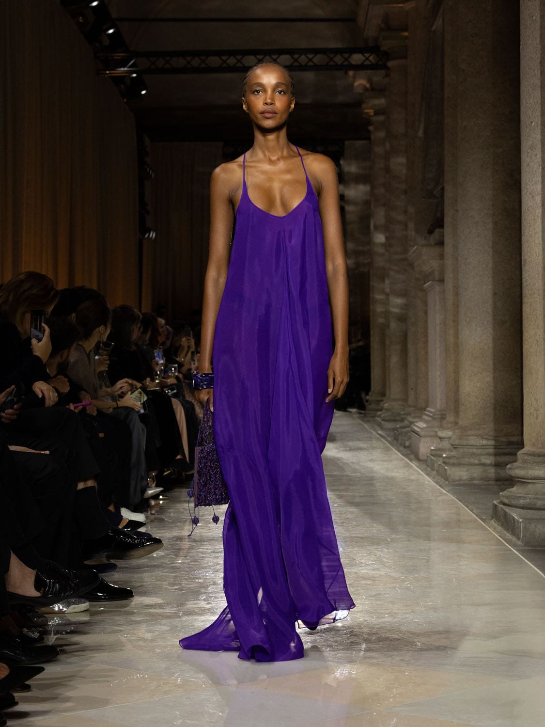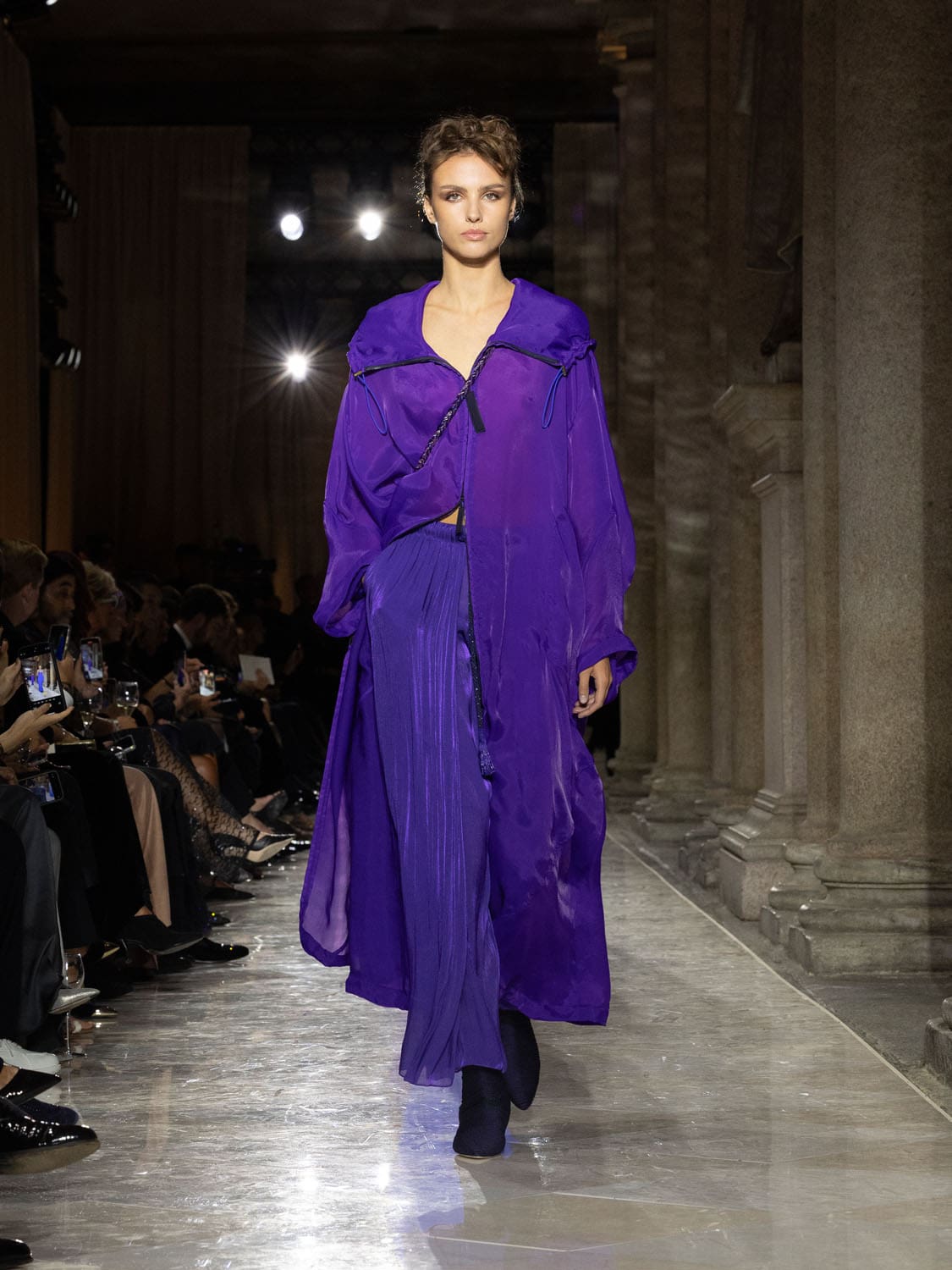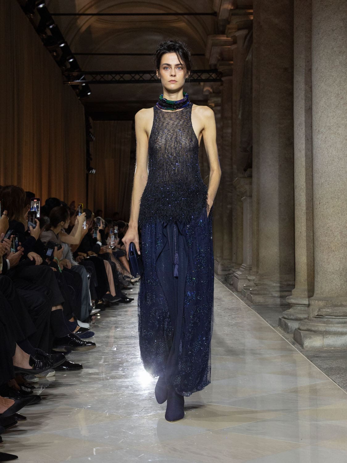 In its gestures, the collection felt less like clothing and more like a language of farewell. Dresses of gossamer lightness seemed conceived to disappear into memory, while tailored jackets carried the discipline of his Milanese atelier. The emotional cadence of the evening built on contrasts—fluidity against structure, memory against future, a cycle closing so that new ones may begin.