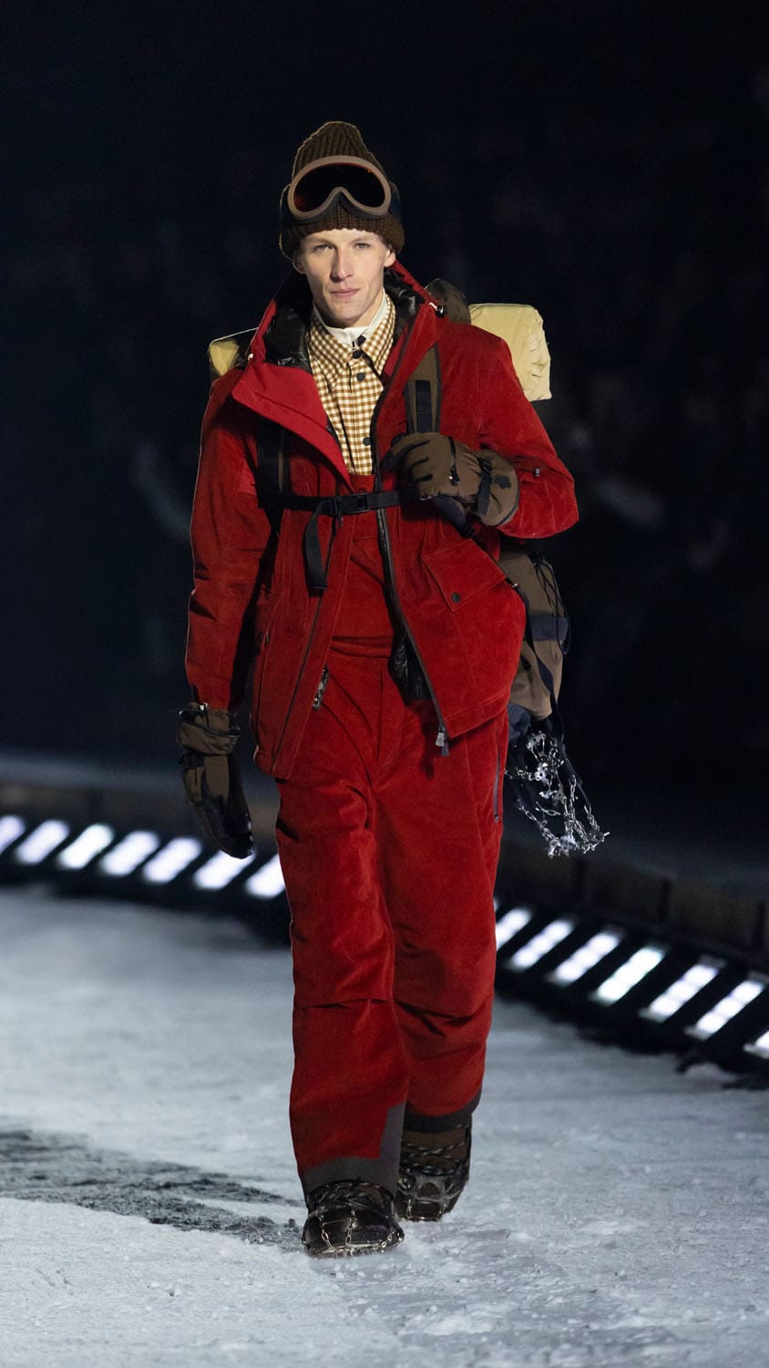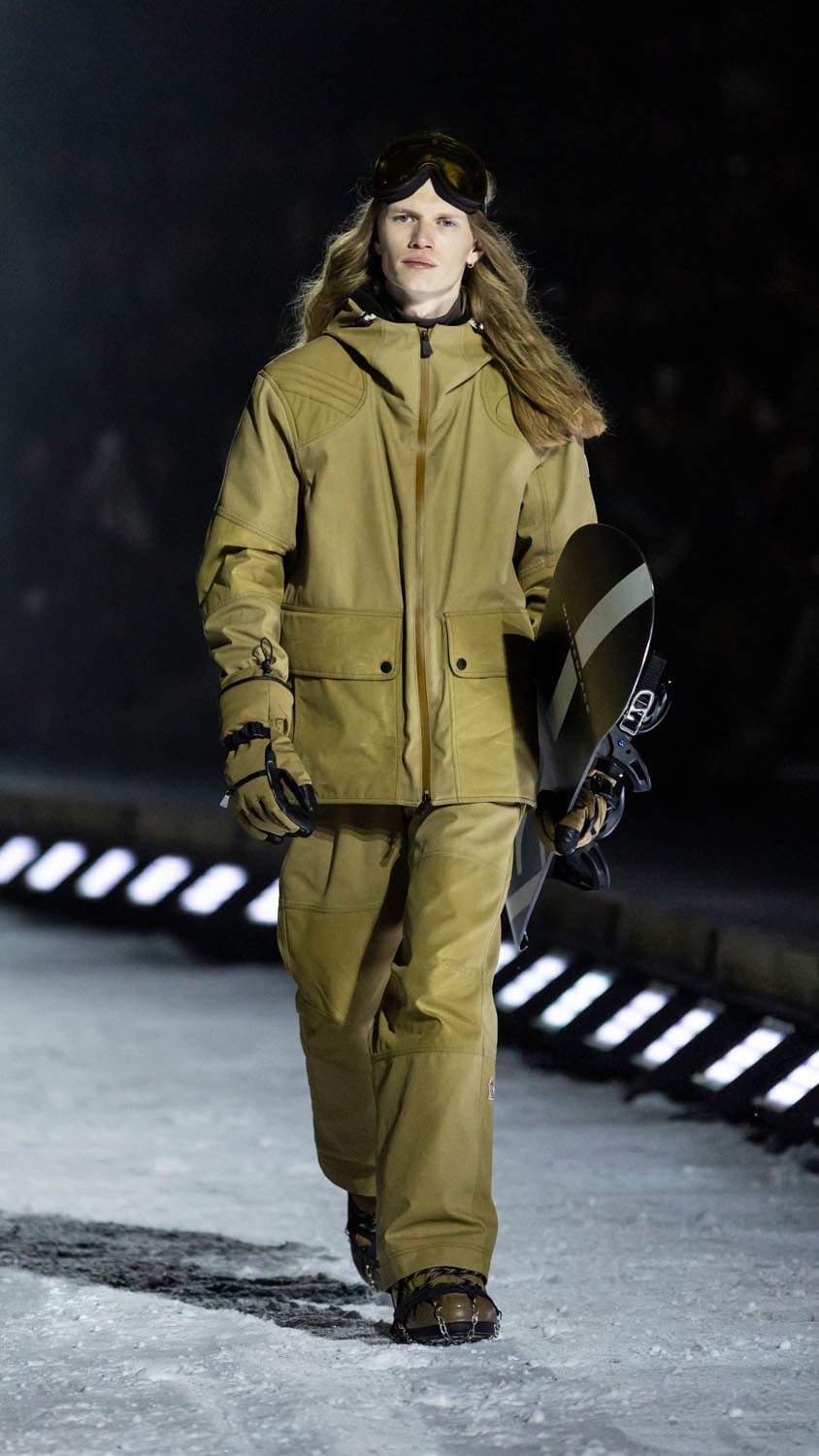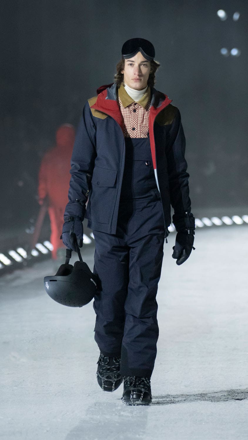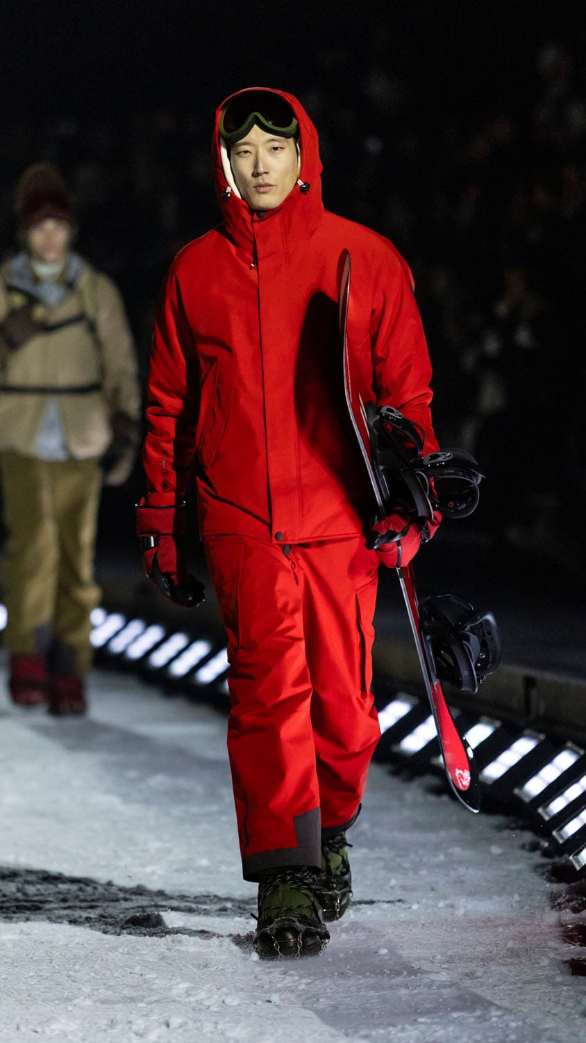 In a twilight procession through snow-laden woods, models emerged from the silence, riding snowmobiles into an amphitheater of frozen poetry. A luminous ballet of light projections played on alpine trees while clothing — no, garments of altitude — whispered of 1950s Aspen and European summits where legends once climbed.
