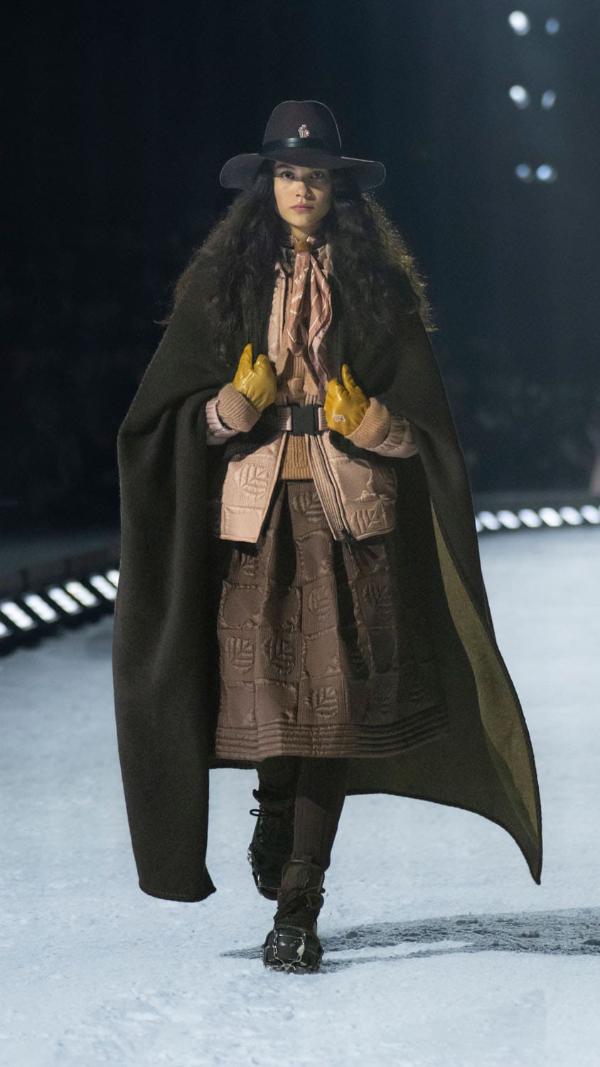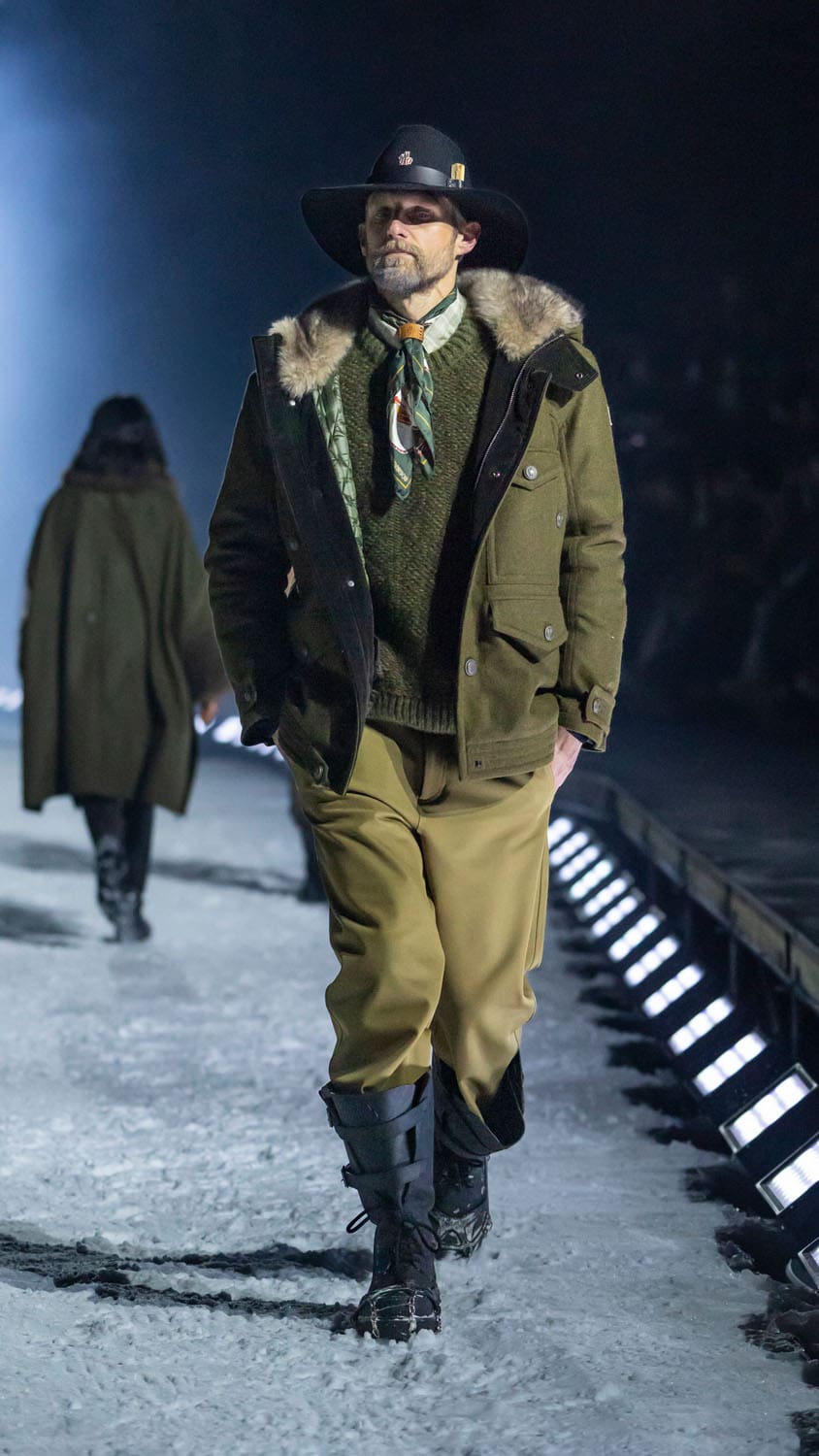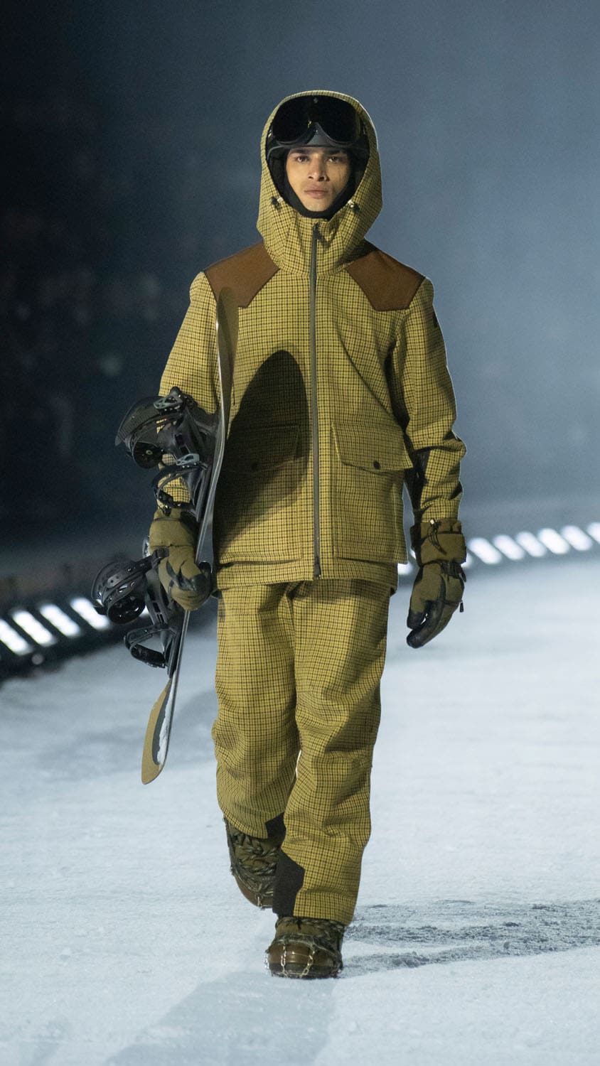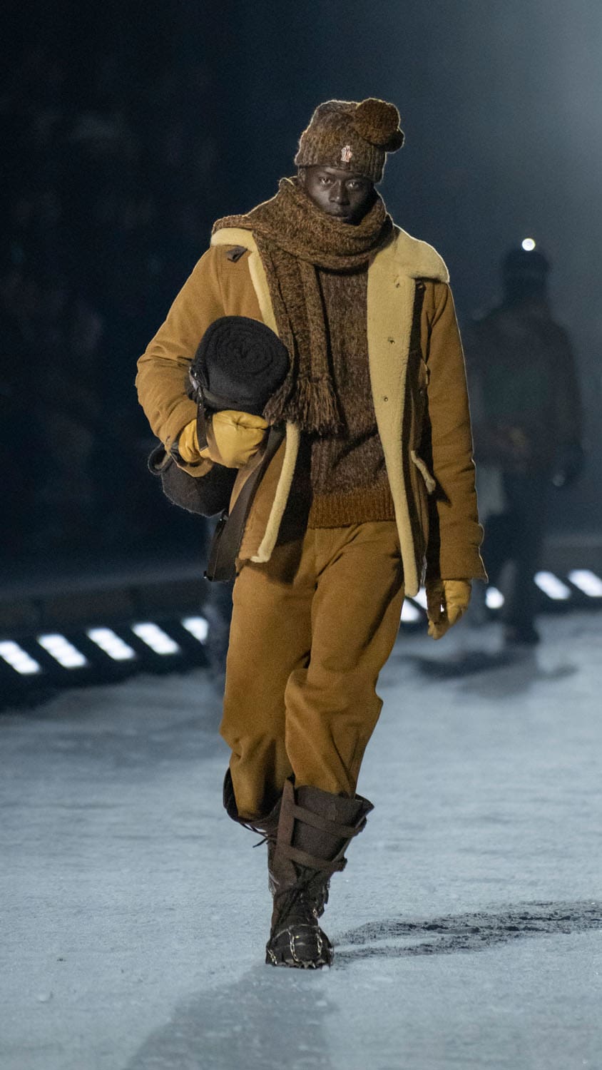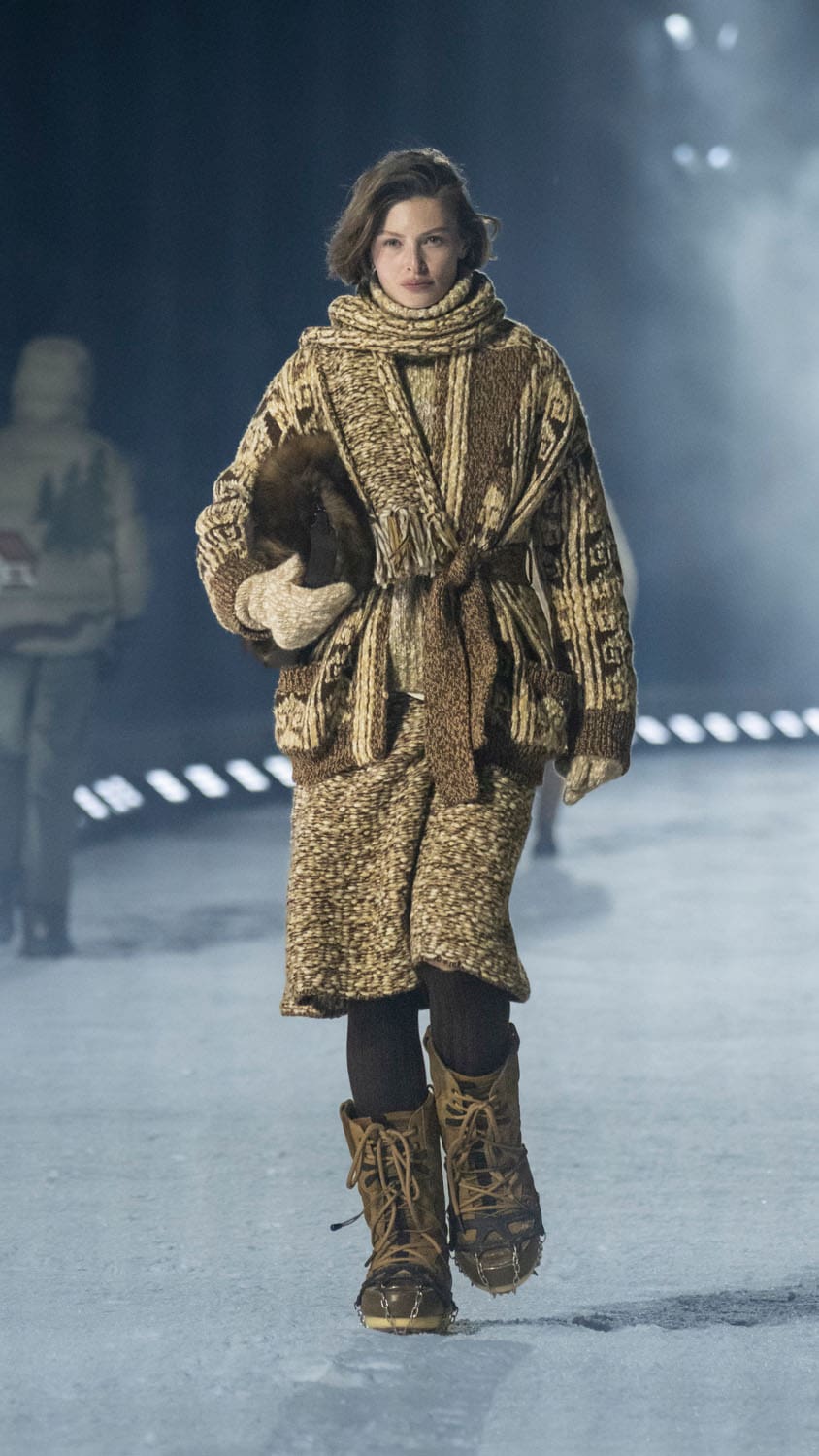In a twilight procession through snow-laden woods, models emerged from the silence, riding snowmobiles into an amphitheater of frozen poetry. A luminous ballet of light projections played on alpine trees while clothing — no, garments of altitude — whispered of 1950s Aspen and European summits where legends once climbed.