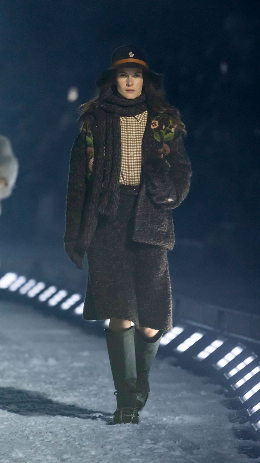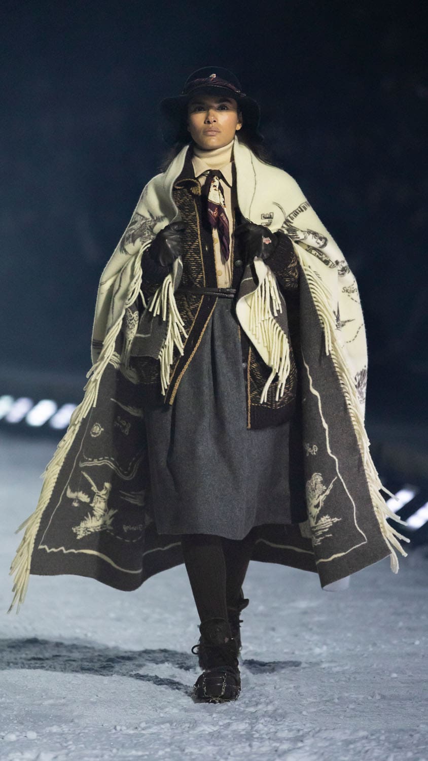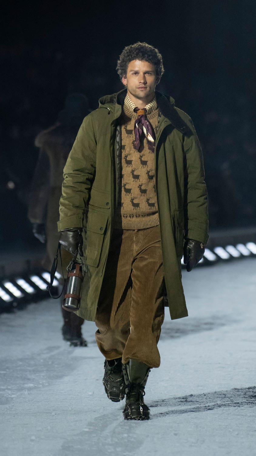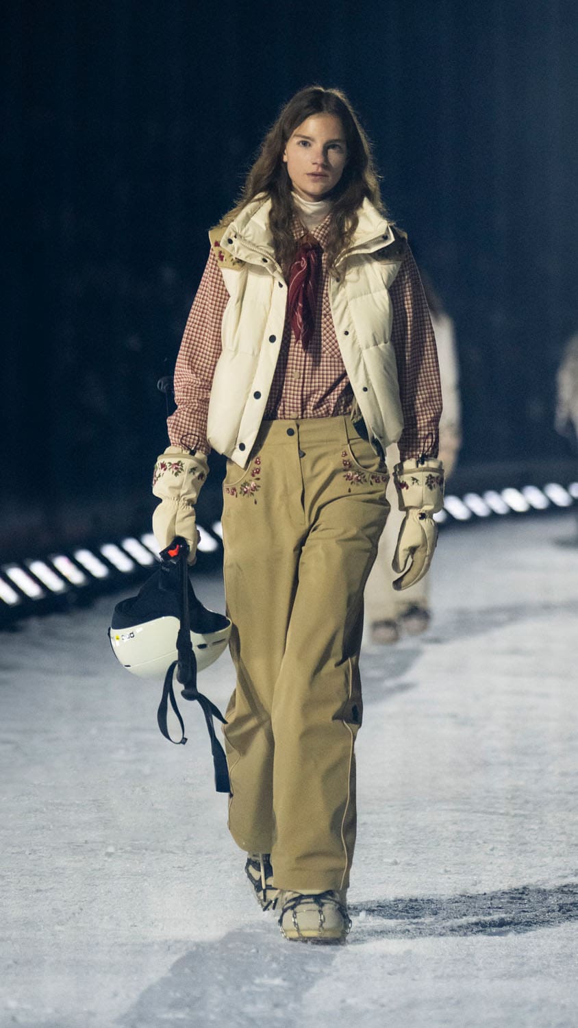 In a twilight procession through snow-laden woods, models emerged from the silence, riding snowmobiles into an amphitheater of frozen poetry. A luminous ballet of light projections played on alpine trees while clothing — no, garments of altitude — whispered of 1950s Aspen and European summits where legends once climbed.