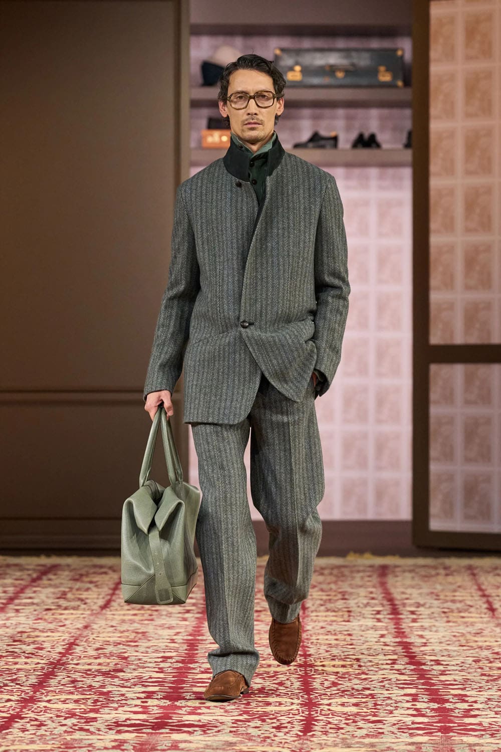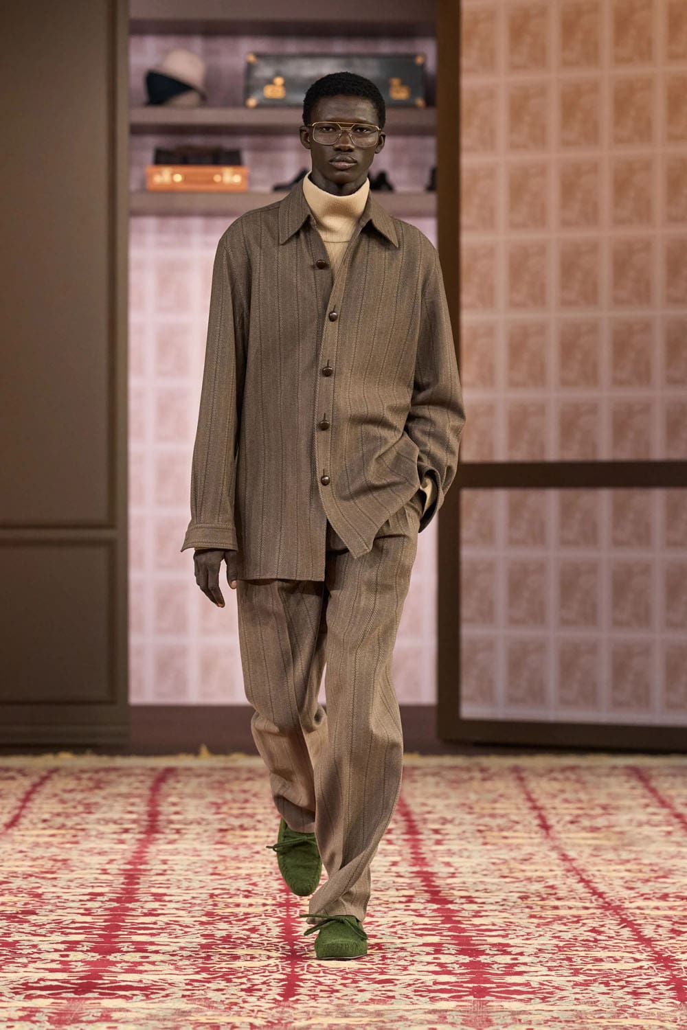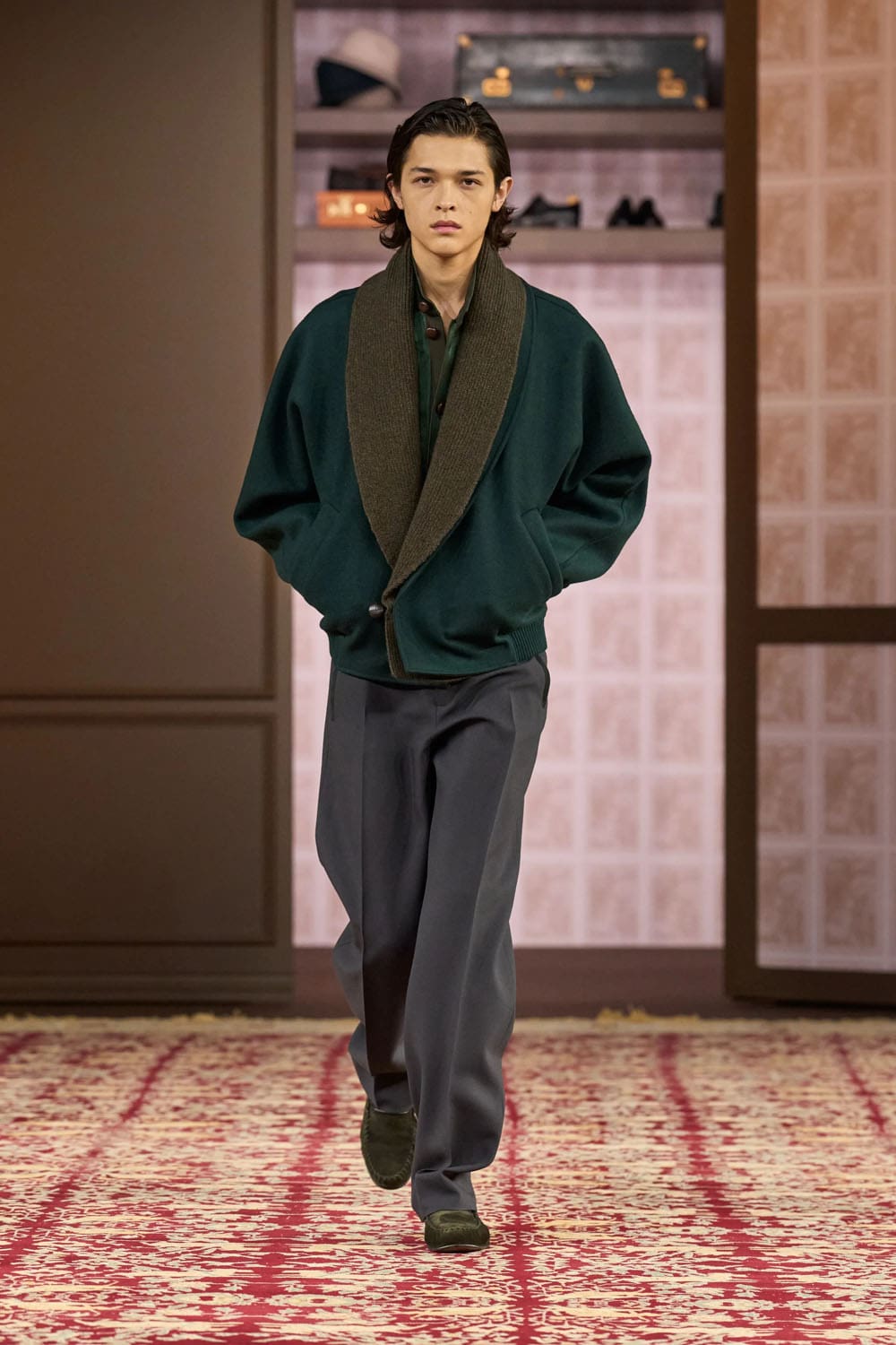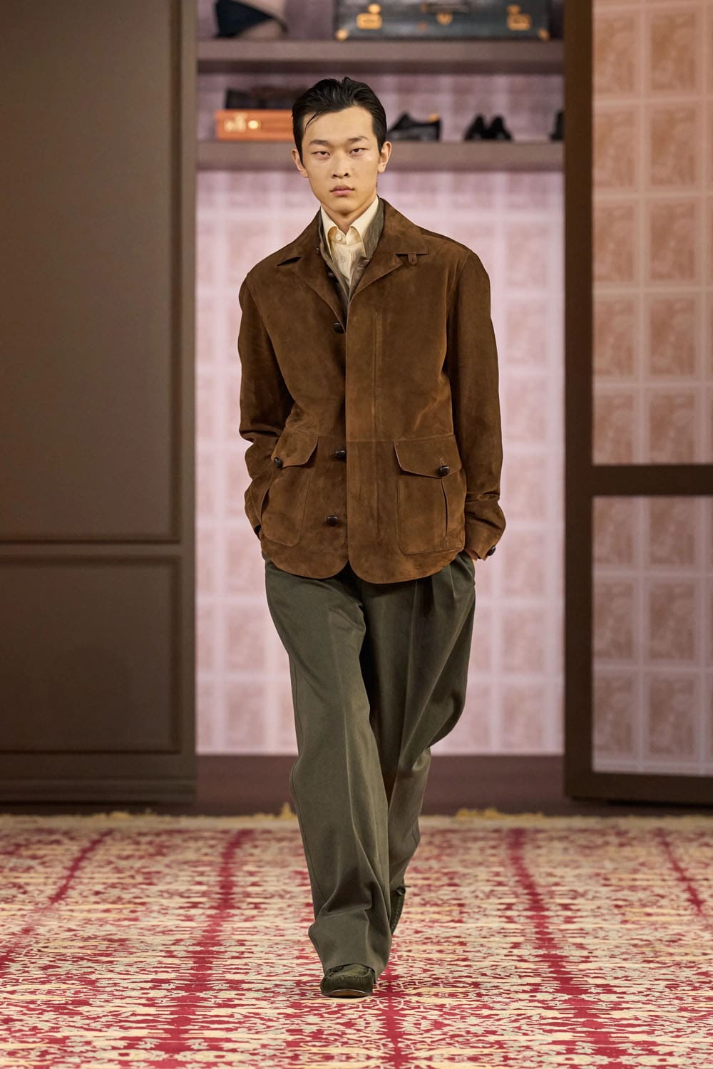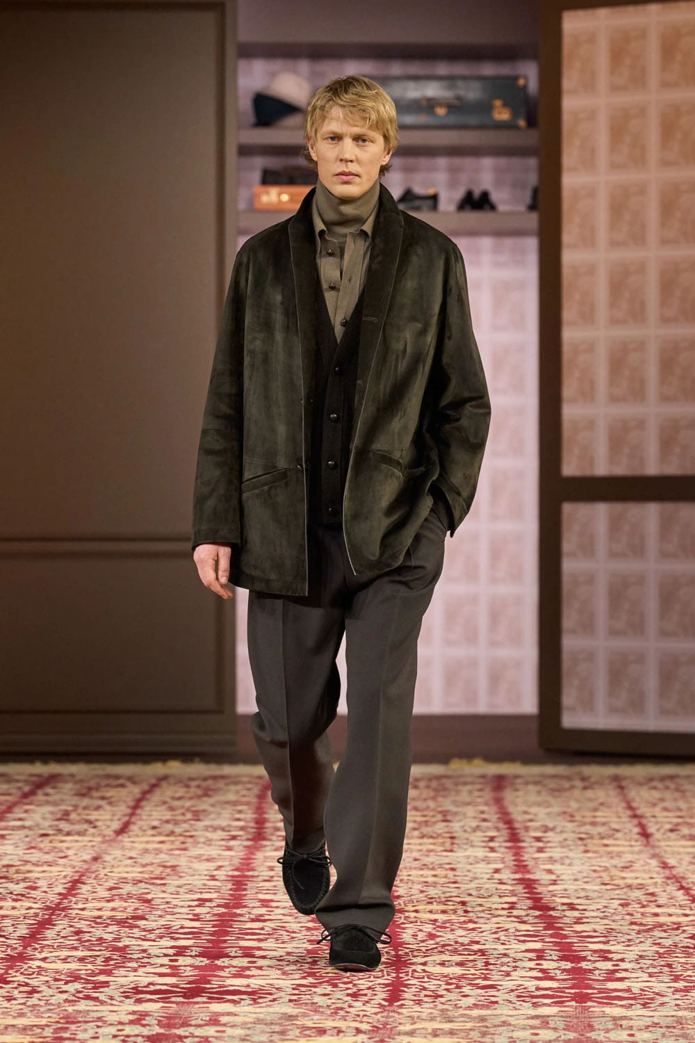 In the physical showspace, this inheritance was echoed by the presence of founder Ermenegildo Zegna’s original desk, his homburg hats, and even the brand’s first tailored jacket from 1930, preserved like a relic and reframed like a proposal.