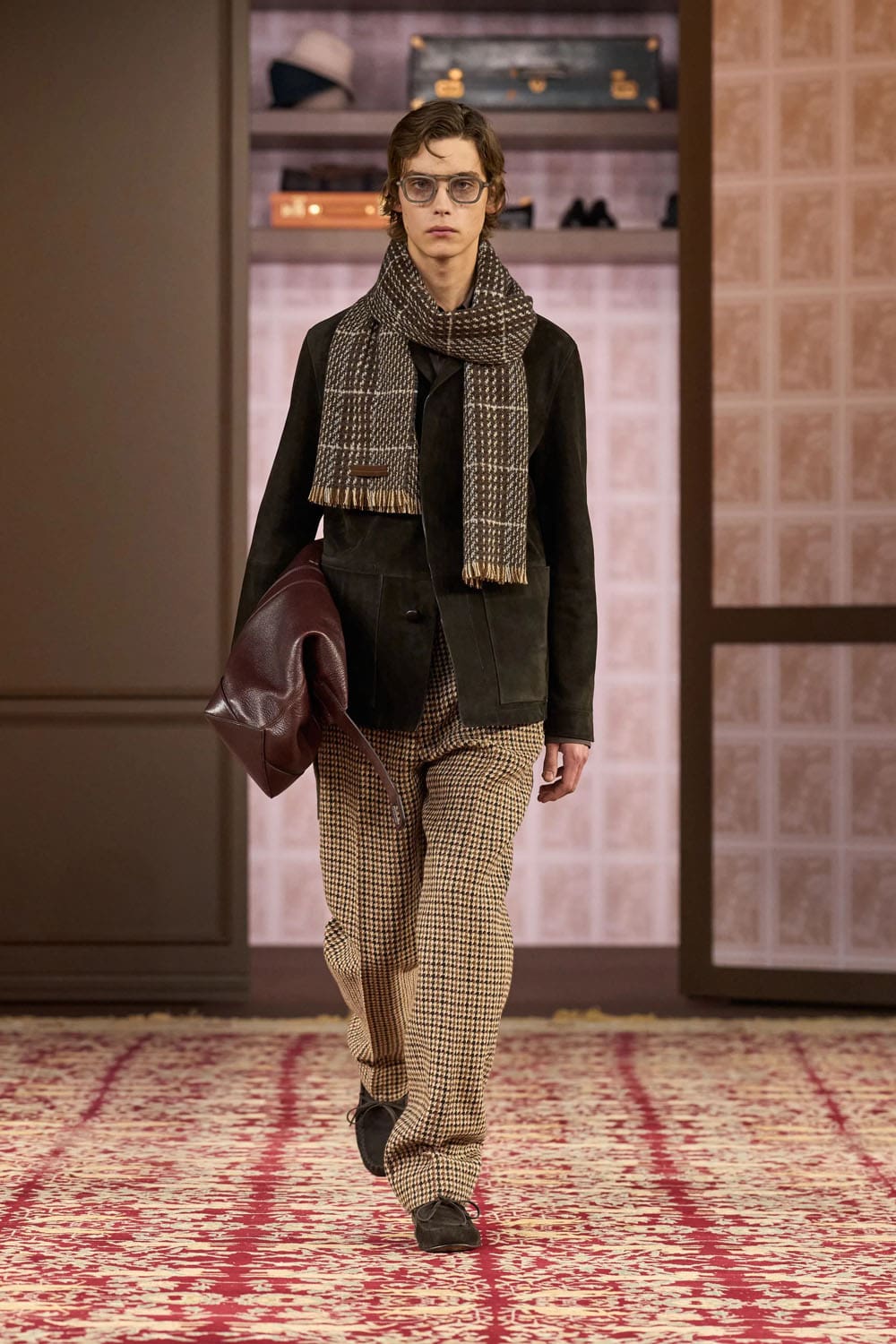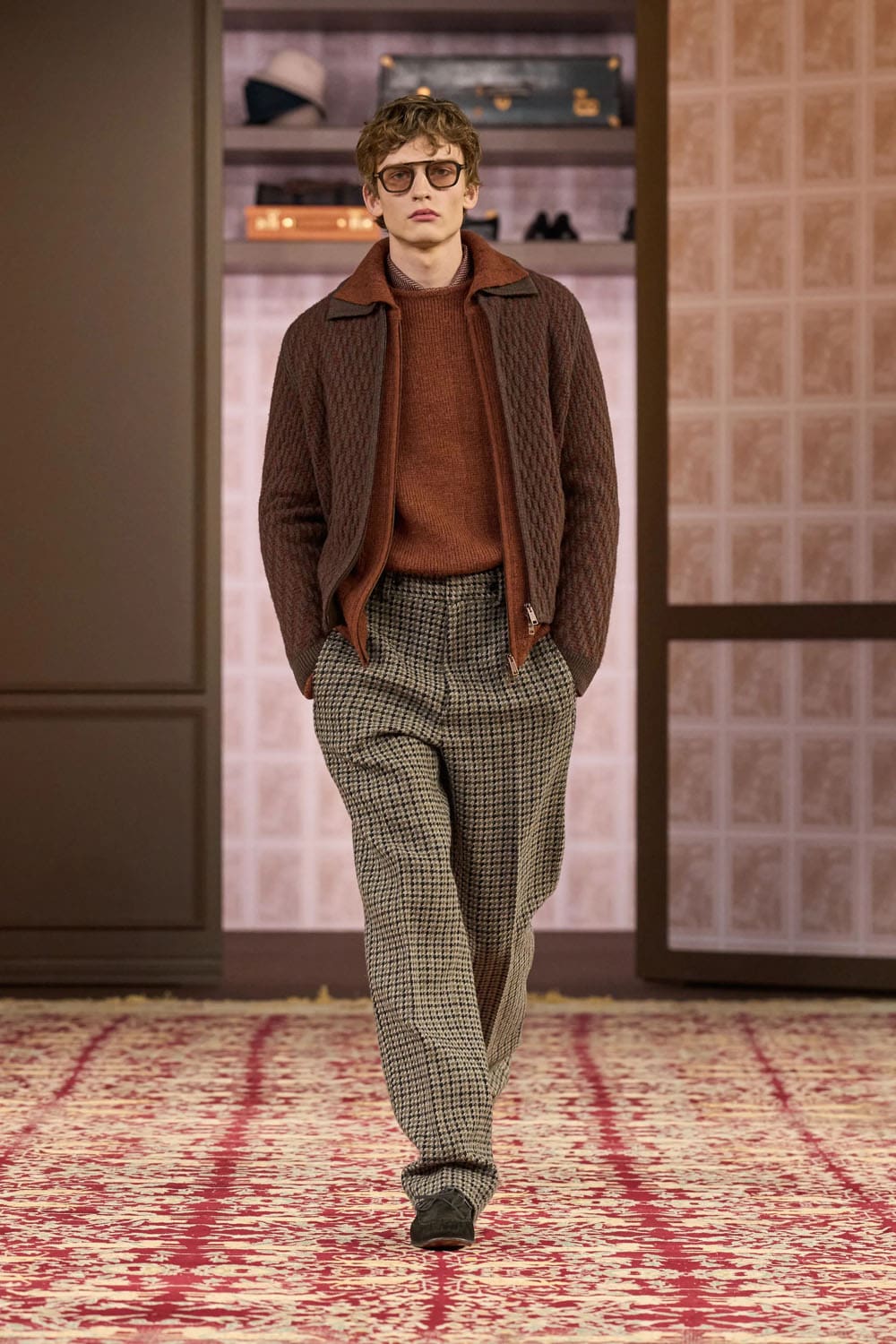 Winter 2026 marked a notable shift in Sartori’s stylistic language. Gone was the focus on ultra-refined semi-formalwear; in its place, an embrace of character-driven silhouettes and historical cues. 1970s cardigan coats in heavy checks. Deep russets and chocolate browns. Broken box pleats recalling the Tirolean loden coats of northern Italy.